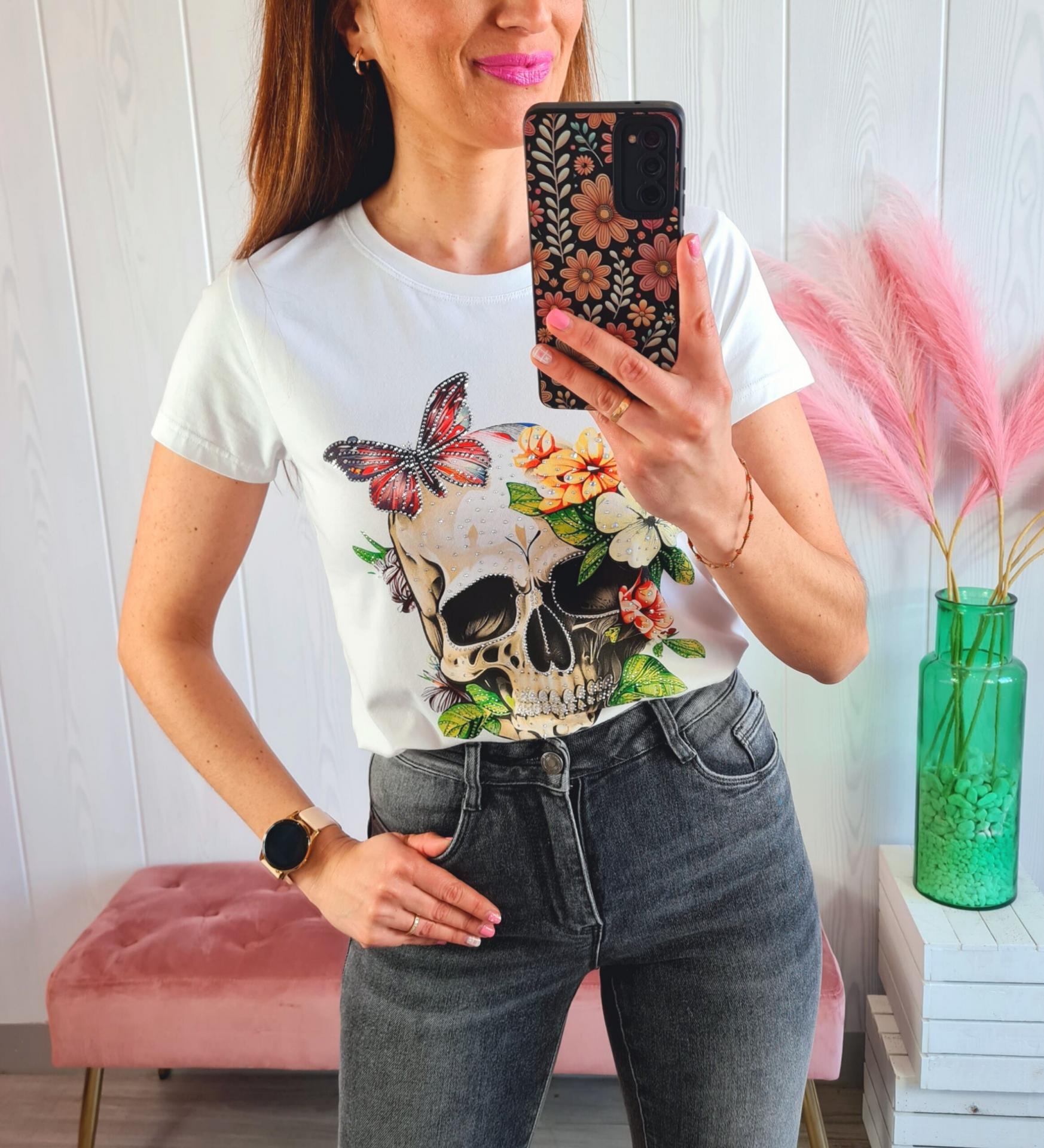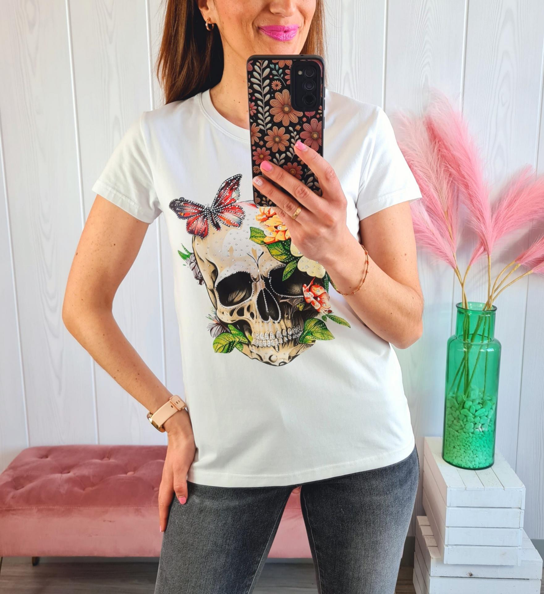 Camiseta de color blanco con estampado impreso en el pecho y tachas de adorno, cuello redondo y manga corta.