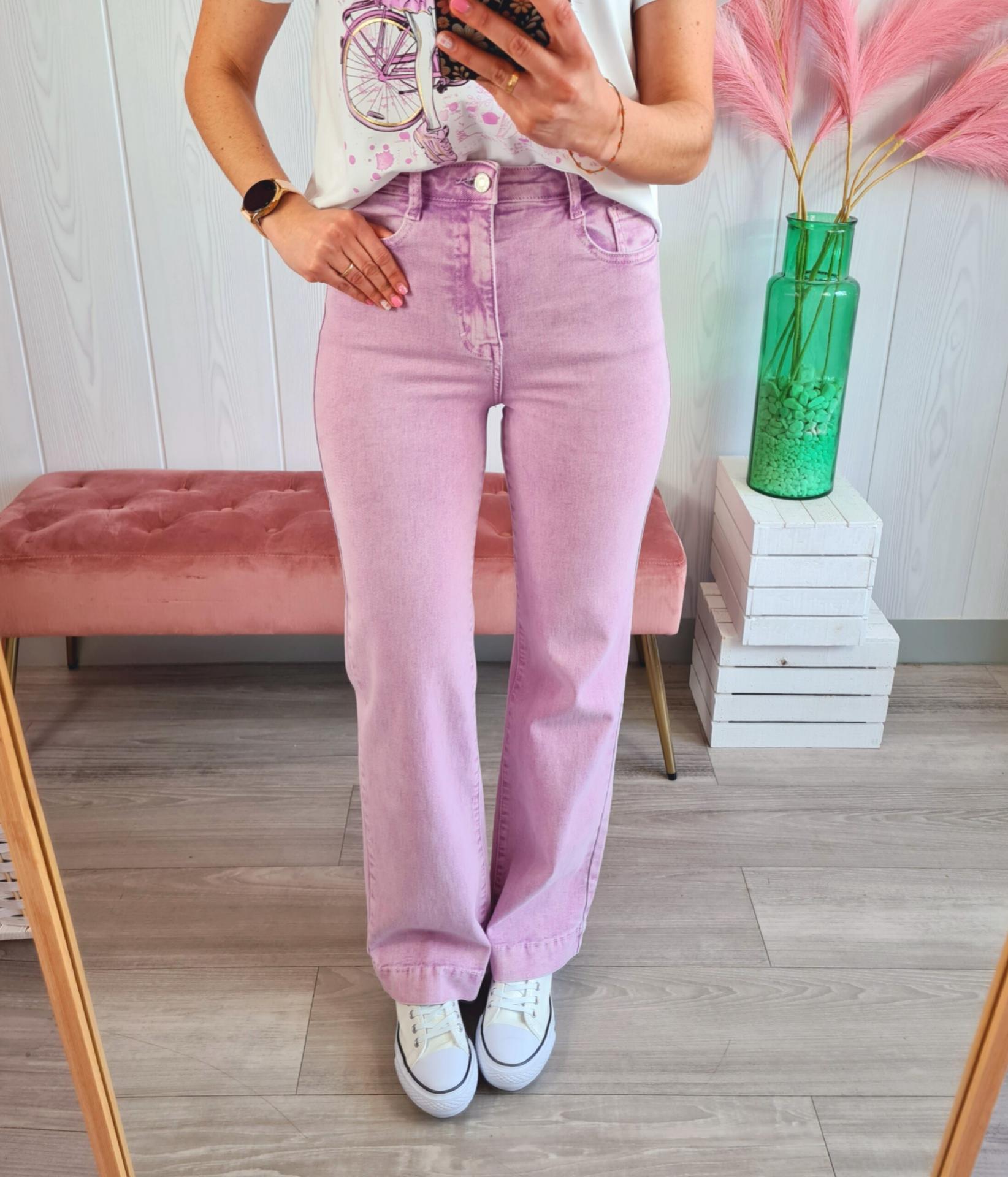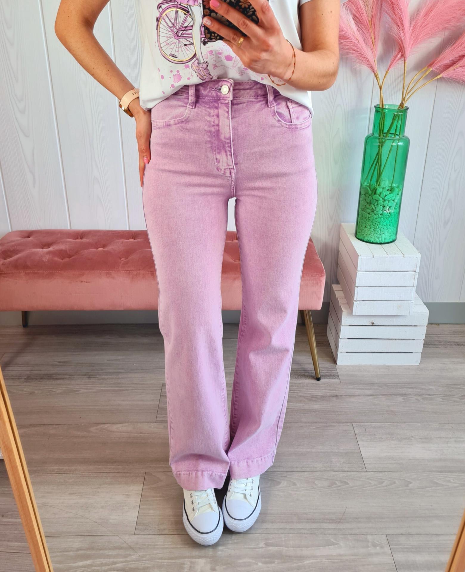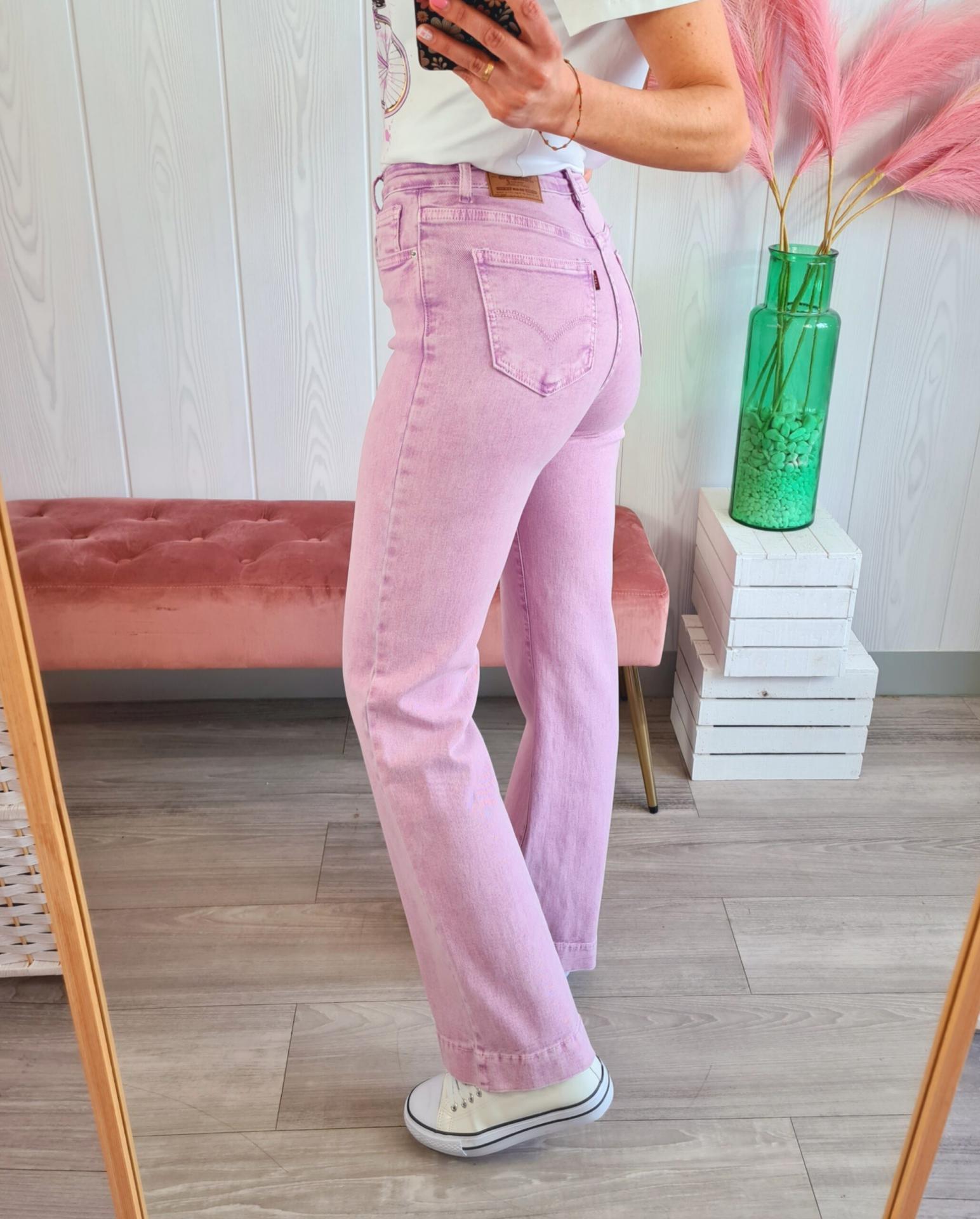 Pantalón vaquero de estilo acampanado en color lila. Tiene cierre con botón y cremallera.