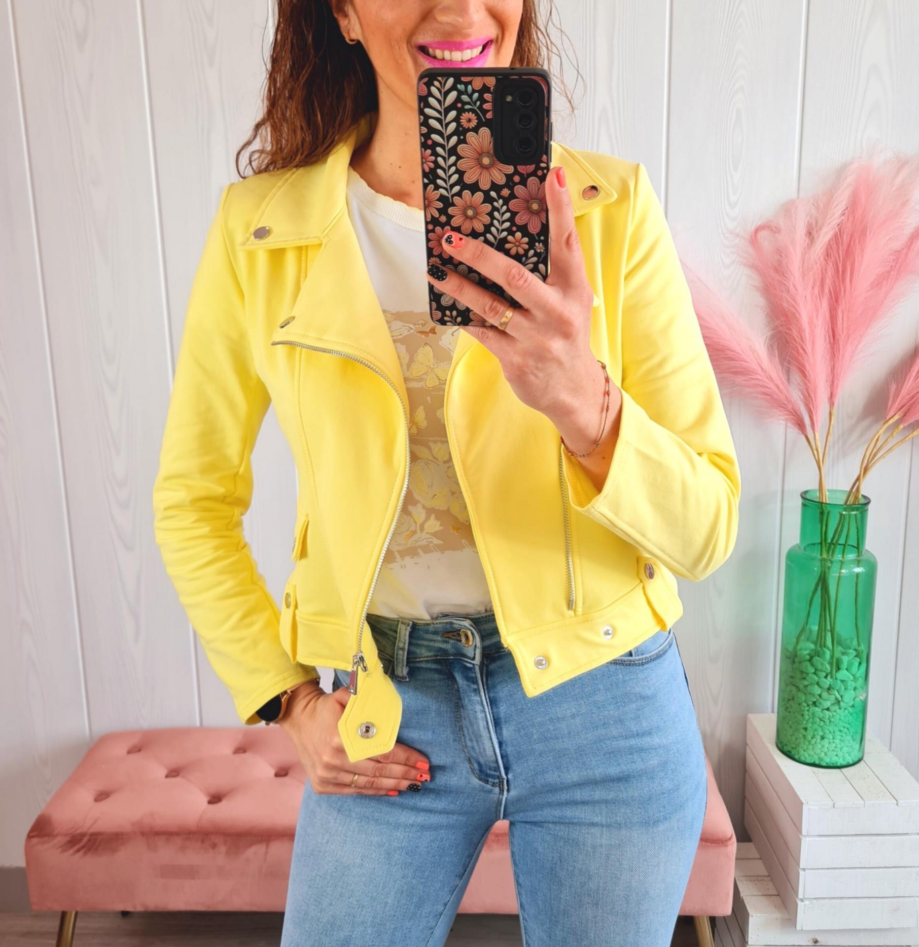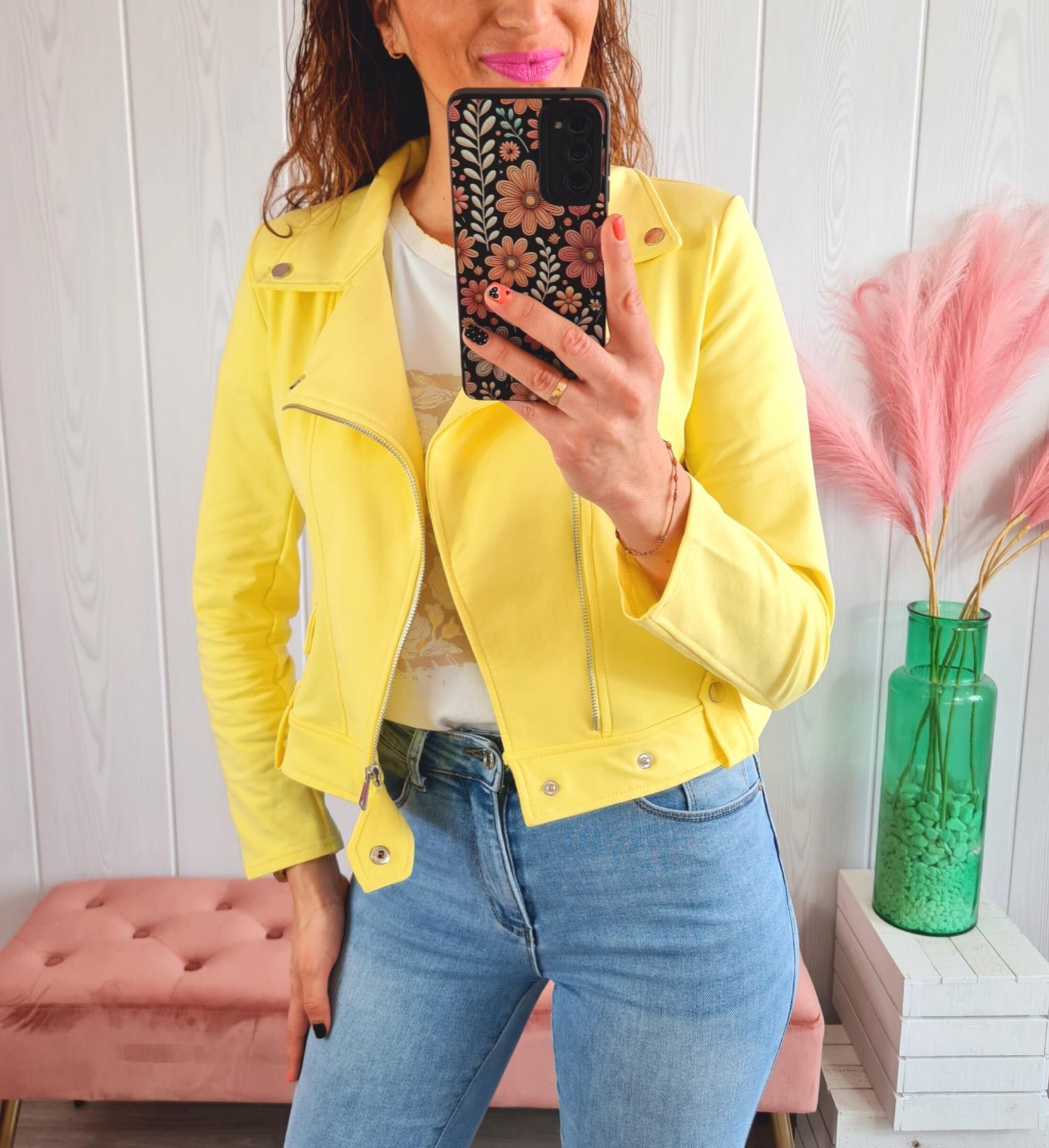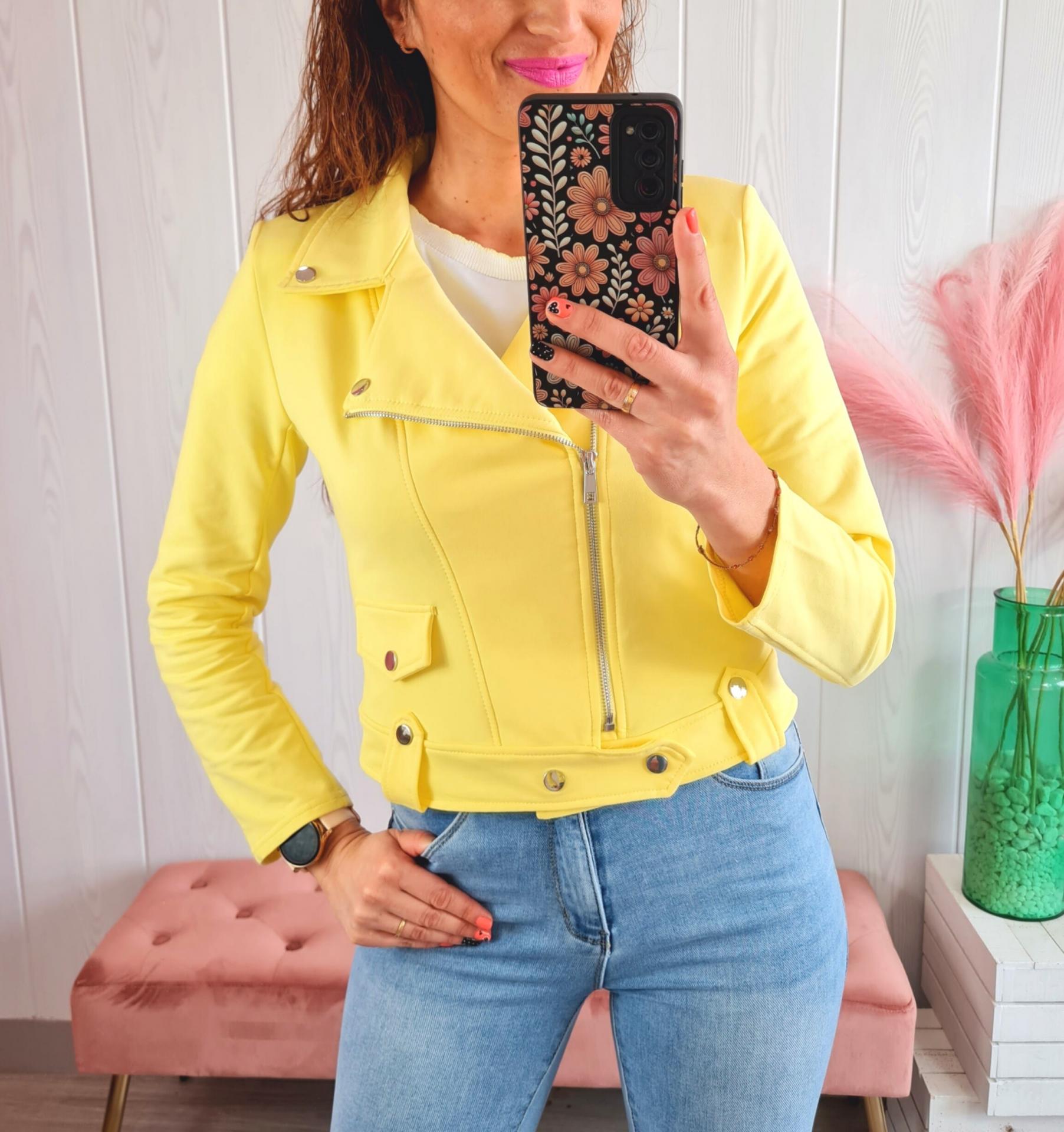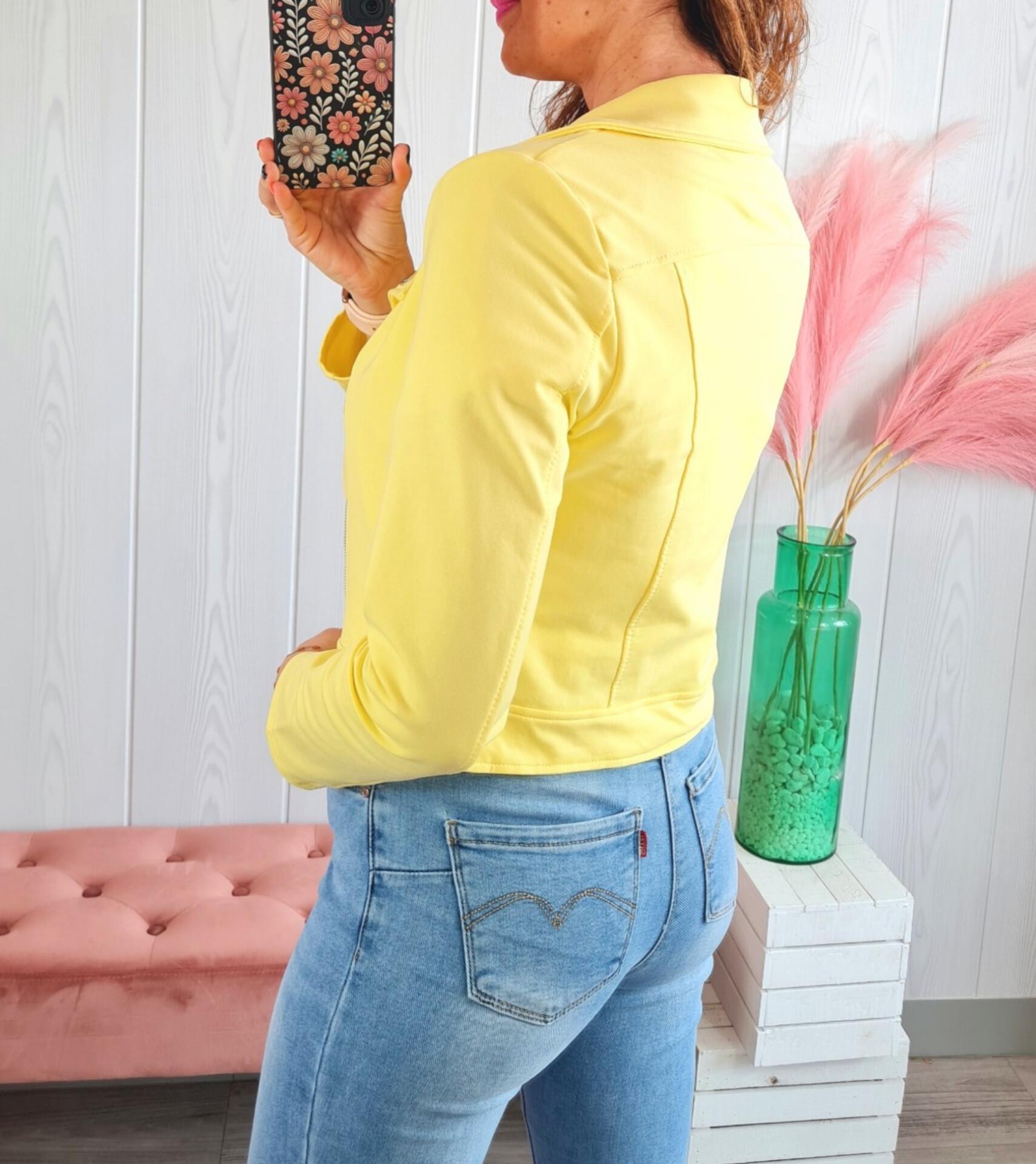 Chaqueta estilo biker en color amarillo. Tiene cierre mediante cremallera. No tiene forro interior.