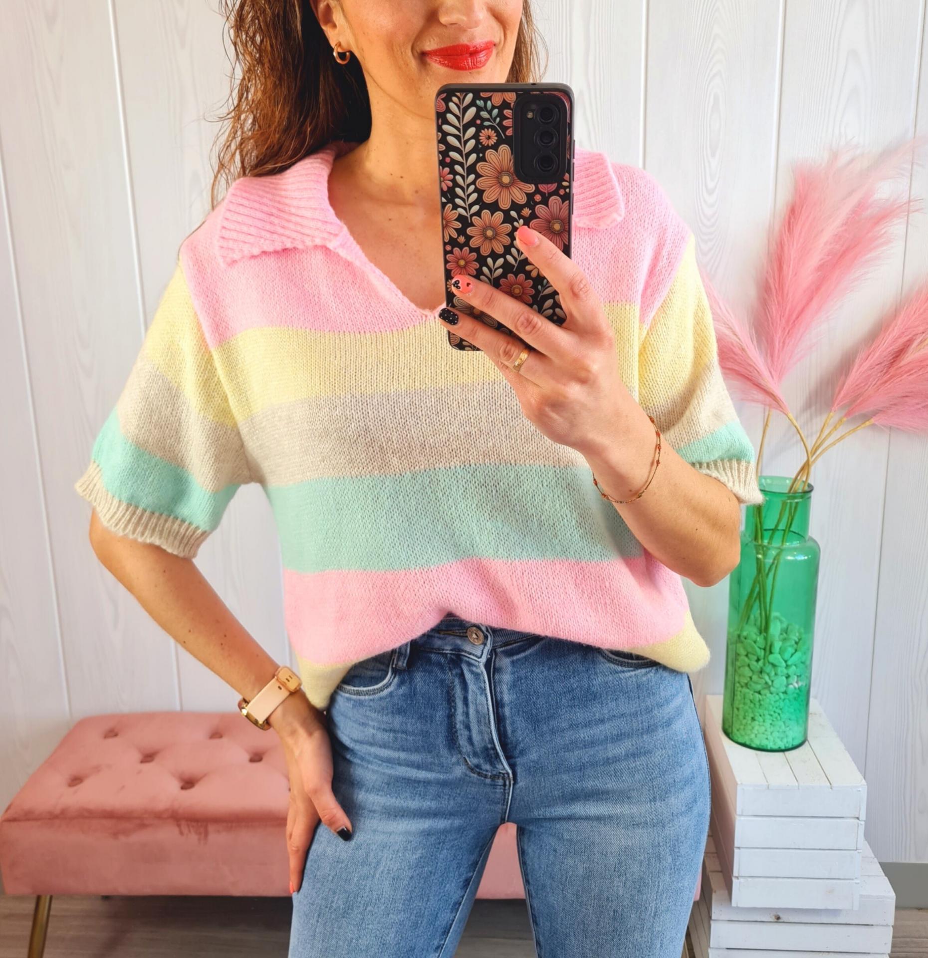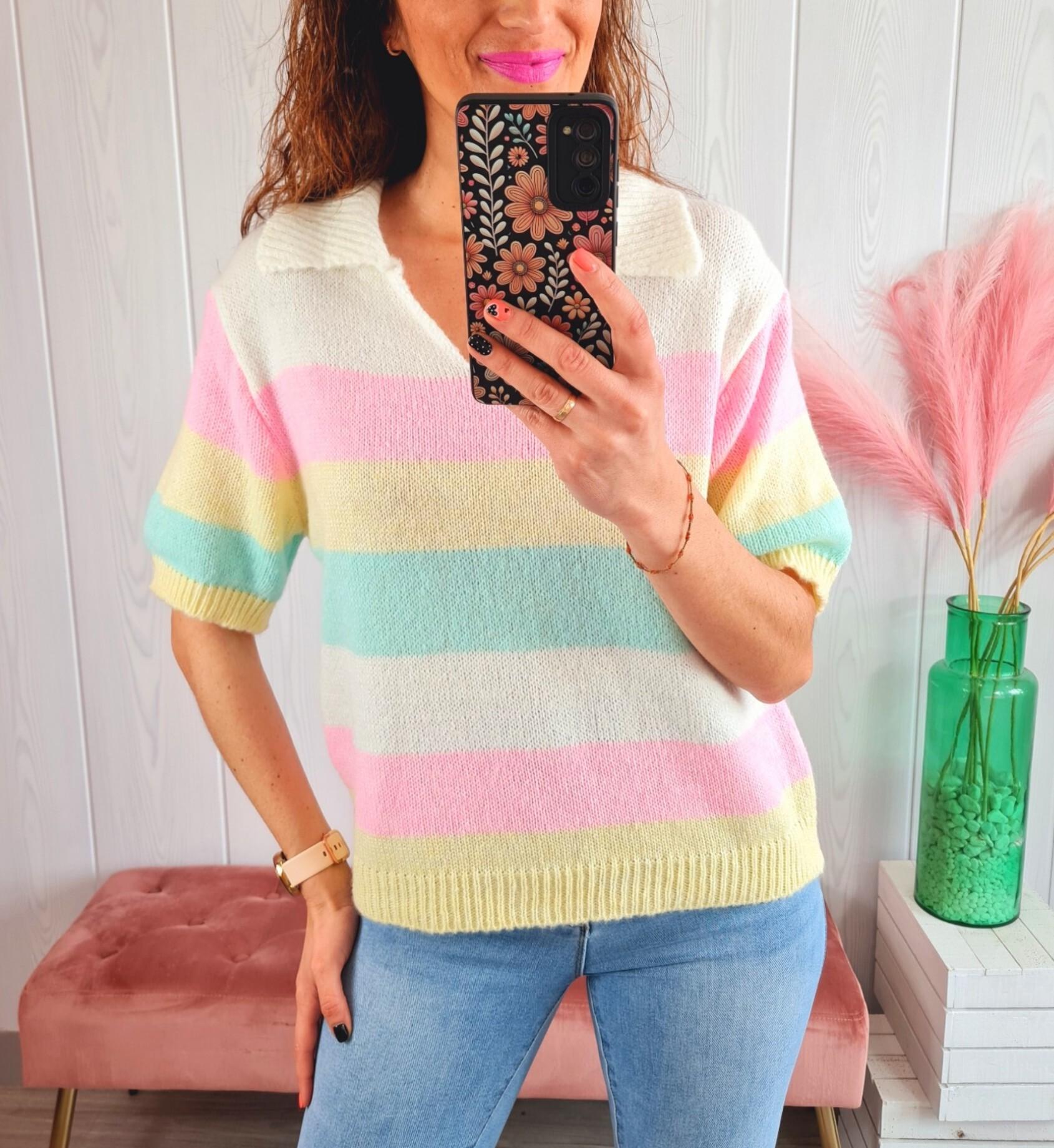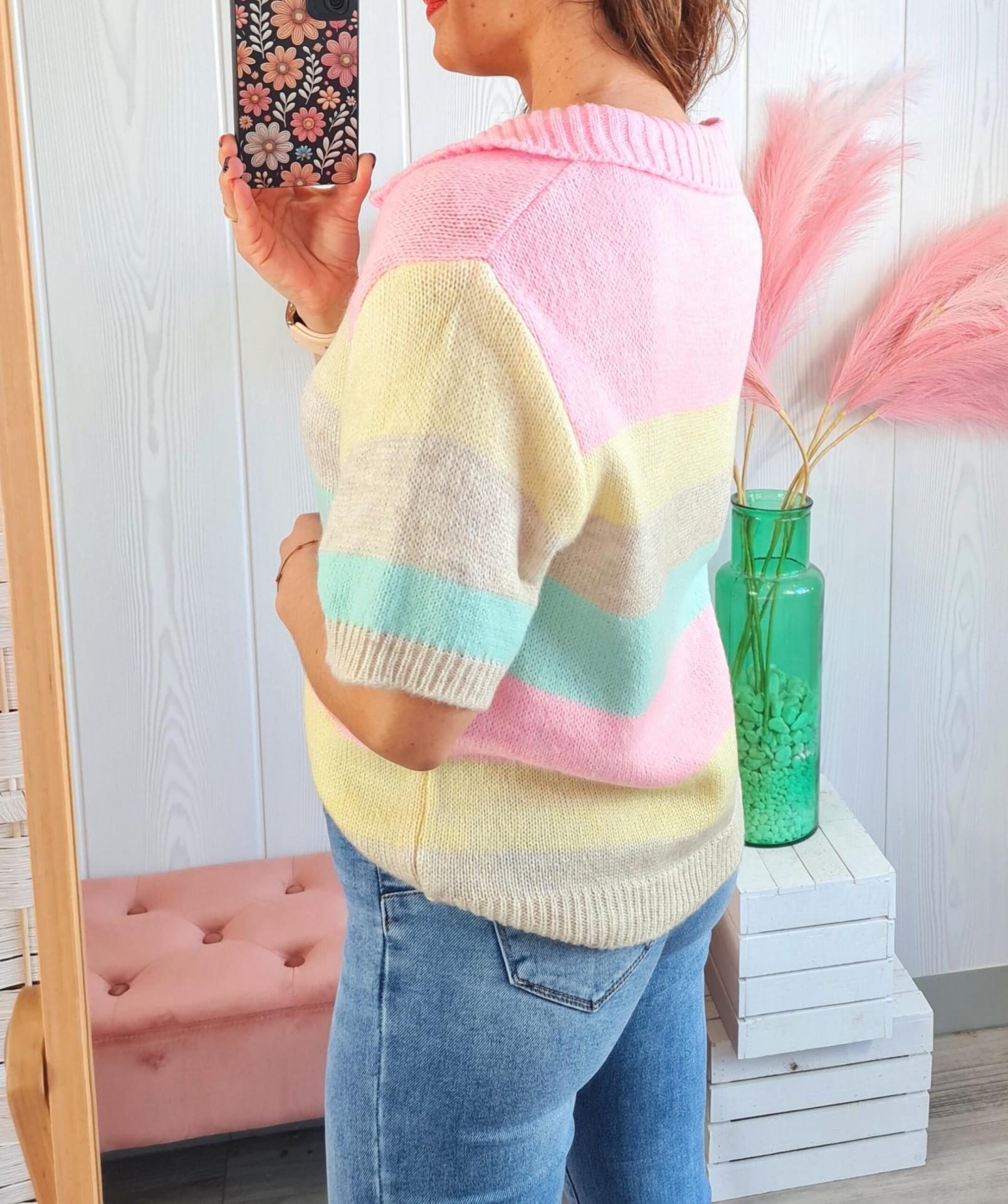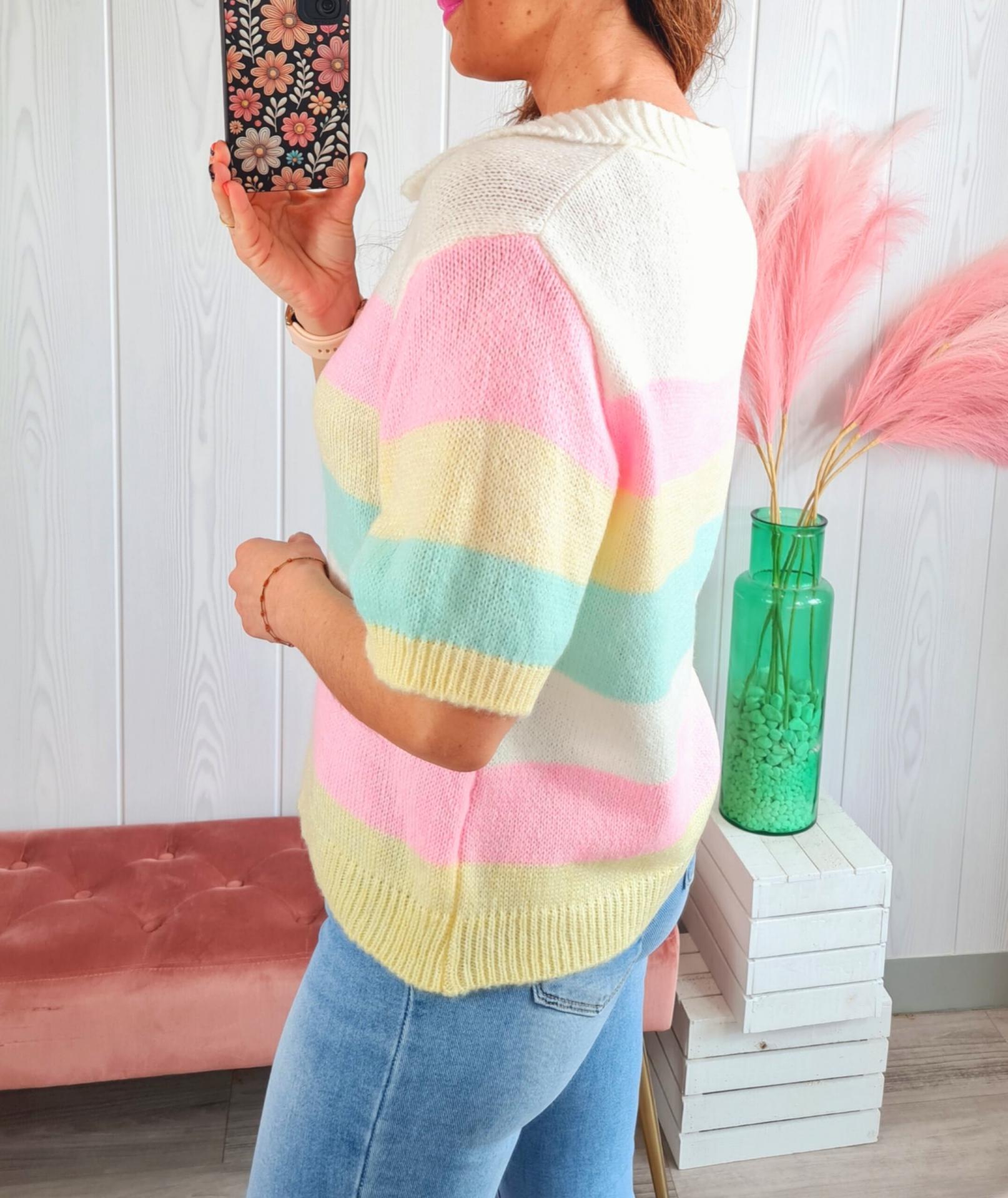 Jersey de rayas de colores, manga corta y cuello de polo.