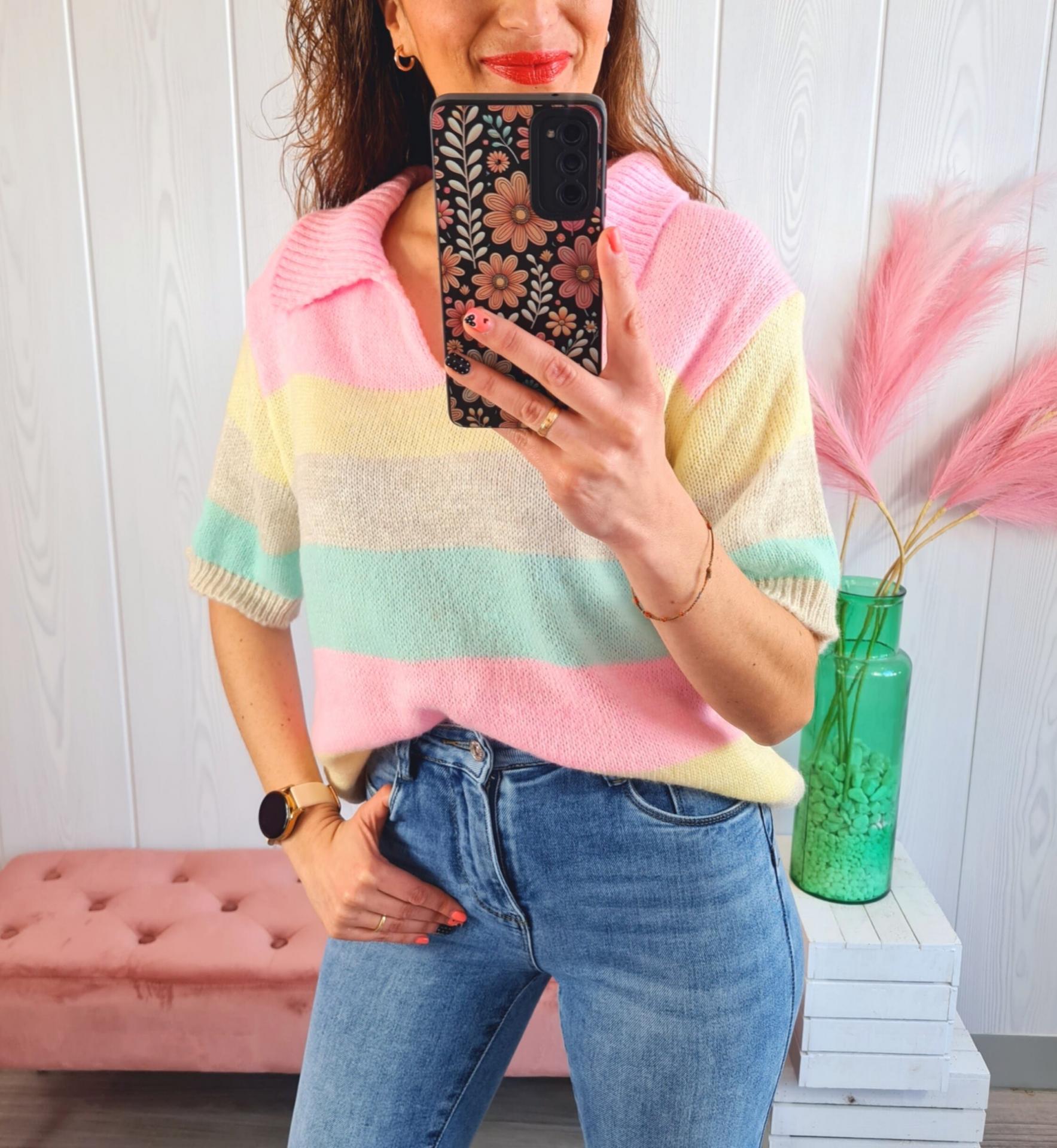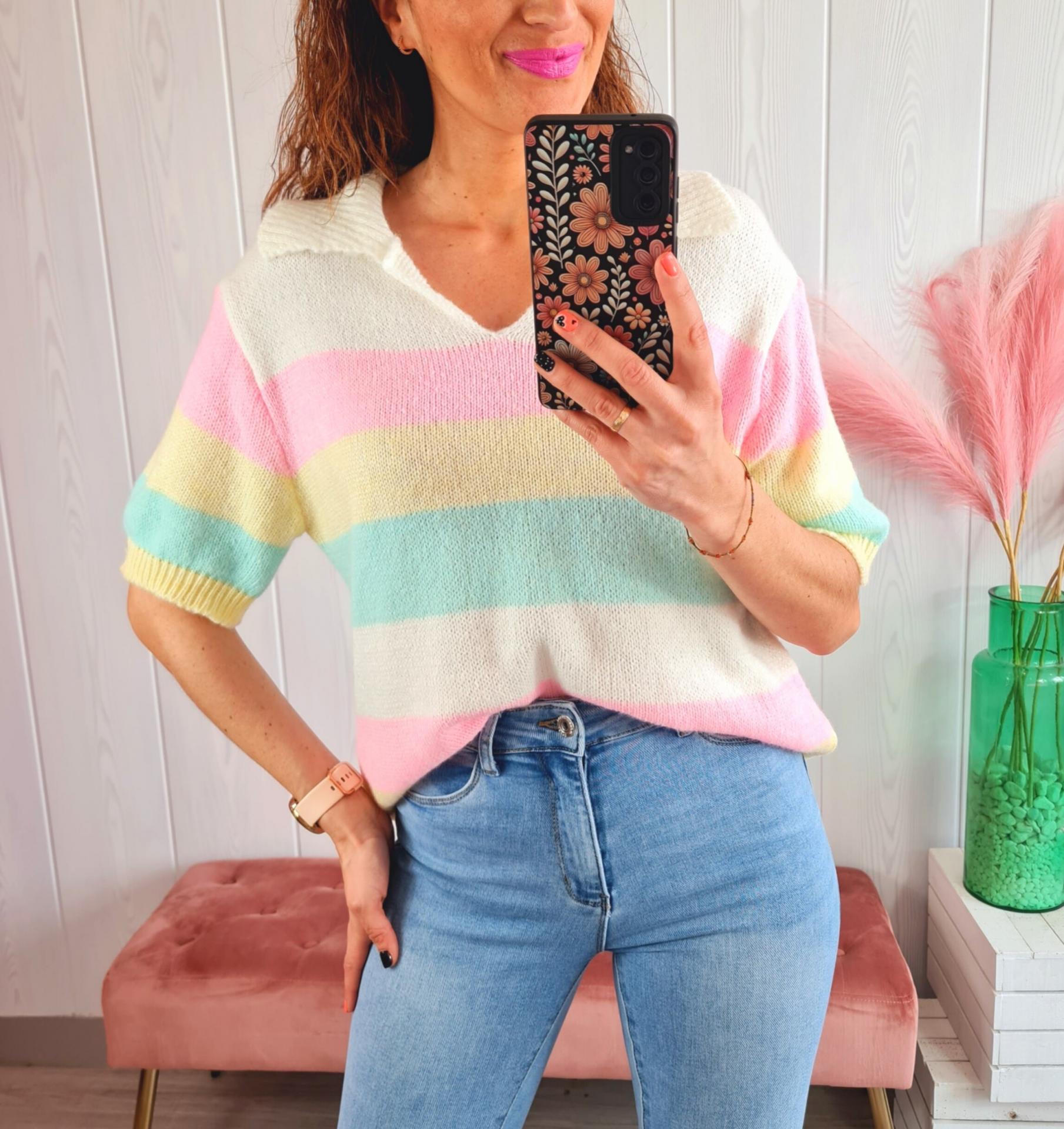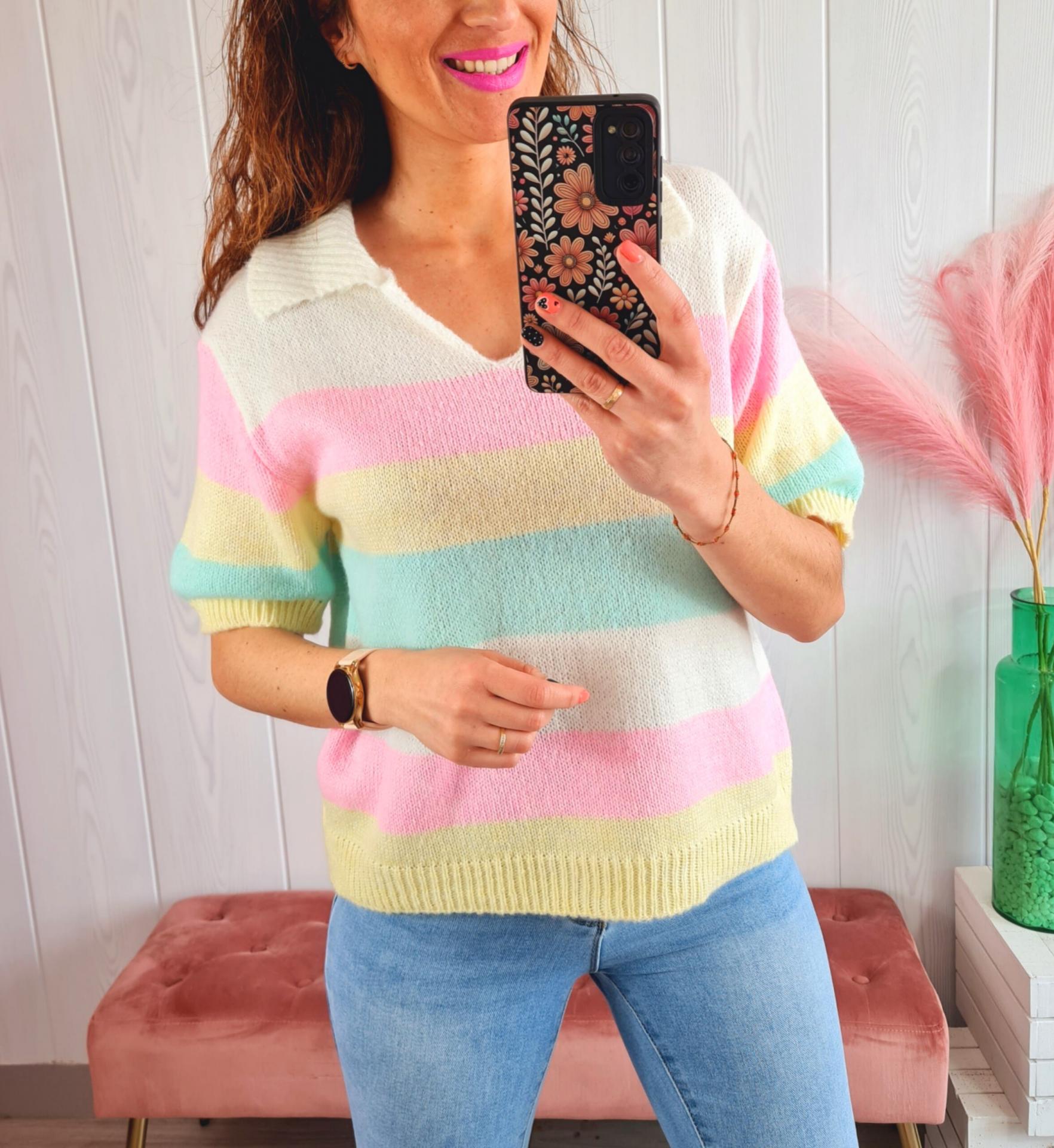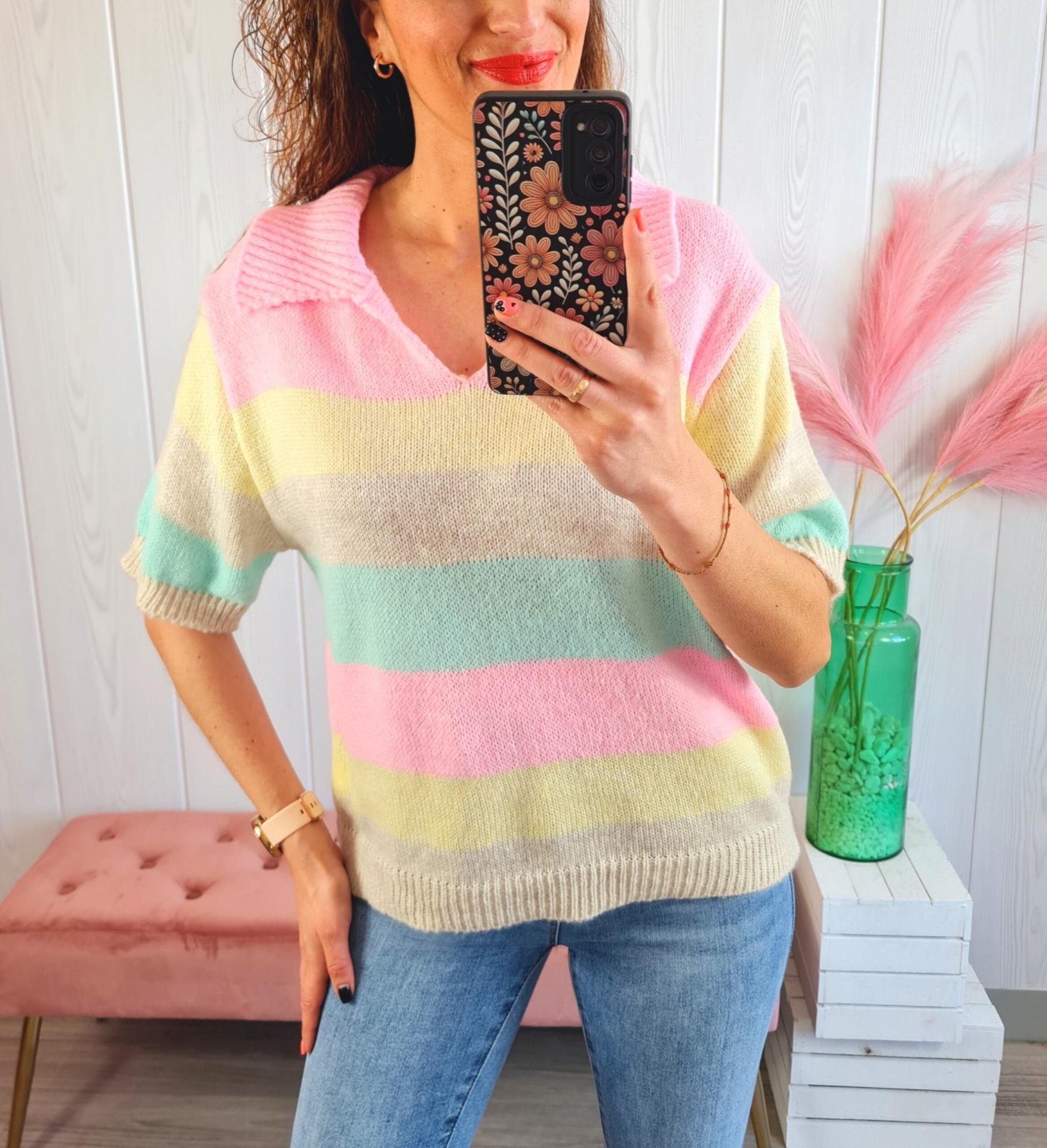 Jersey de rayas de colores, manga corta y cuello de polo.