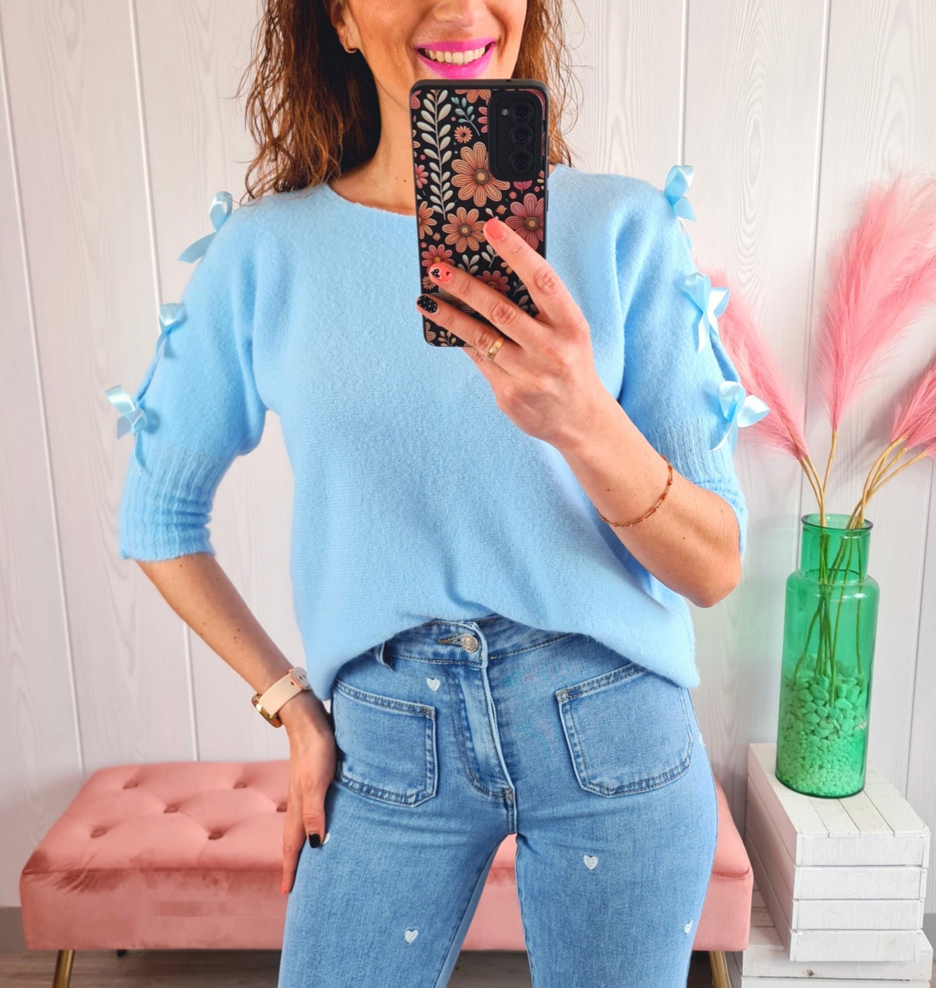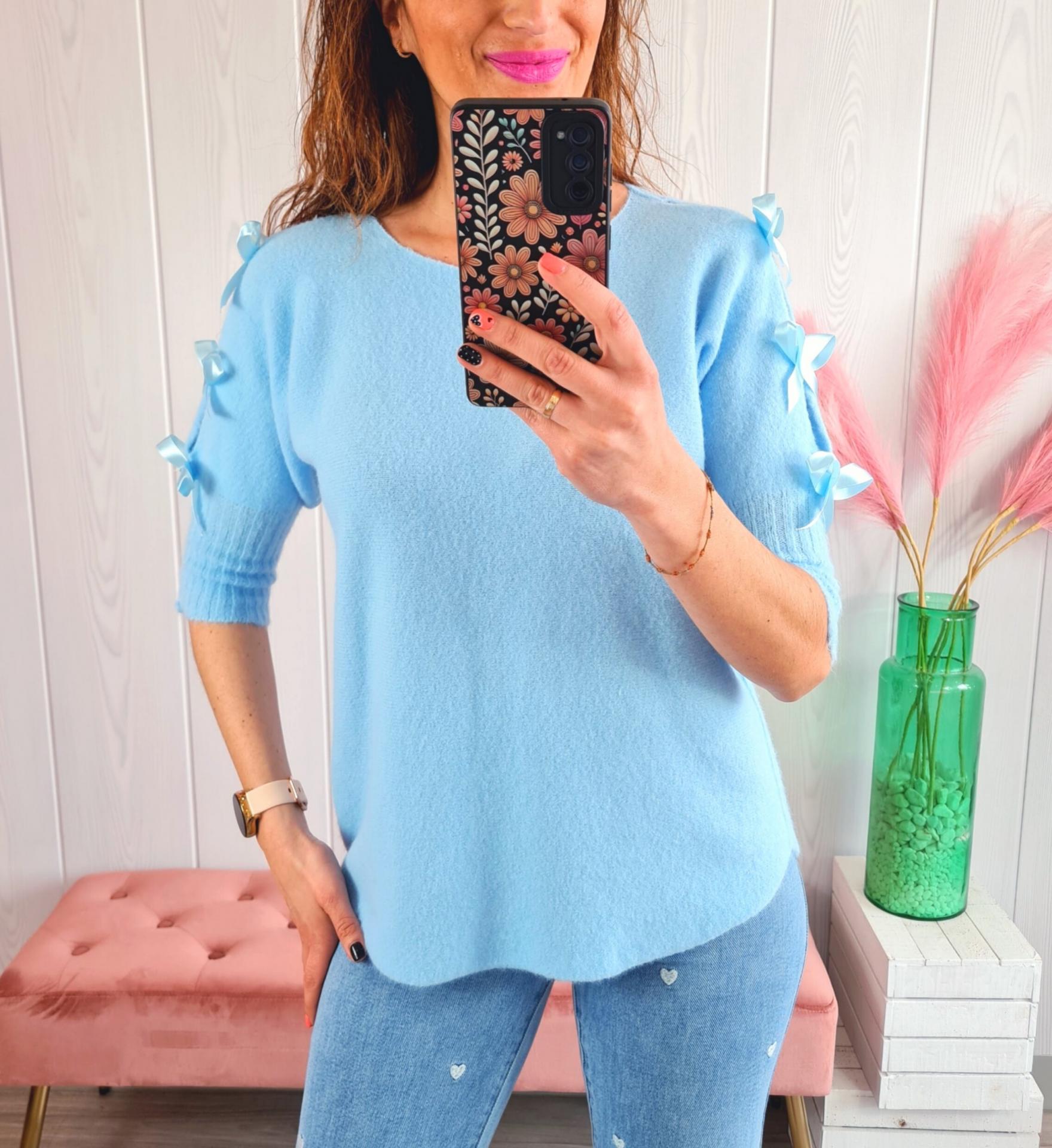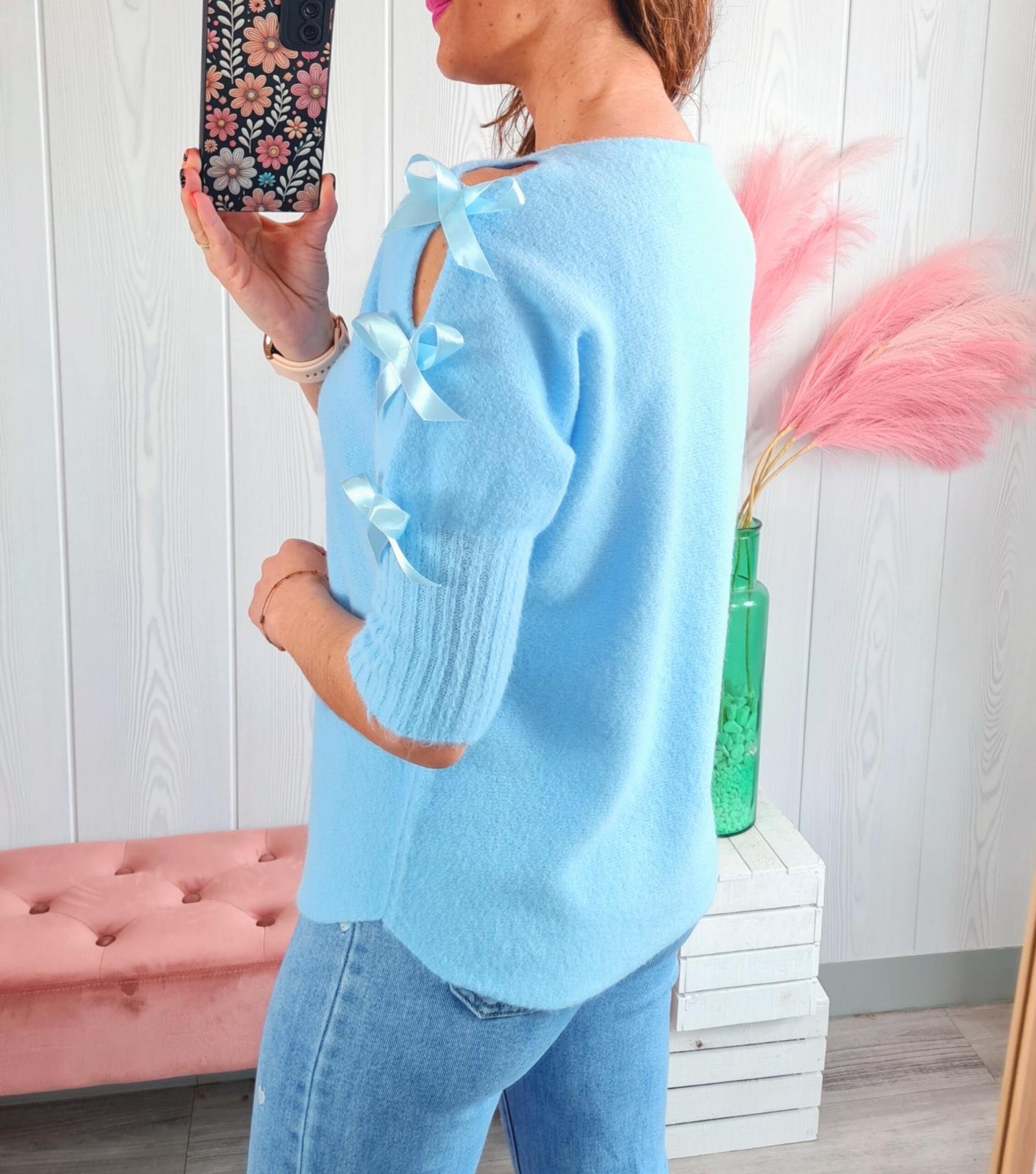Jersey de color azul celeste. Tiene cuello abierto, manga por el codo adornada con lazos de raso en el mismo color del jersey.