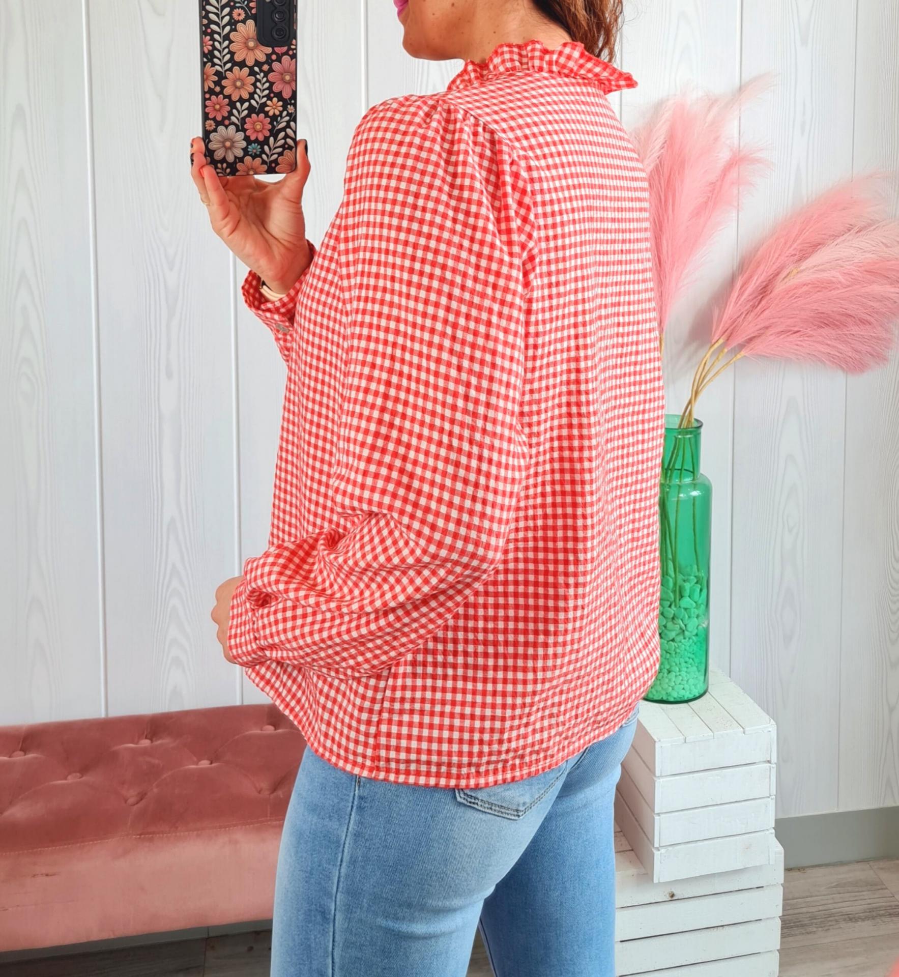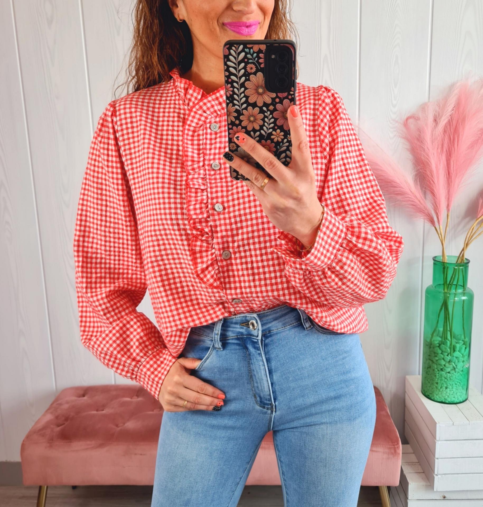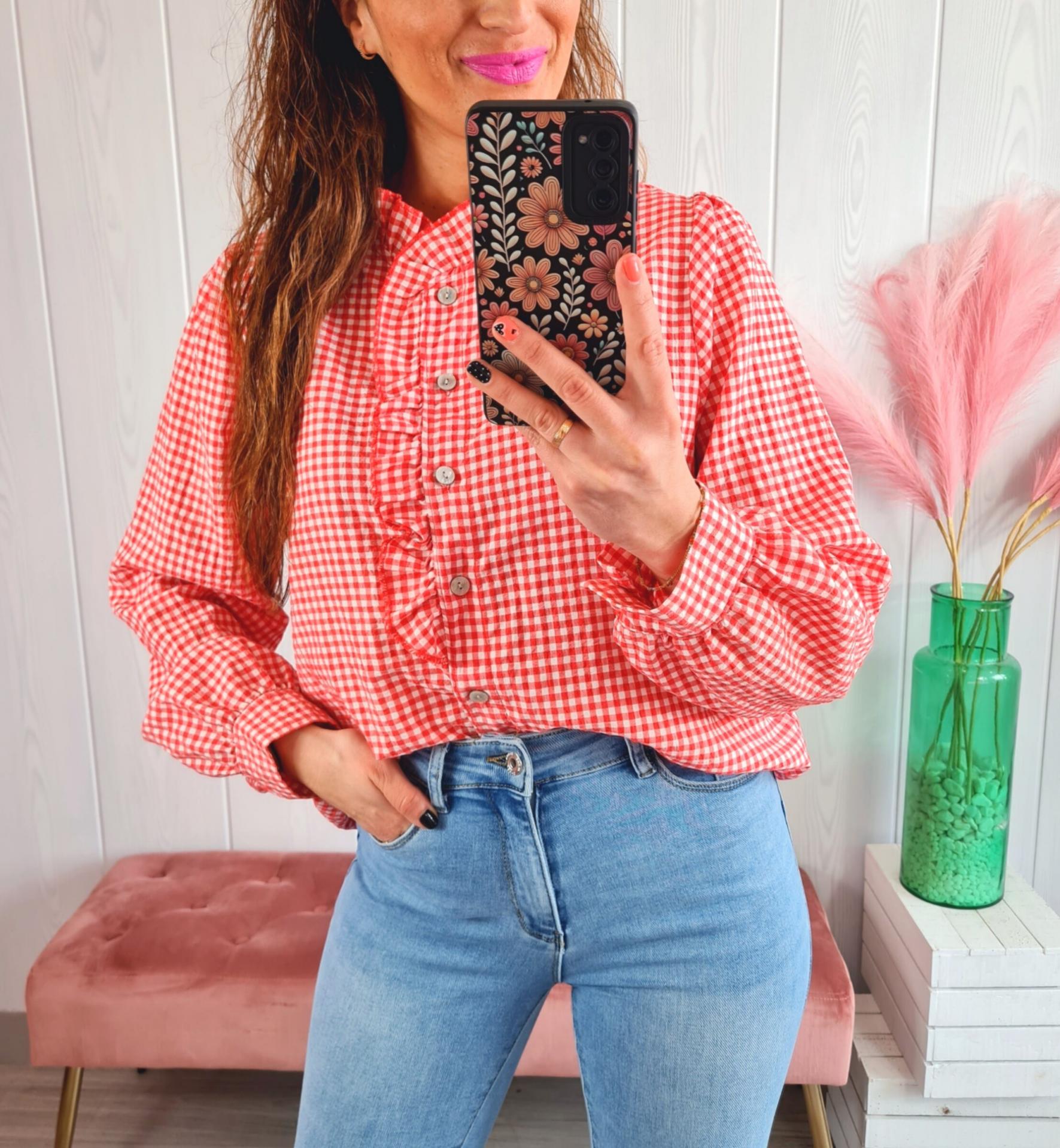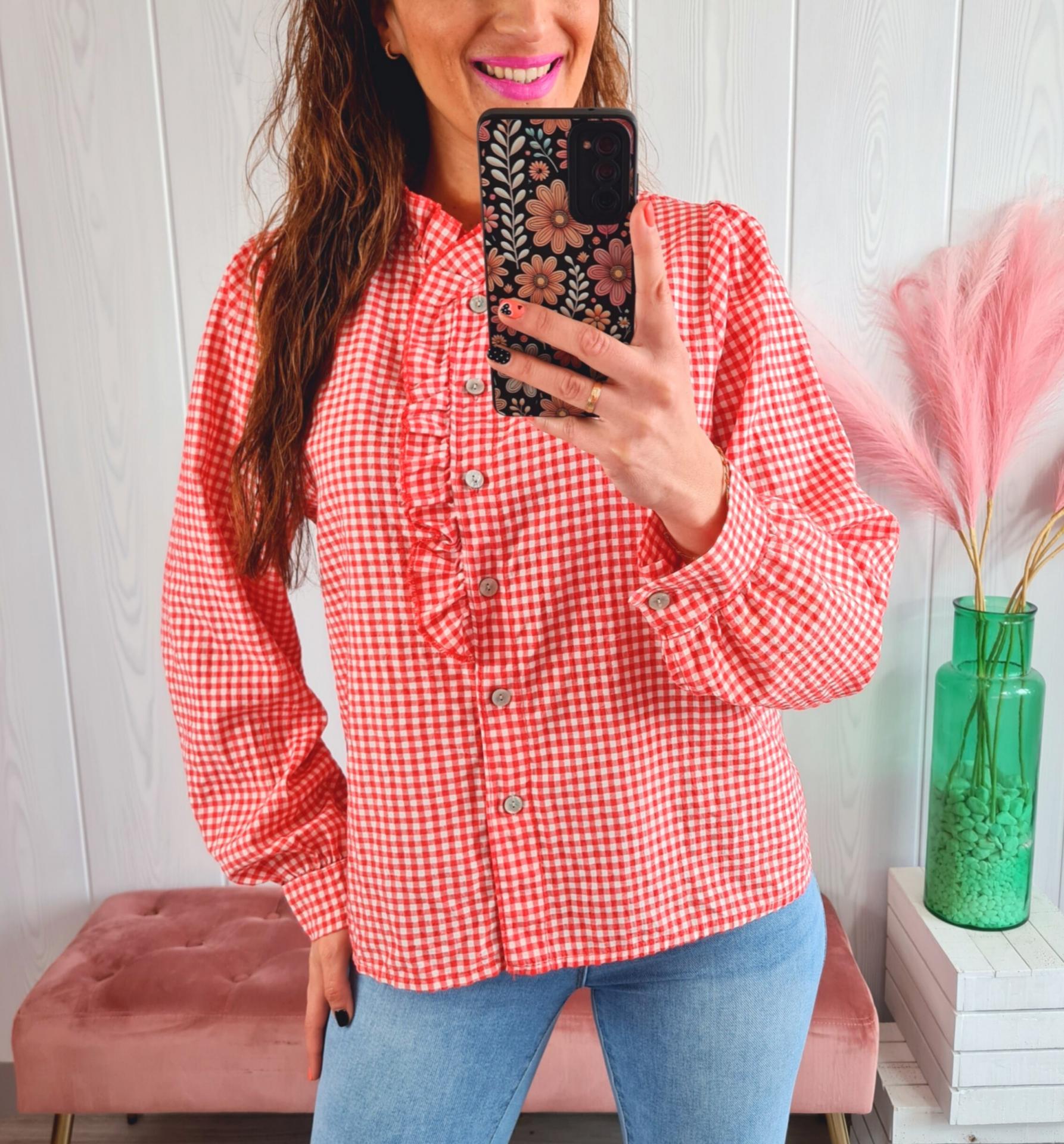 Camisa de cuadros vichy de color blanco y rojo, manga larga, abotonada en el pecho con volante de adorno.