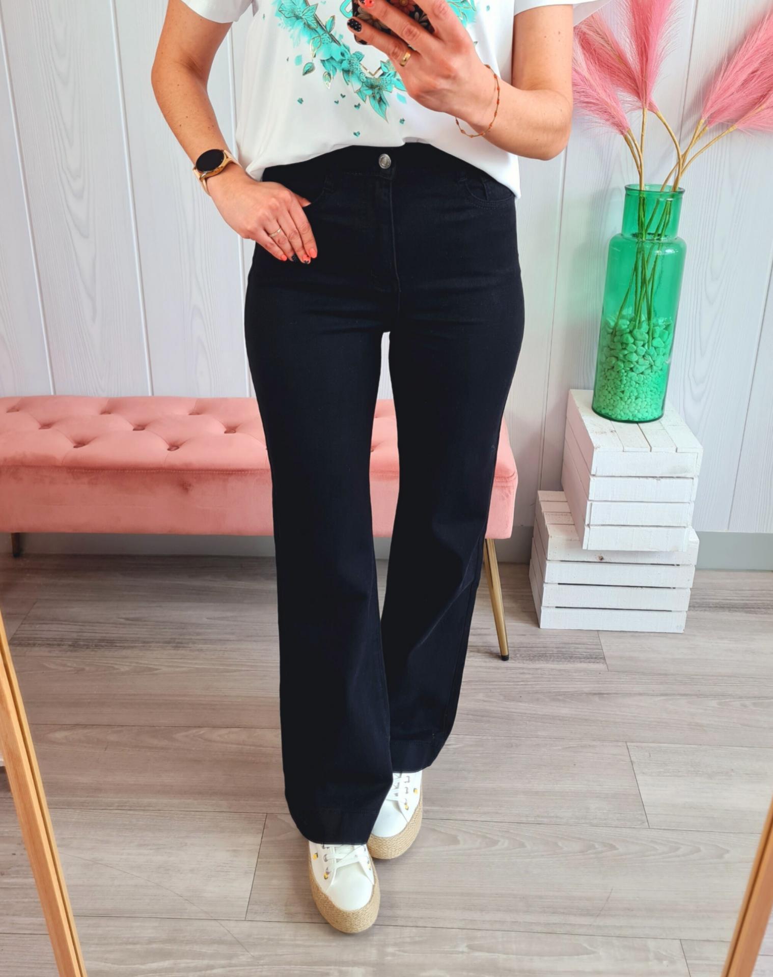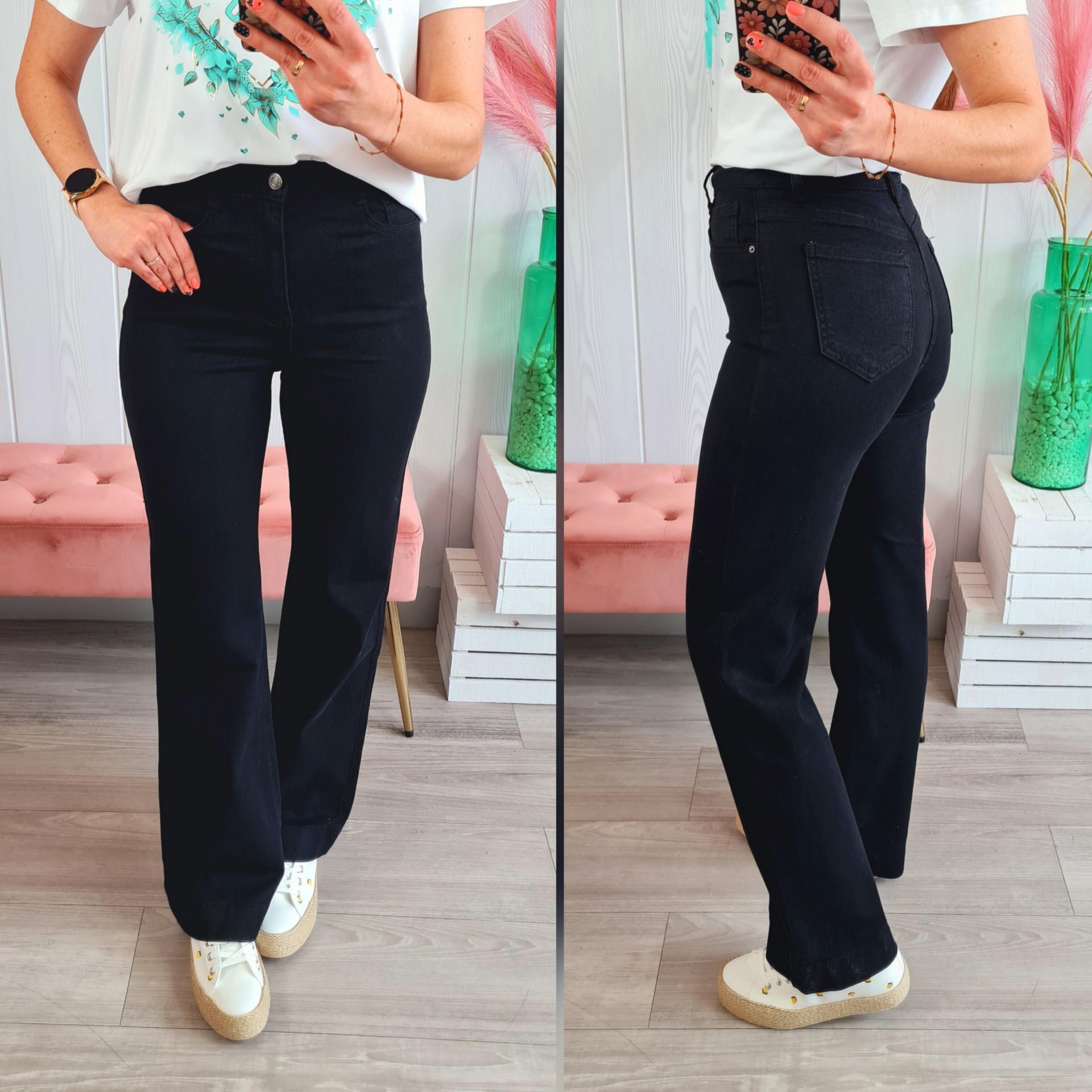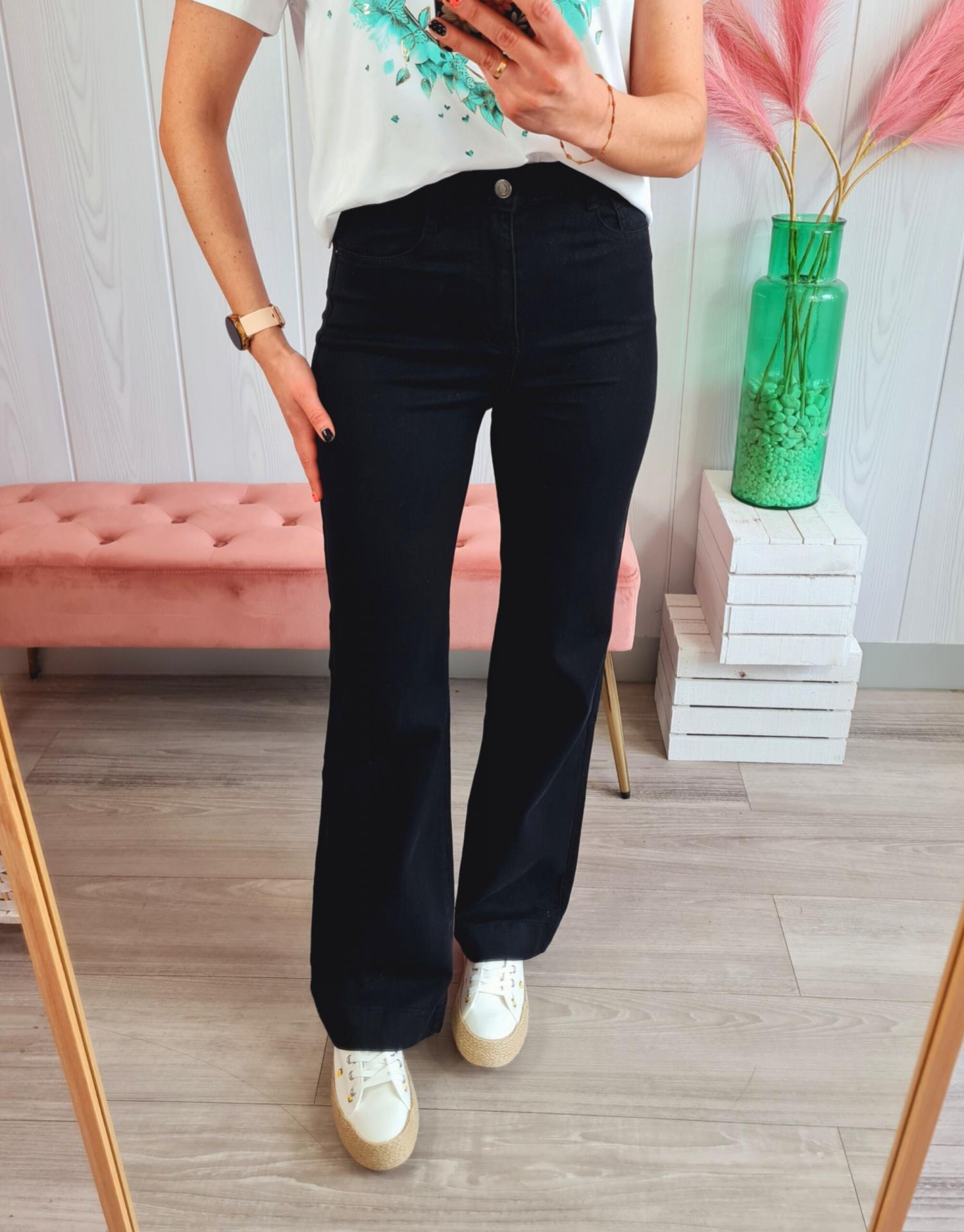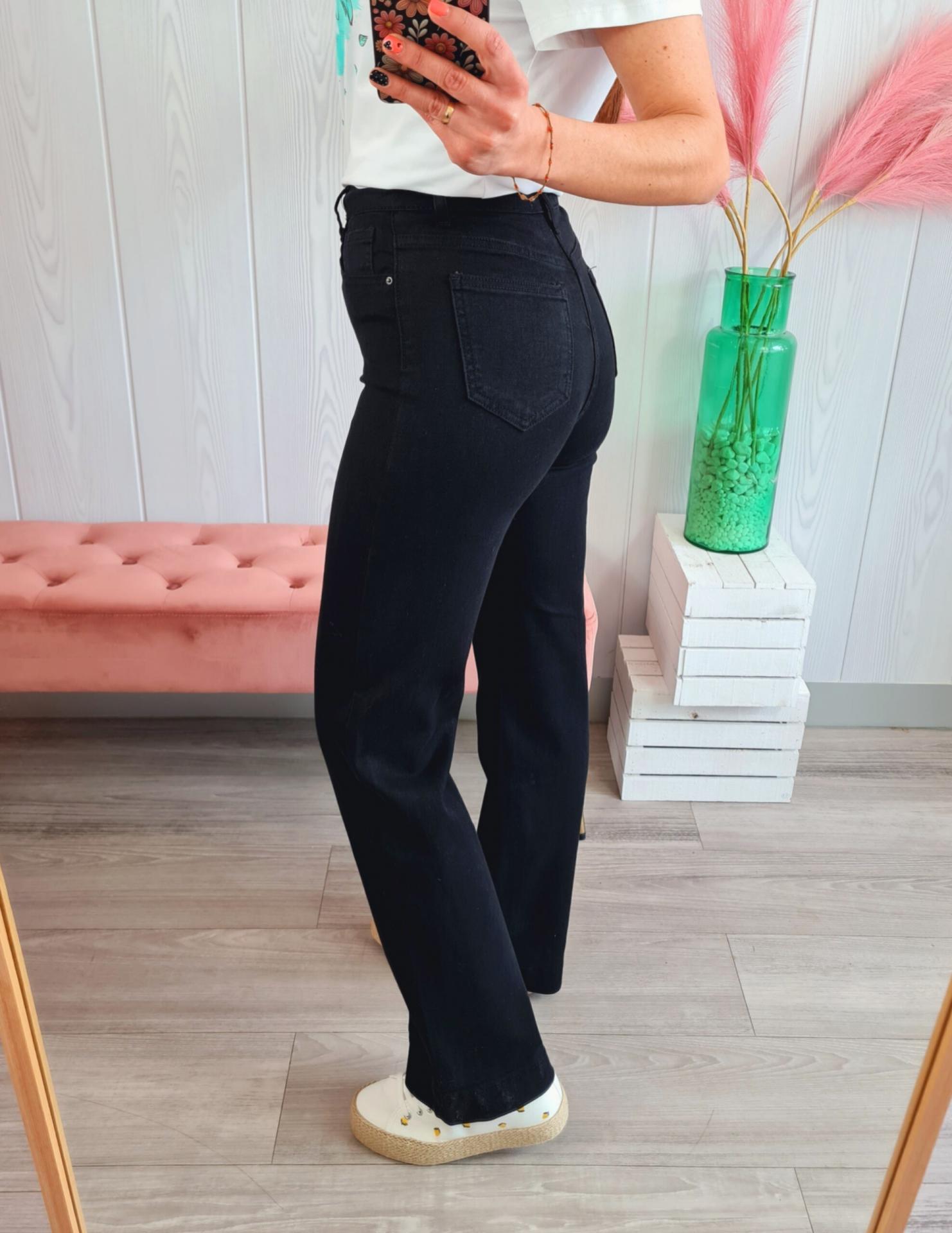Pantalón vaquero de estilo wide leg en color negro. Tiene cierre con botón y cremallera y bolsillos laterales.