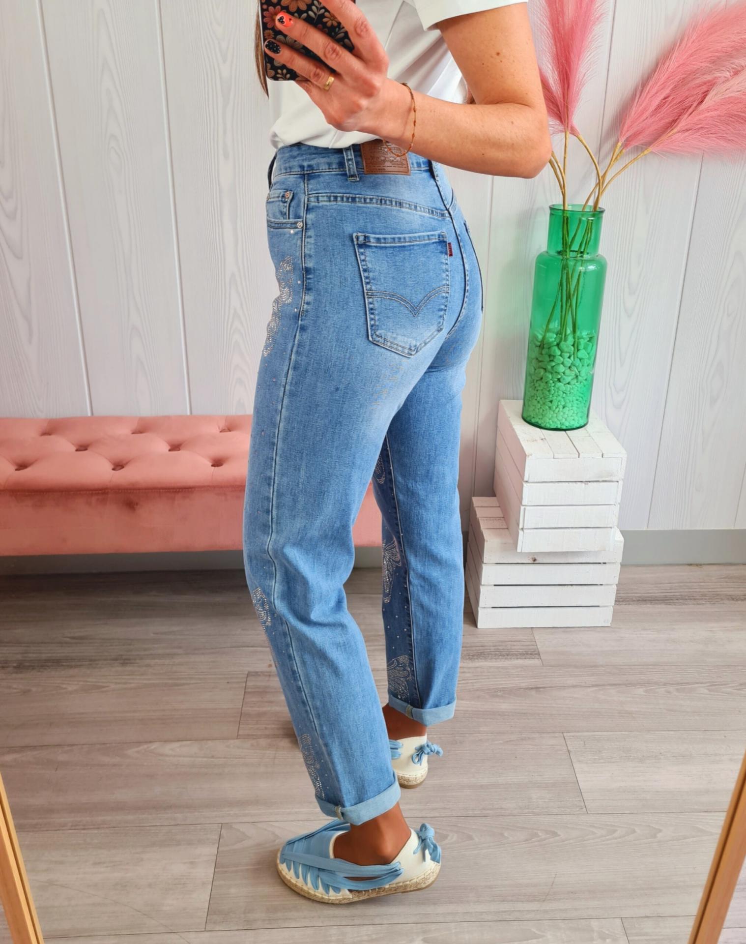 Pantalón vaquero de color clarito, estilo mom fit, con estampado de tachas con forma de mariposas en la parte frontal. Tiene cierre con botón y cremallera.