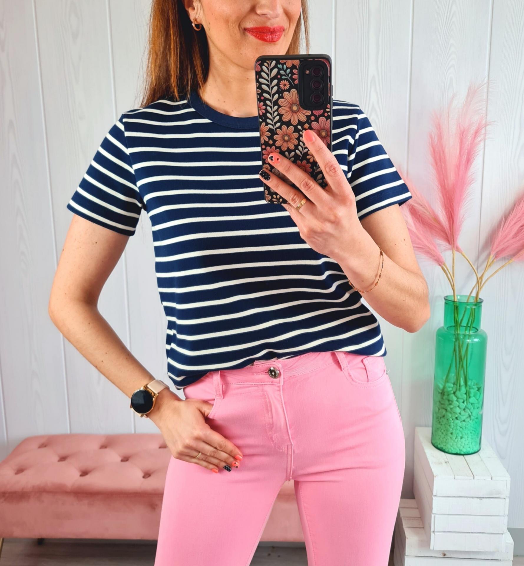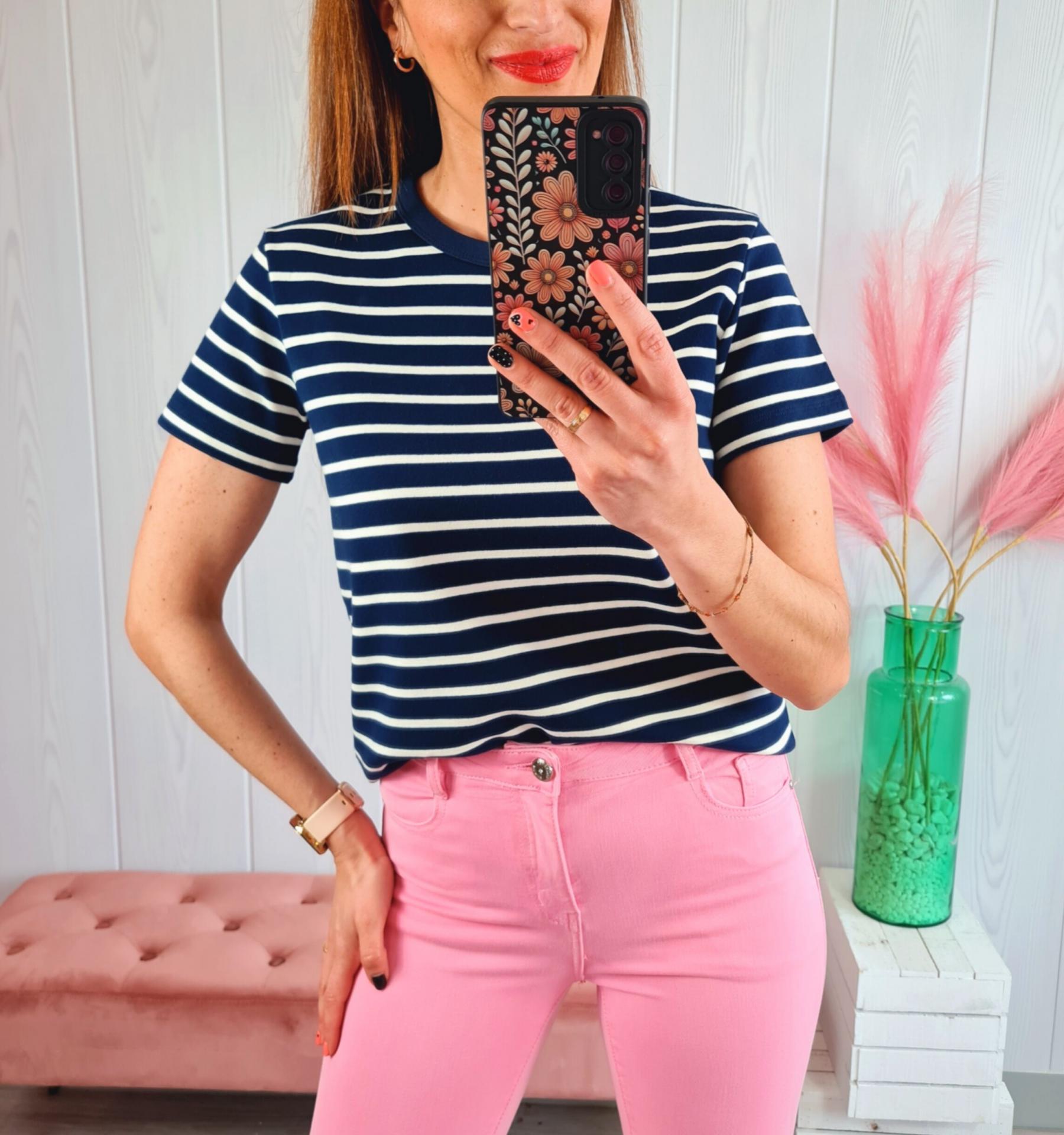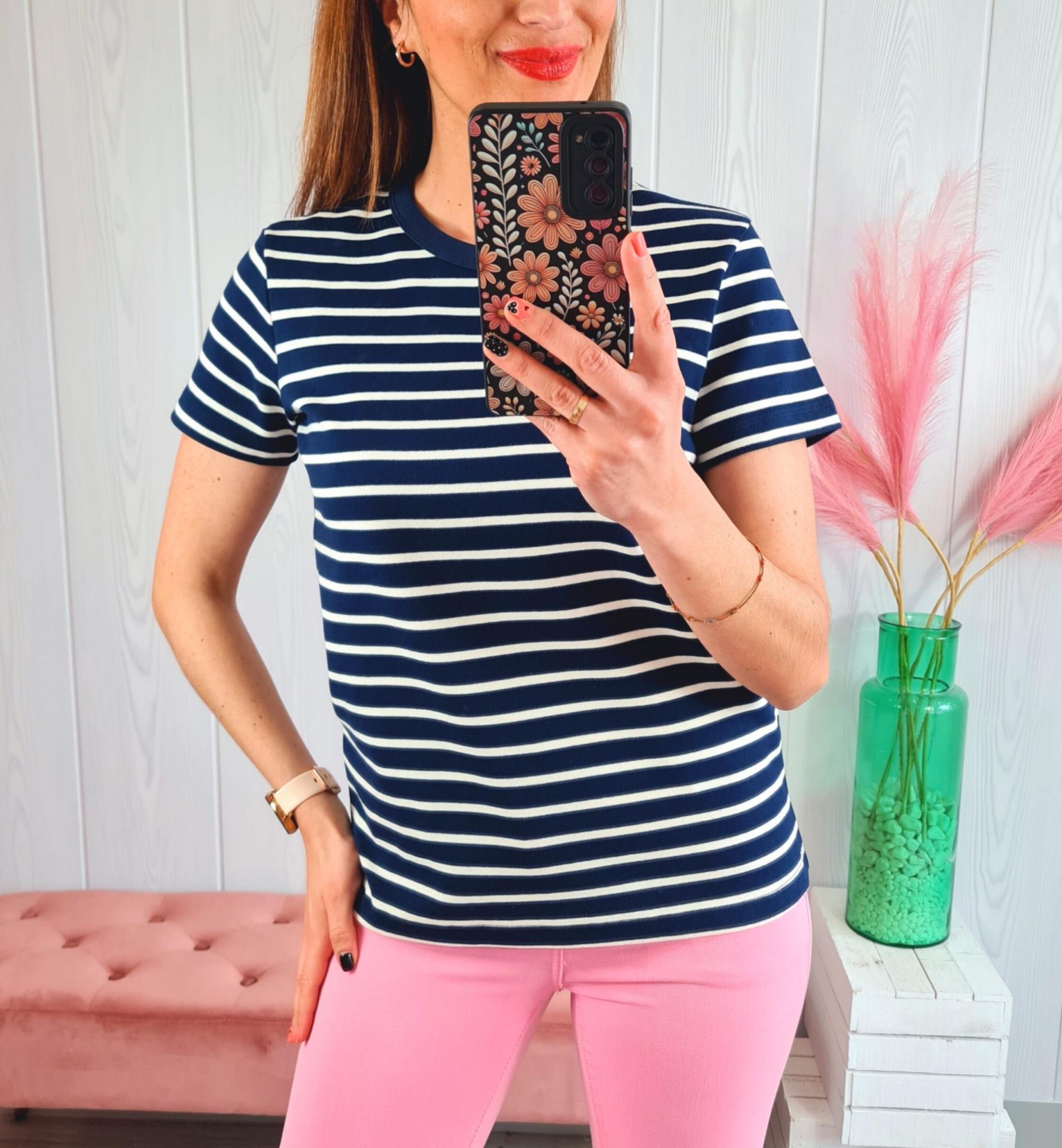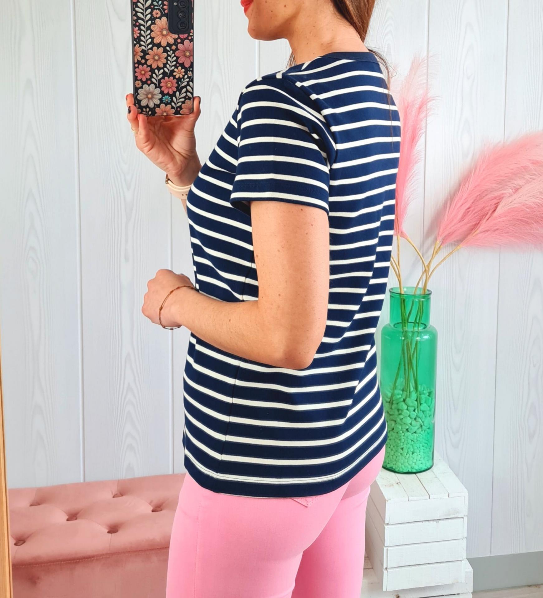 Camiseta de color azul marino con rayas blancas, tiene manga corta y cuello redondo.