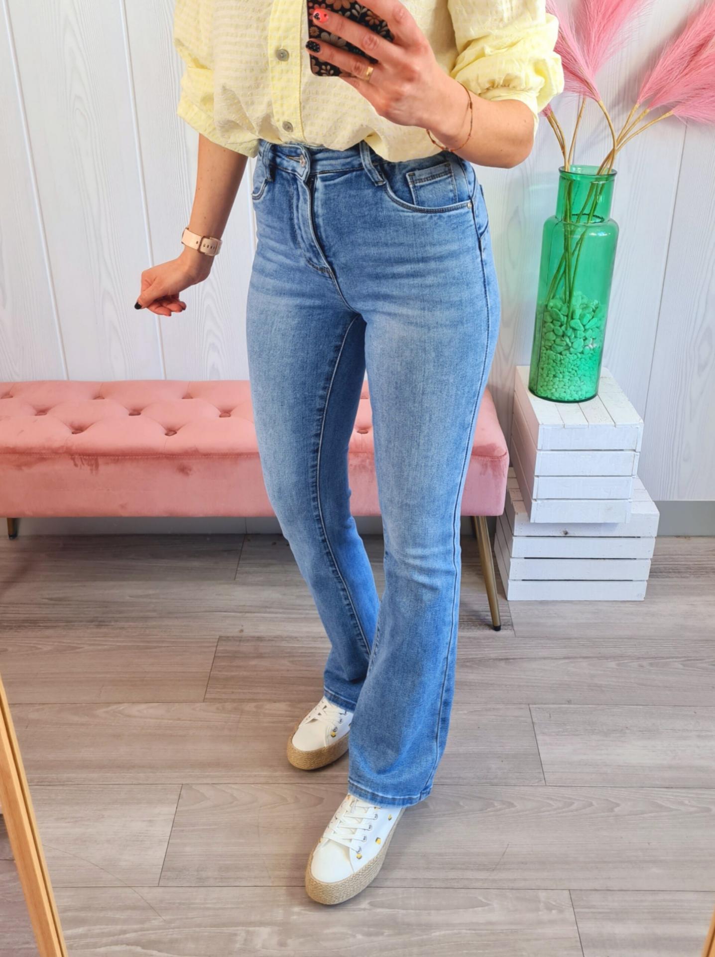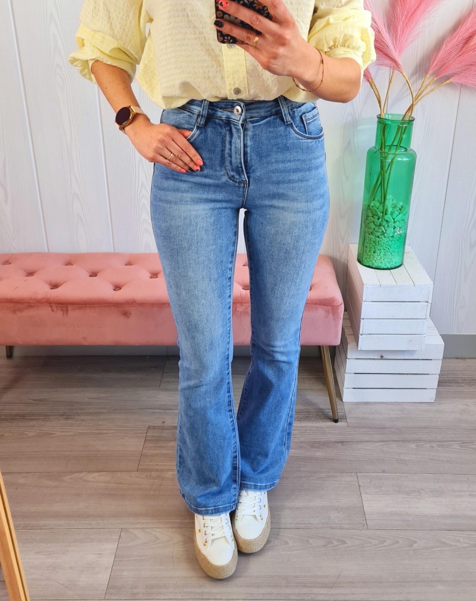 Pantalón vaquero clarito de campana. Tiene cierre con botón y cremallera, efecto push-up y refuerzo interior para disimular la tripita.