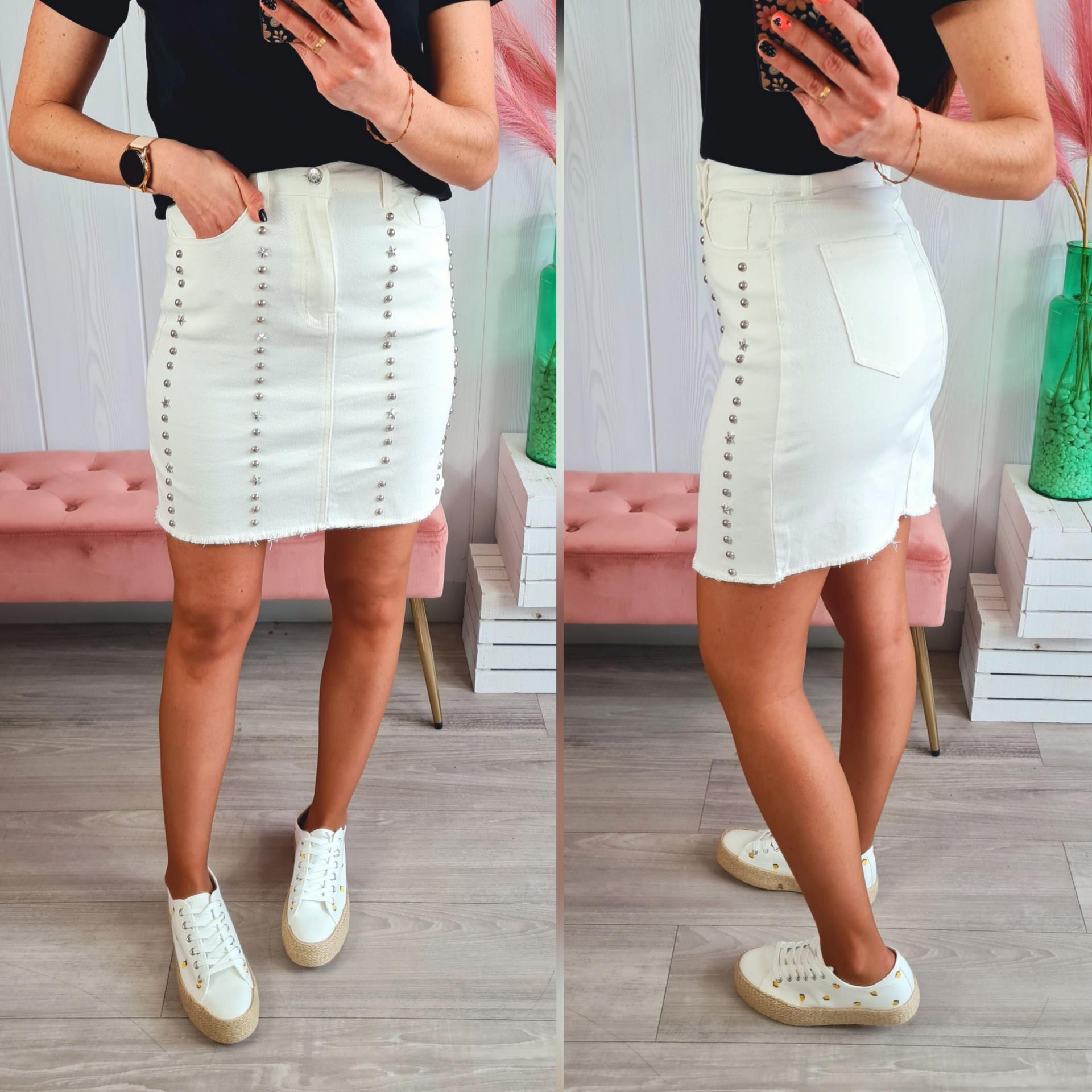 Falda vaquera mini en color blanco con tachas plateadas de adorno en la parte delantera. Tiene bolsillos laterales y cierre con botón y cremallera.