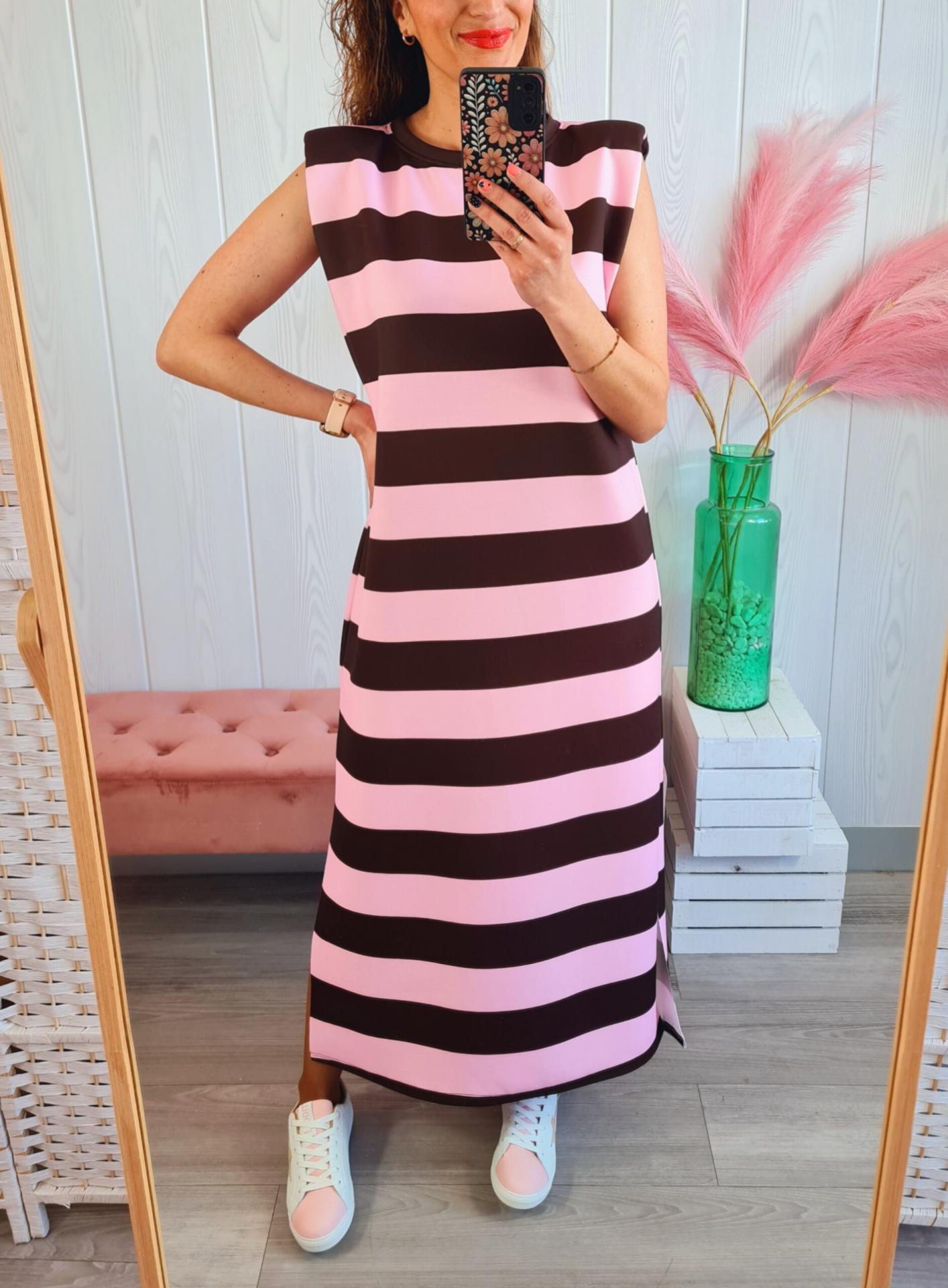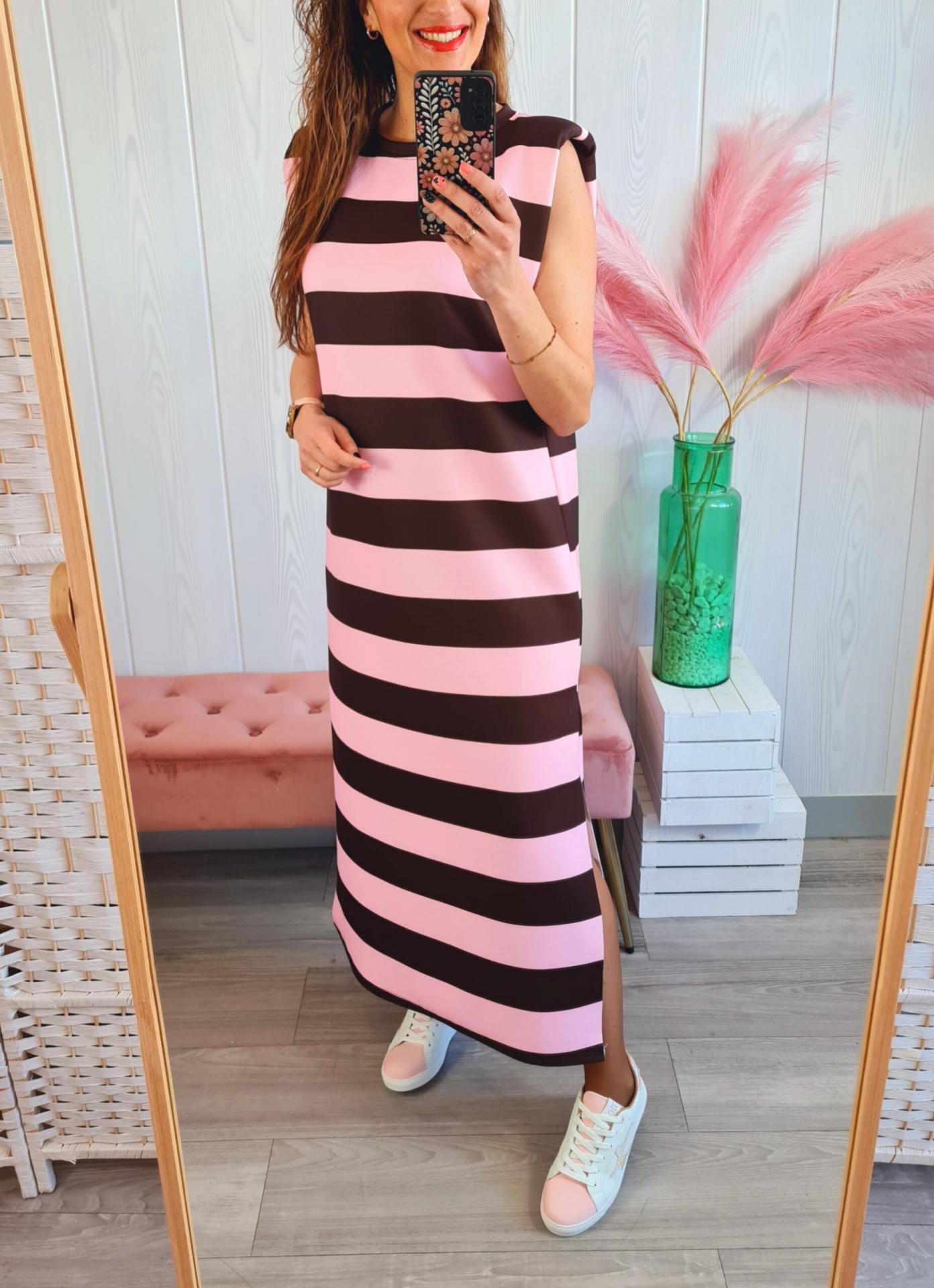 Vestido largo rayas en colores rosa y marrón chocolate, cuello redondo, manga en sisa con hombreras y rajas en los laterales.