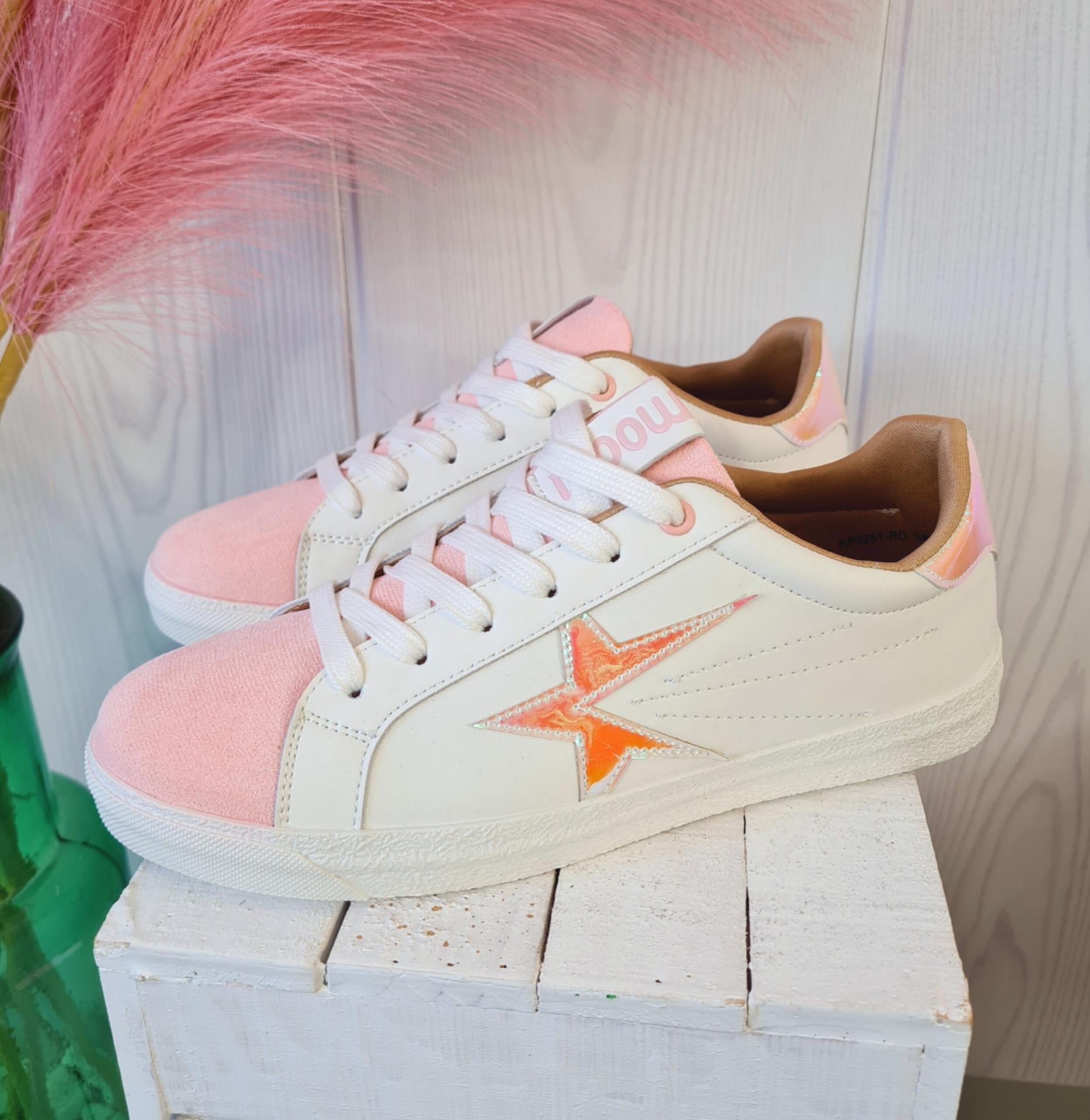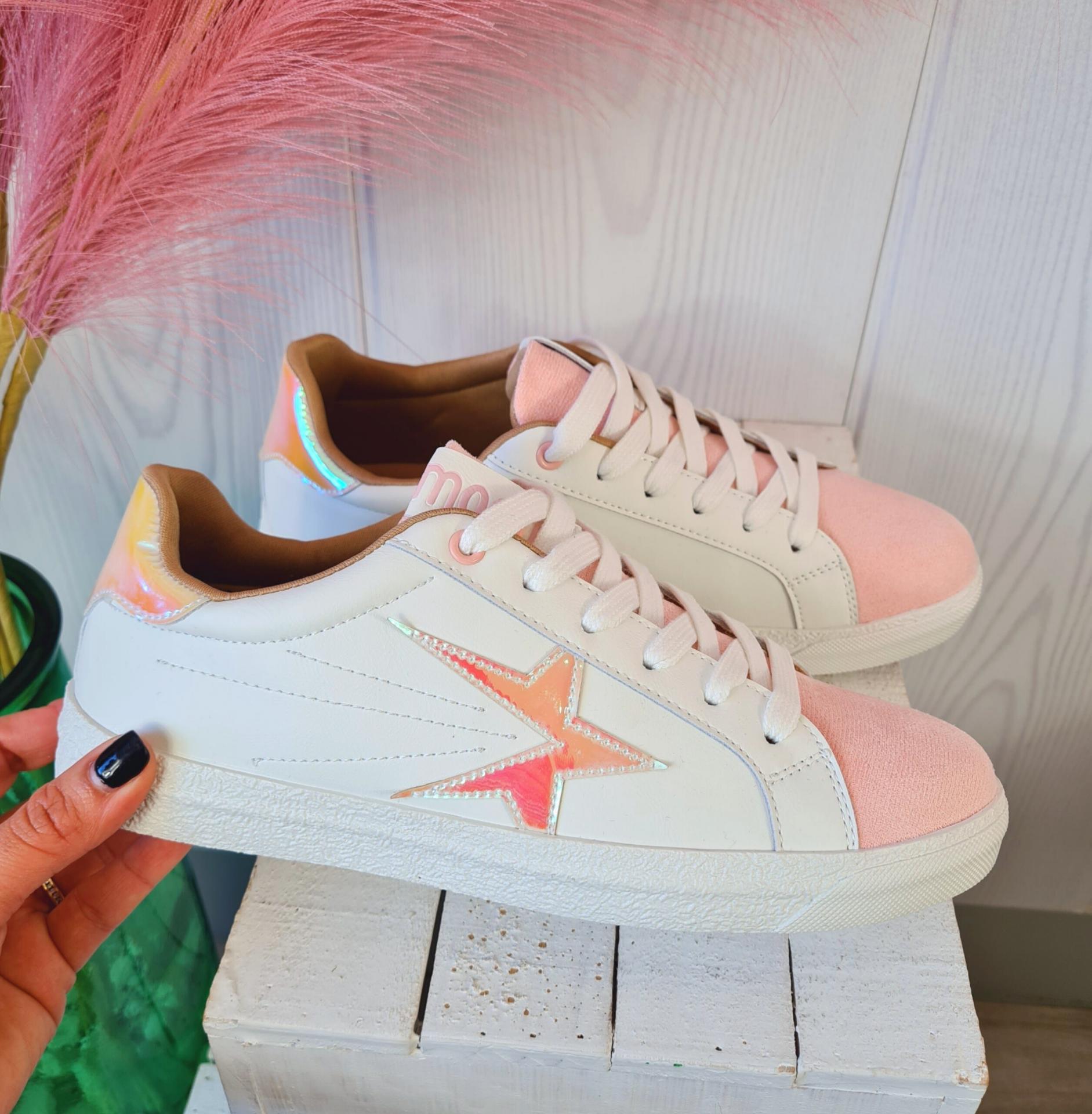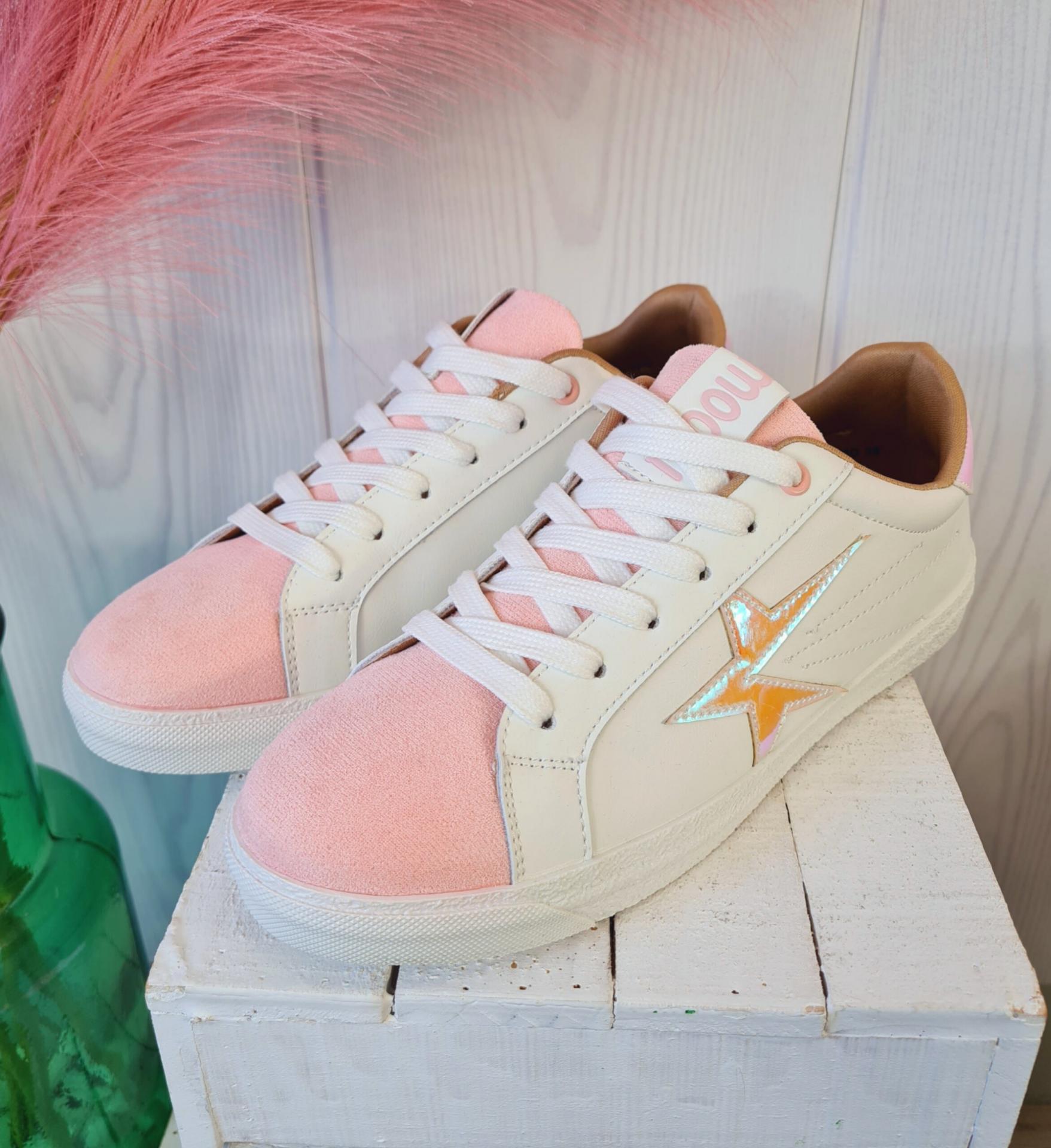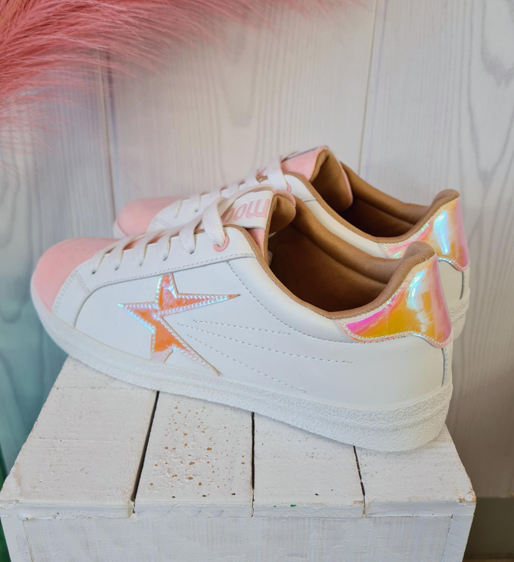 Zapatillas en color blanco combinado con rosa. Tienen estrellas metalizadas en los laterales. Las estrellas tienen las puntas un poco levantadas.