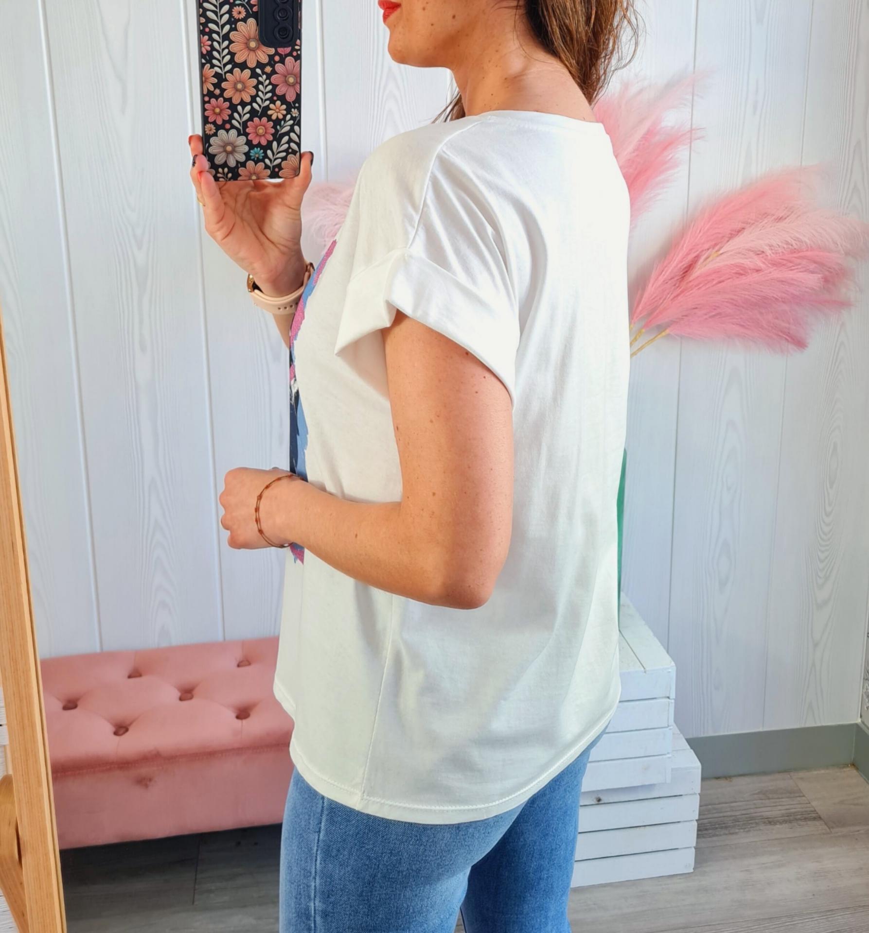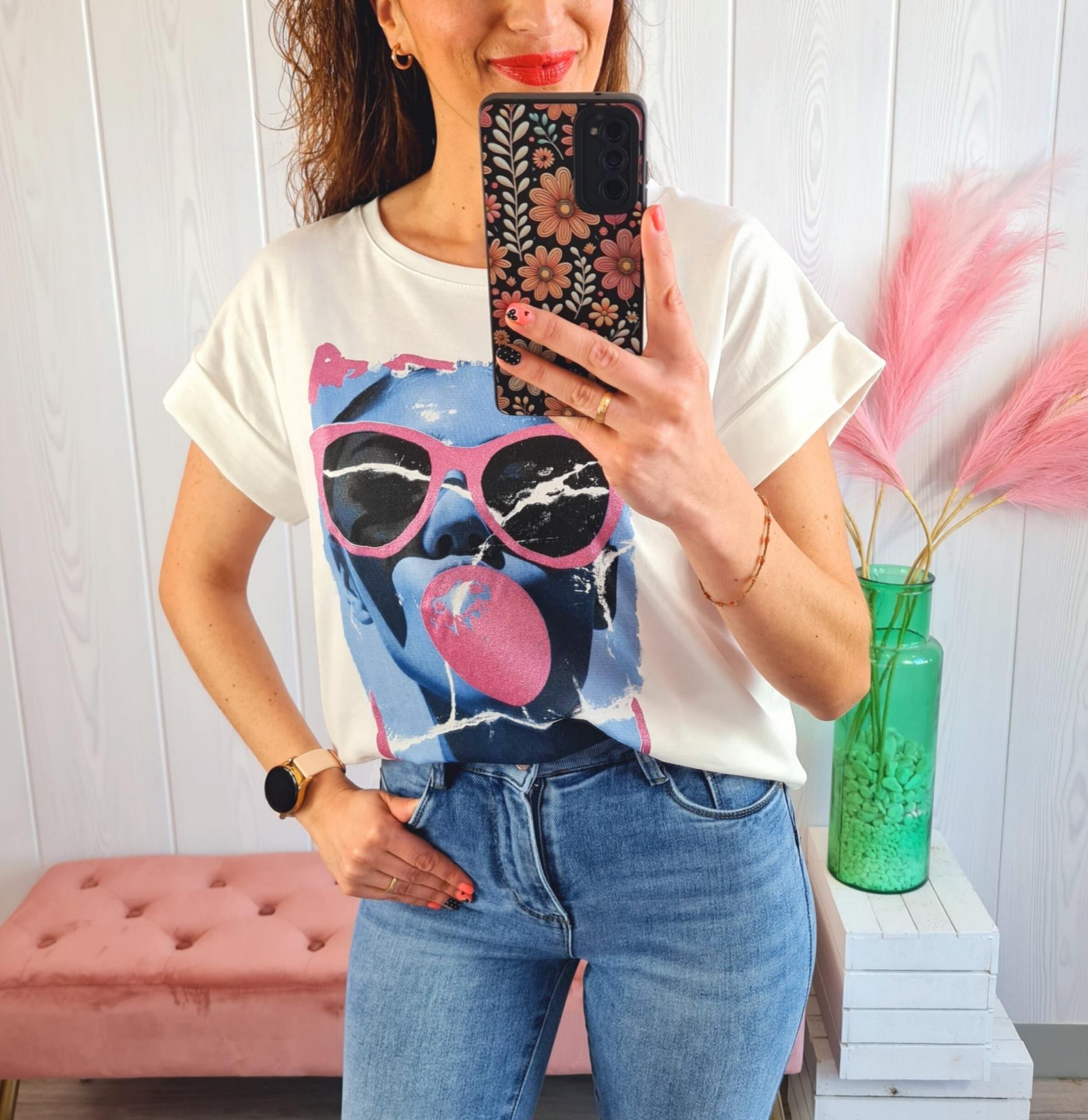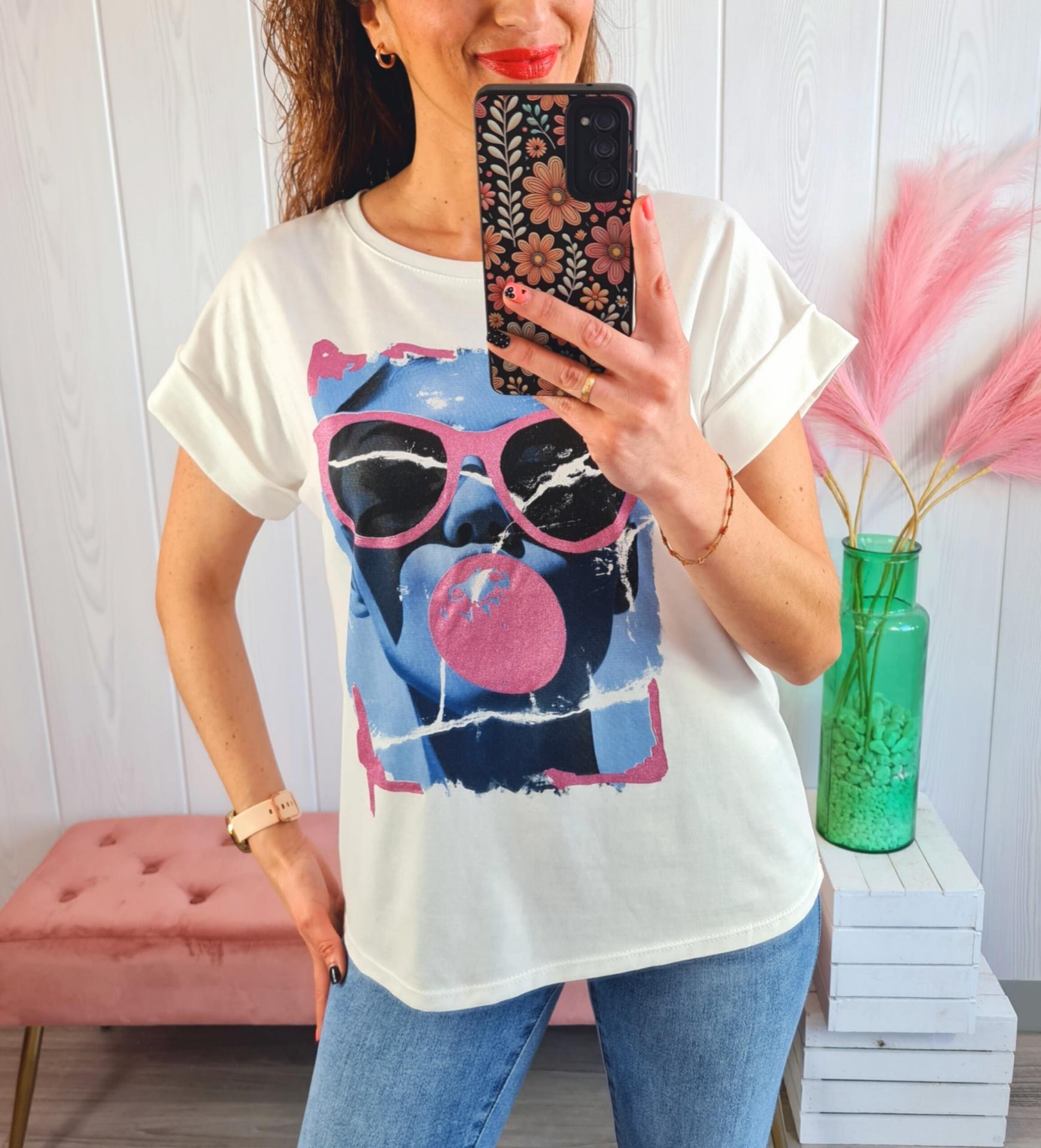 Camiseta de color blanco con estampado impreso en el pecho. Tiene cuello redondo y manga corta con una vuelta de adorno.