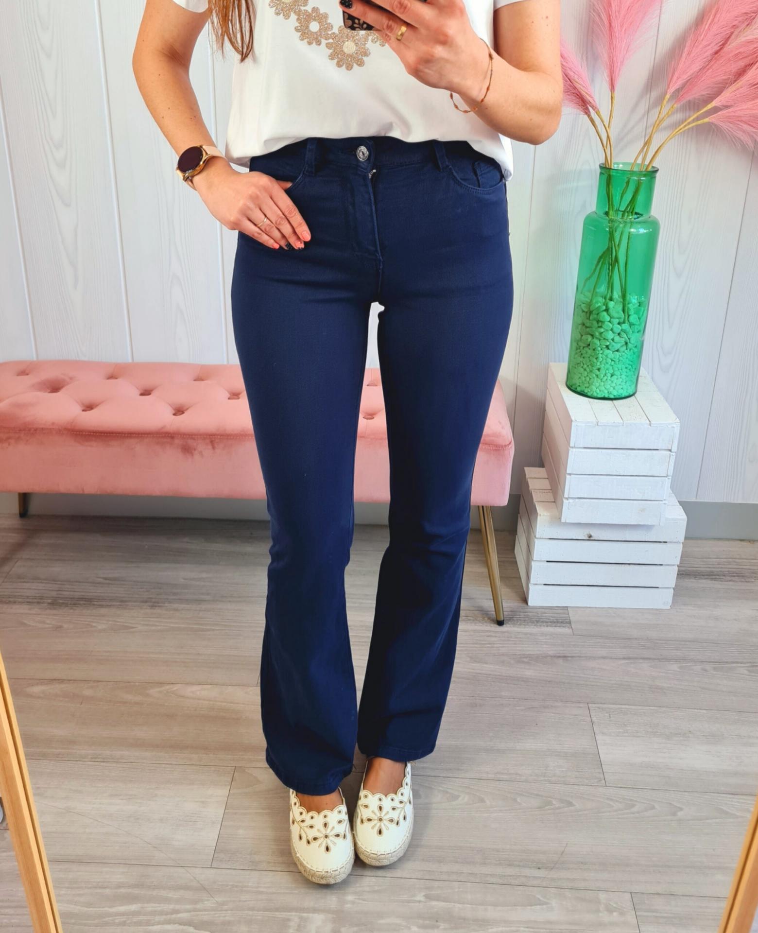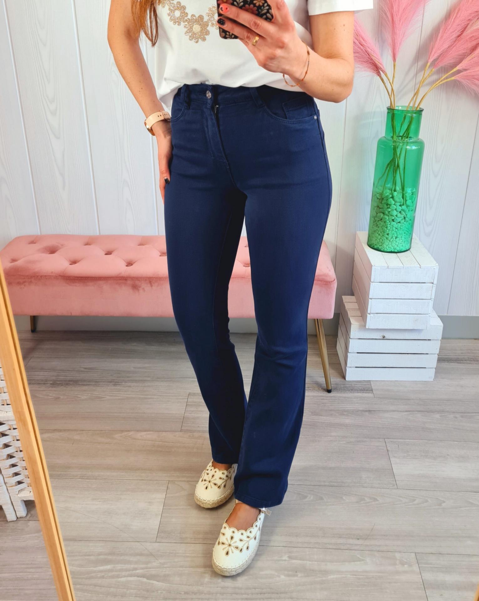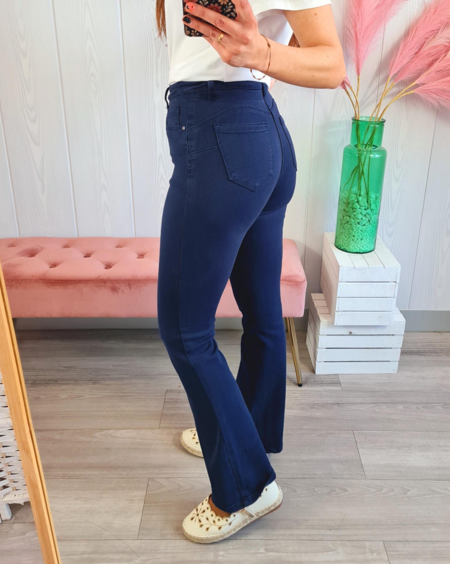 Pantalón vaquero de color azul marino de campana. Tiene cierre con botón y cremallera, efecto push-up y refuerzo interior para disimular la tripita.