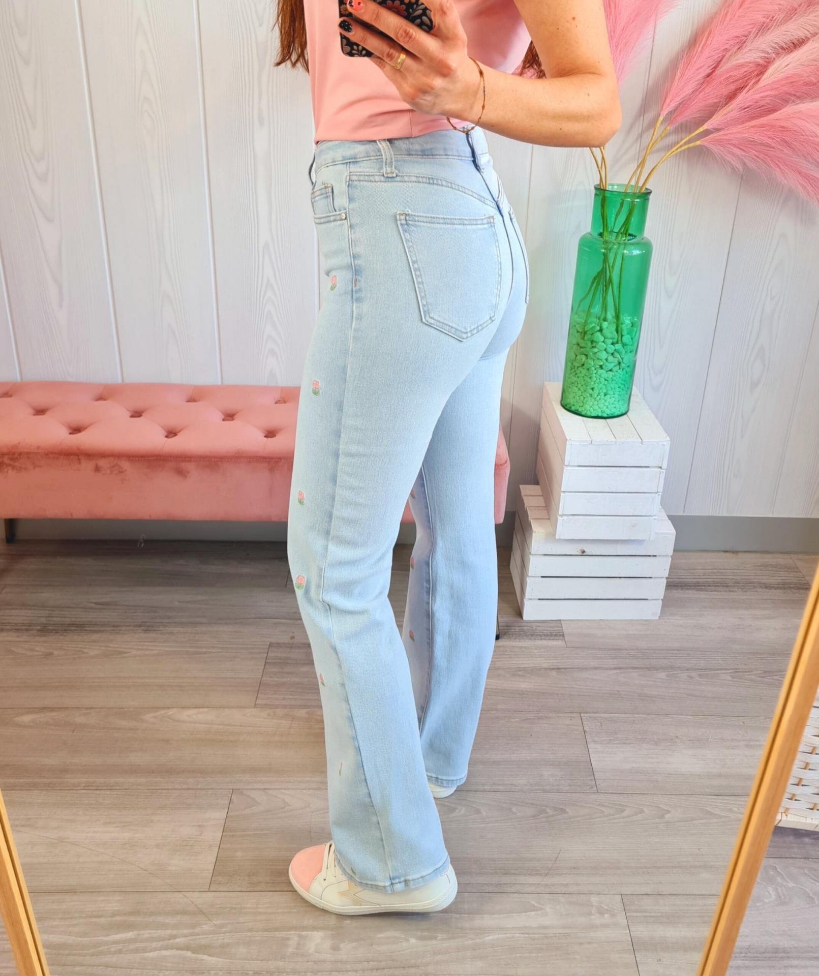 Pantalón vaquero de color clarito, con estampado de flores bordadas en tonos rosas en la parte delantera. Tiene cierre con botón y cremallera.