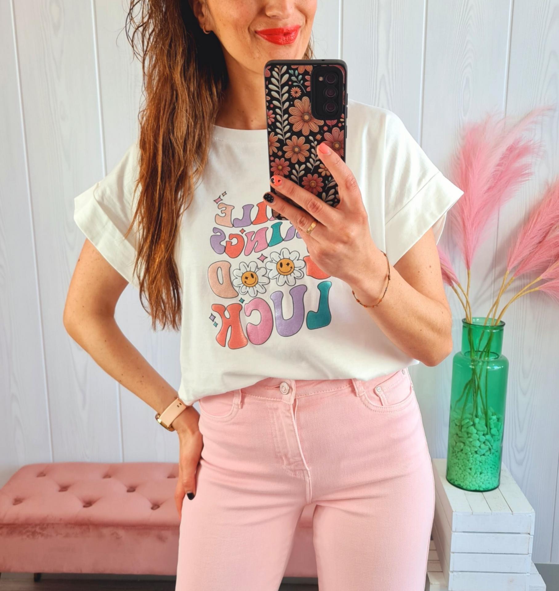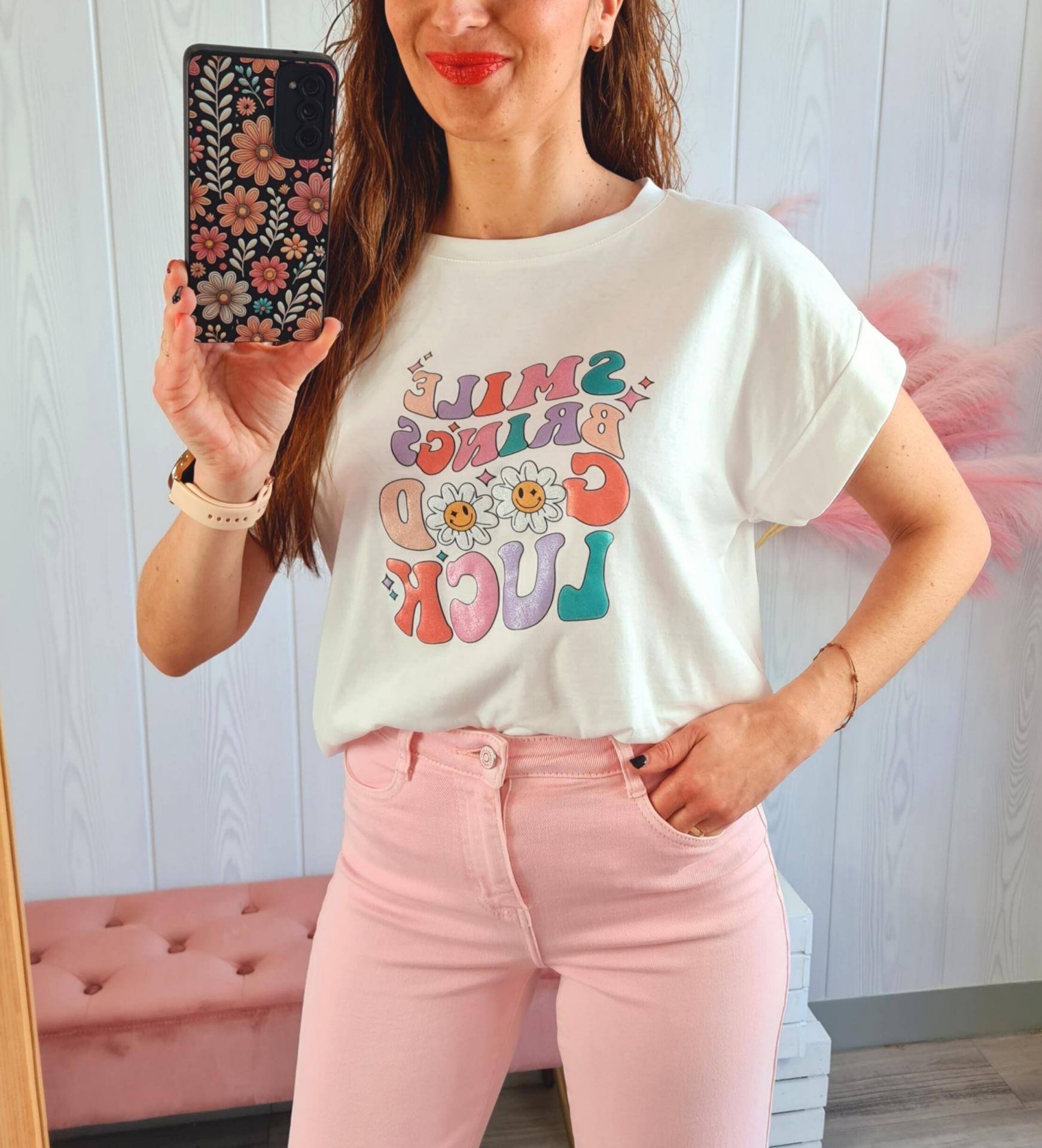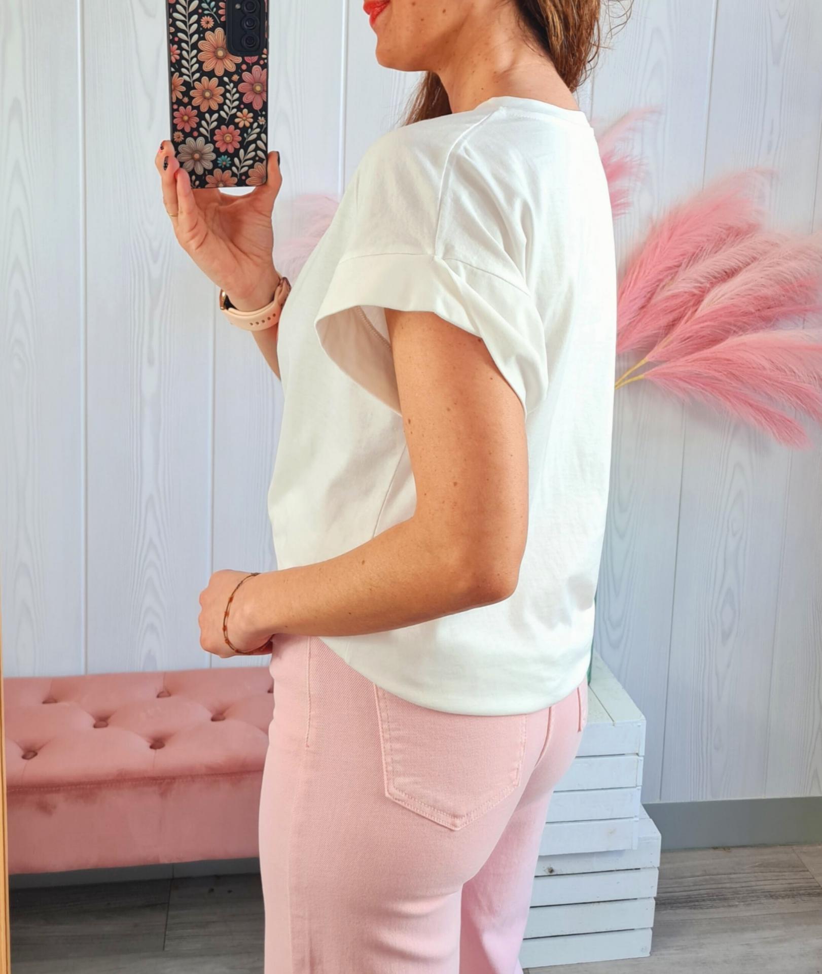 Camiseta de color blanco con estampado impreso en el pecho. Tiene cuello redondo y manga corta con una vuelta de adorno.