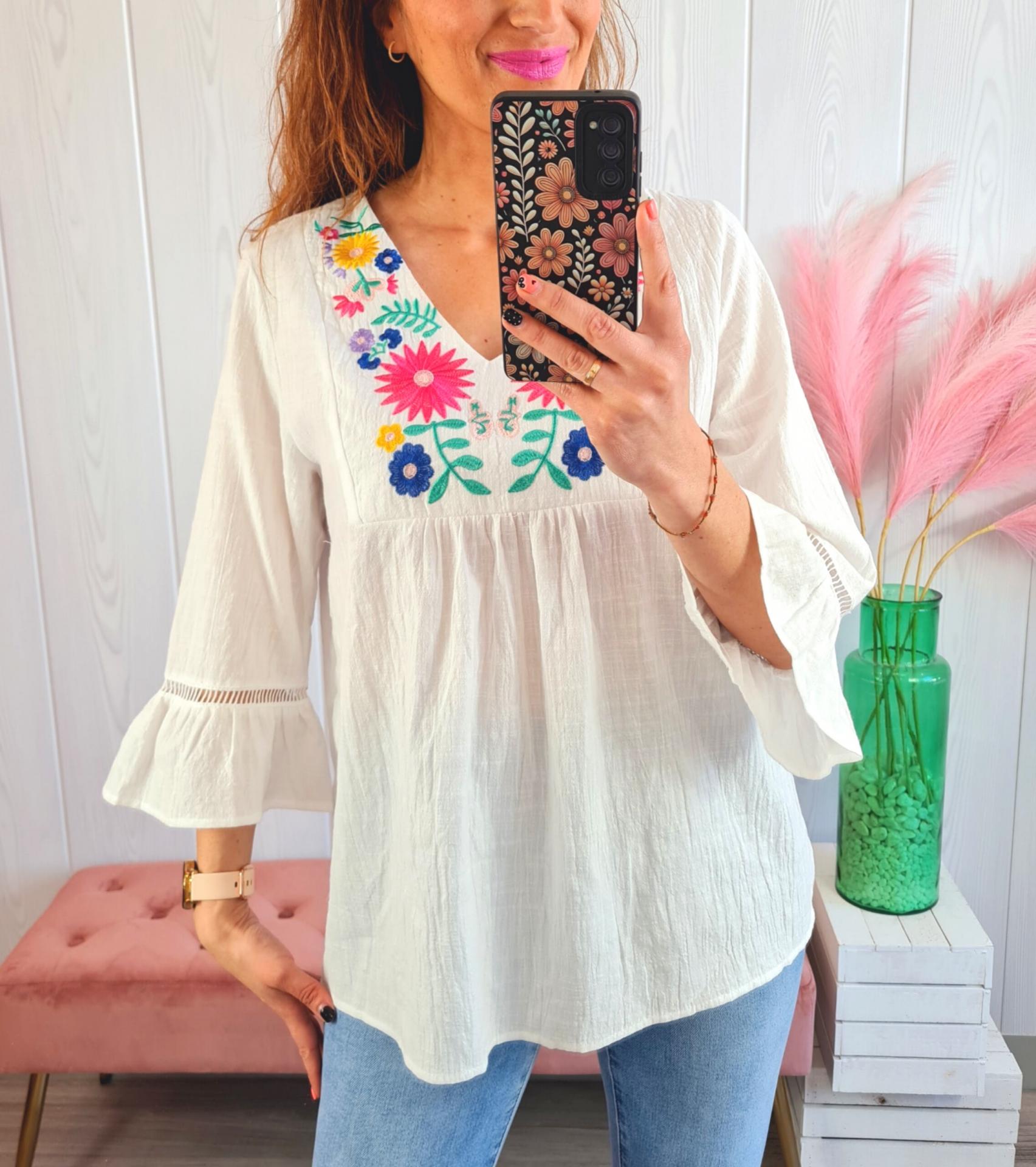 Blusa fluida en color blanco con flores bordadas en el pecho. Tiene manga 3/4 adornada con un volantito, corte en el pecho y cuello de pico.