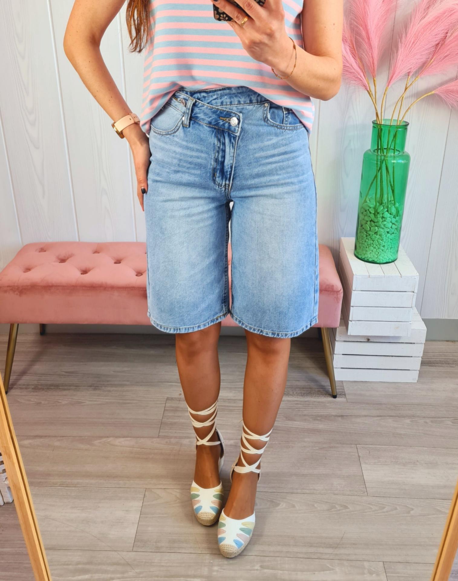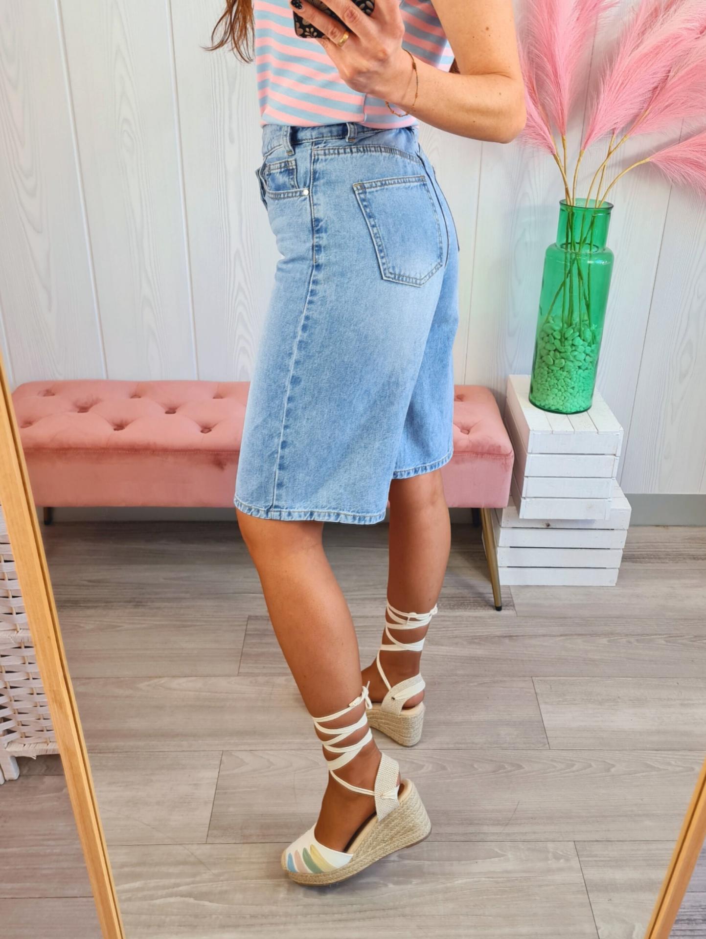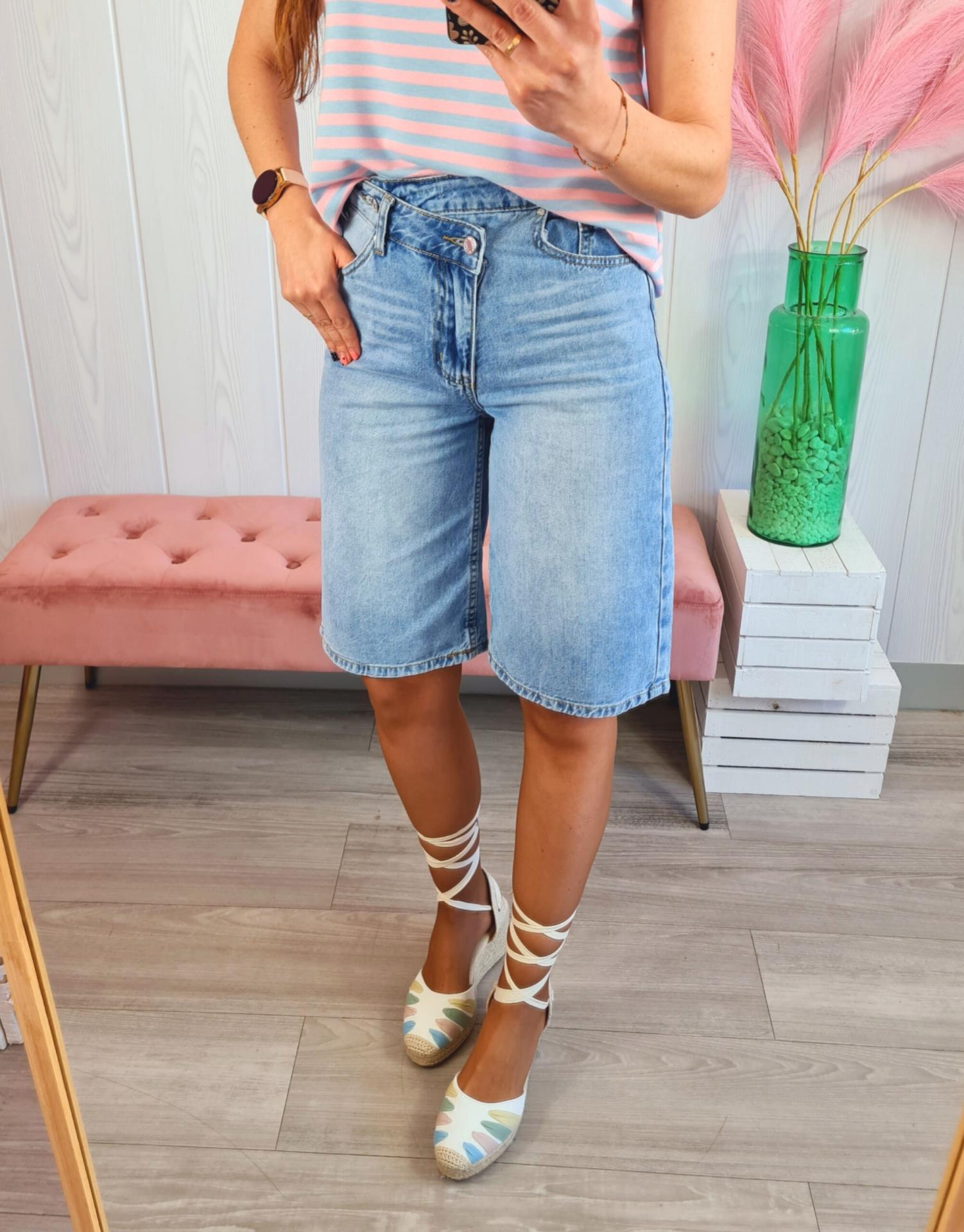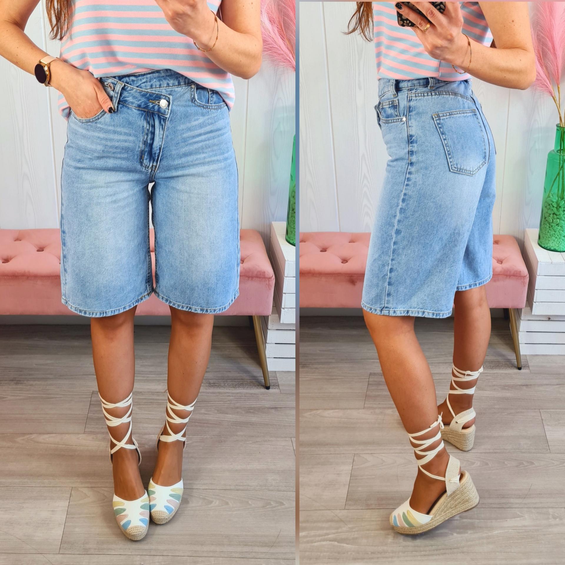 Bermuda vaquera en color clarito. Tiene bolsillos, cierre asimétrico con cremallera y botón .