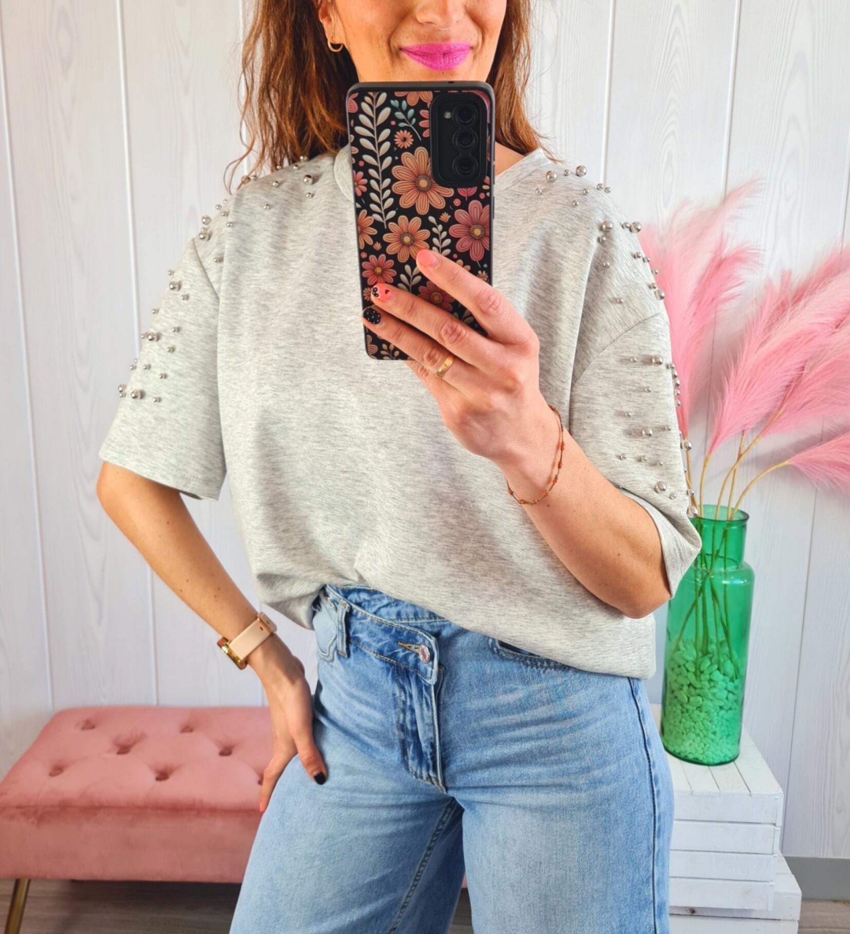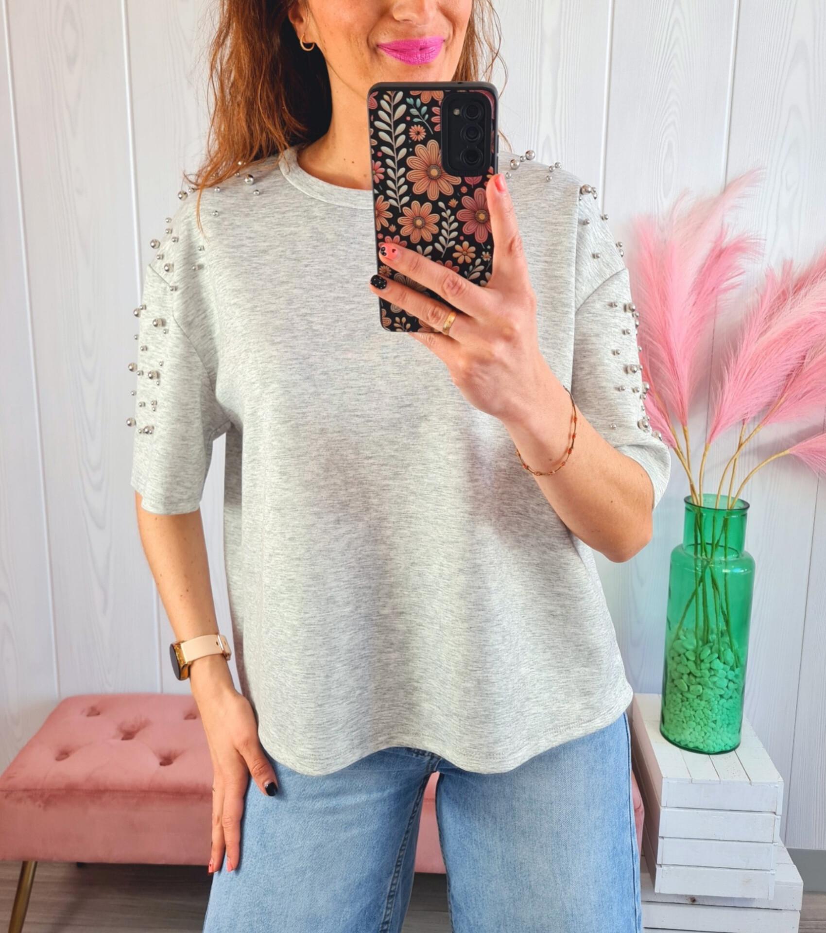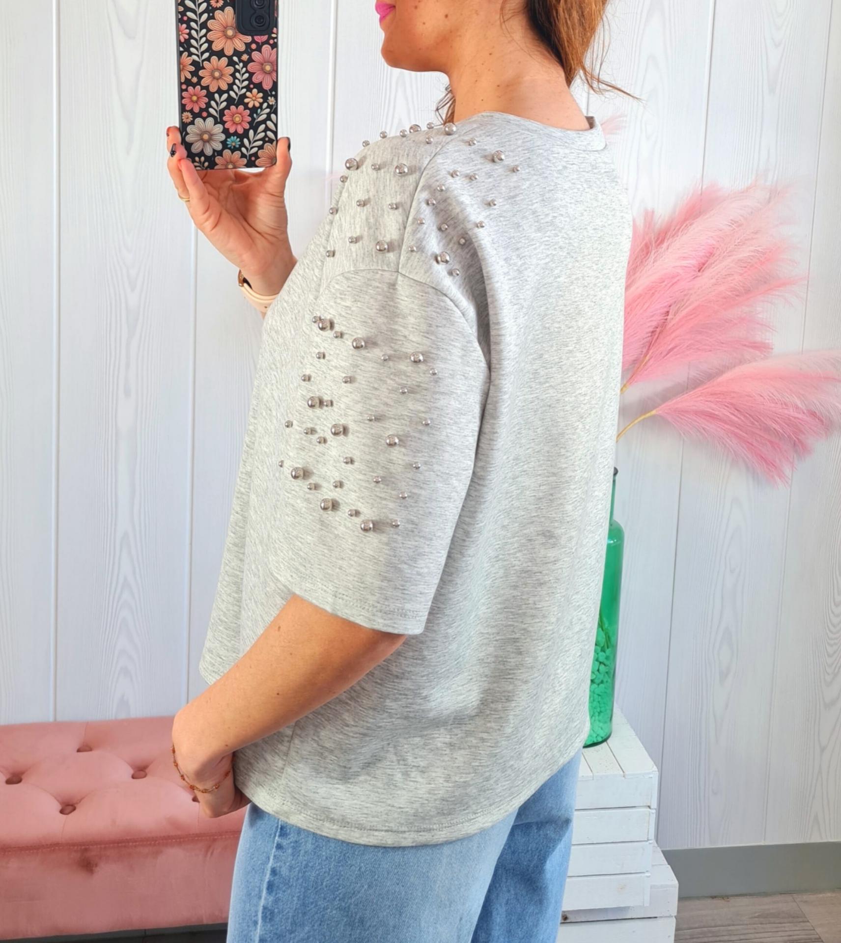 Camiseta de color gris con tachas en hombros y mangas. Tiene cuello redondo y manga por el codo.