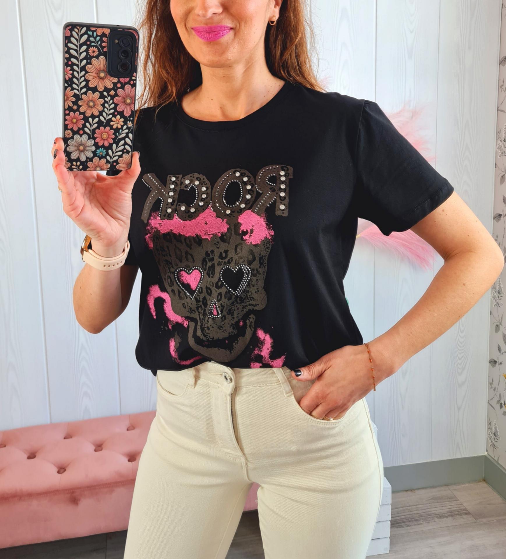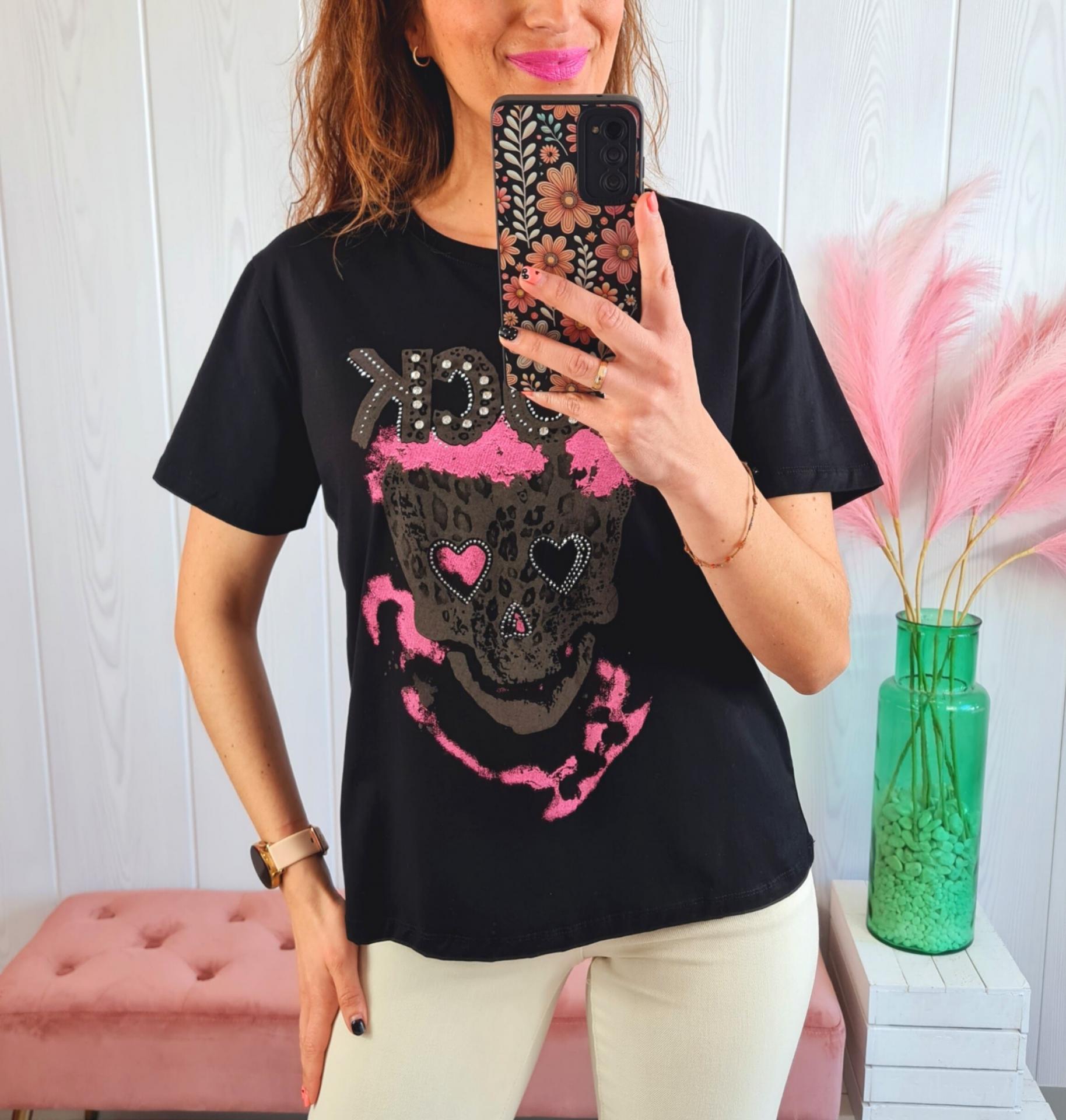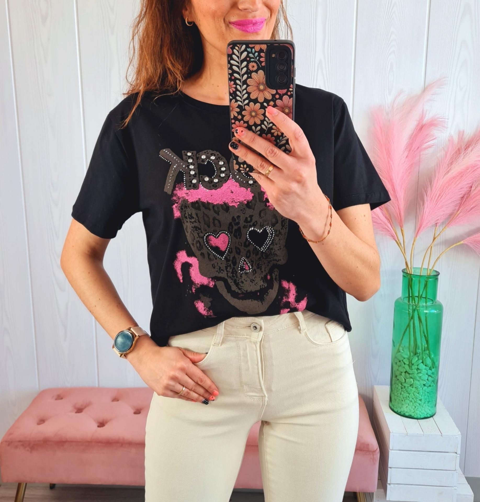 Camiseta de color negro con estampado impreso de calavera en tonos marrones y rosas y terminaciones de brillantitos. Tiene cuello redondo y manga larga.
