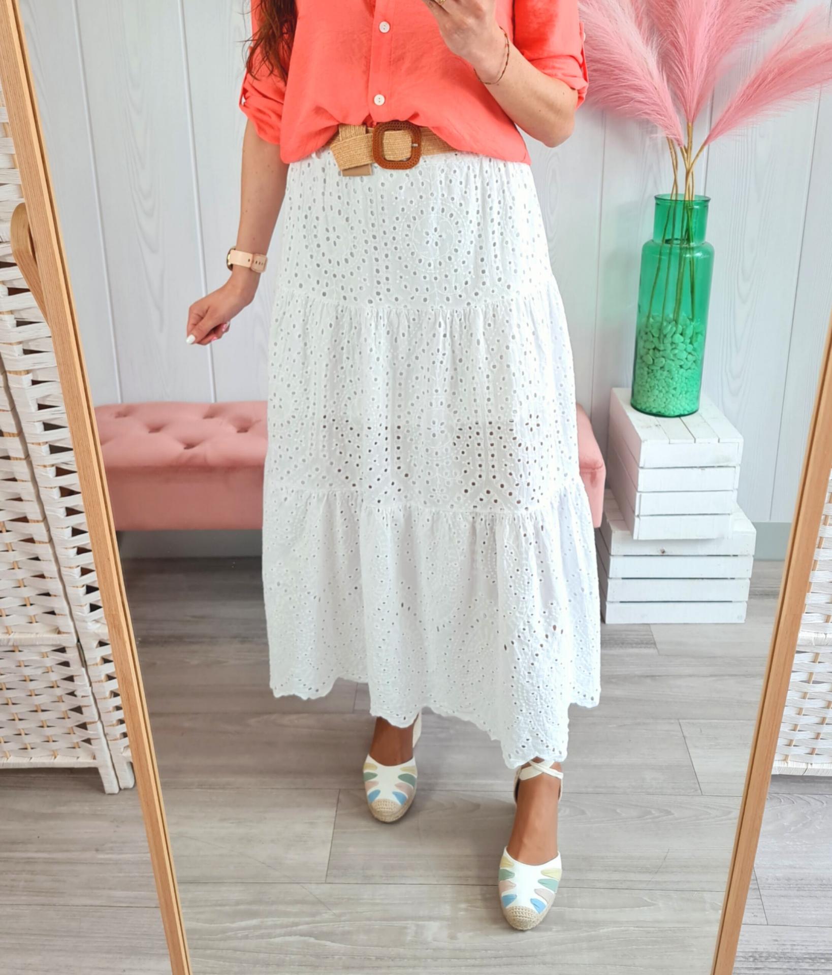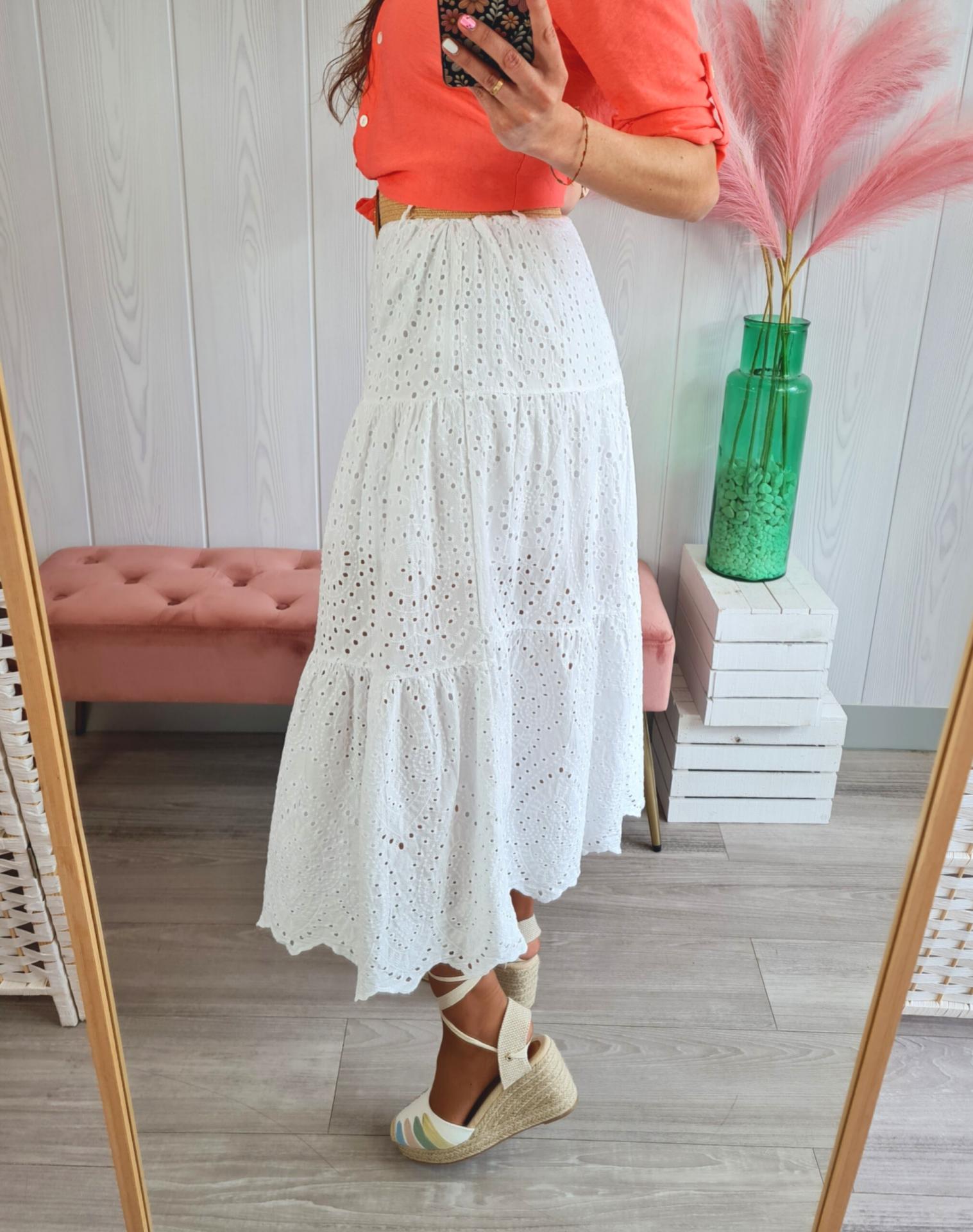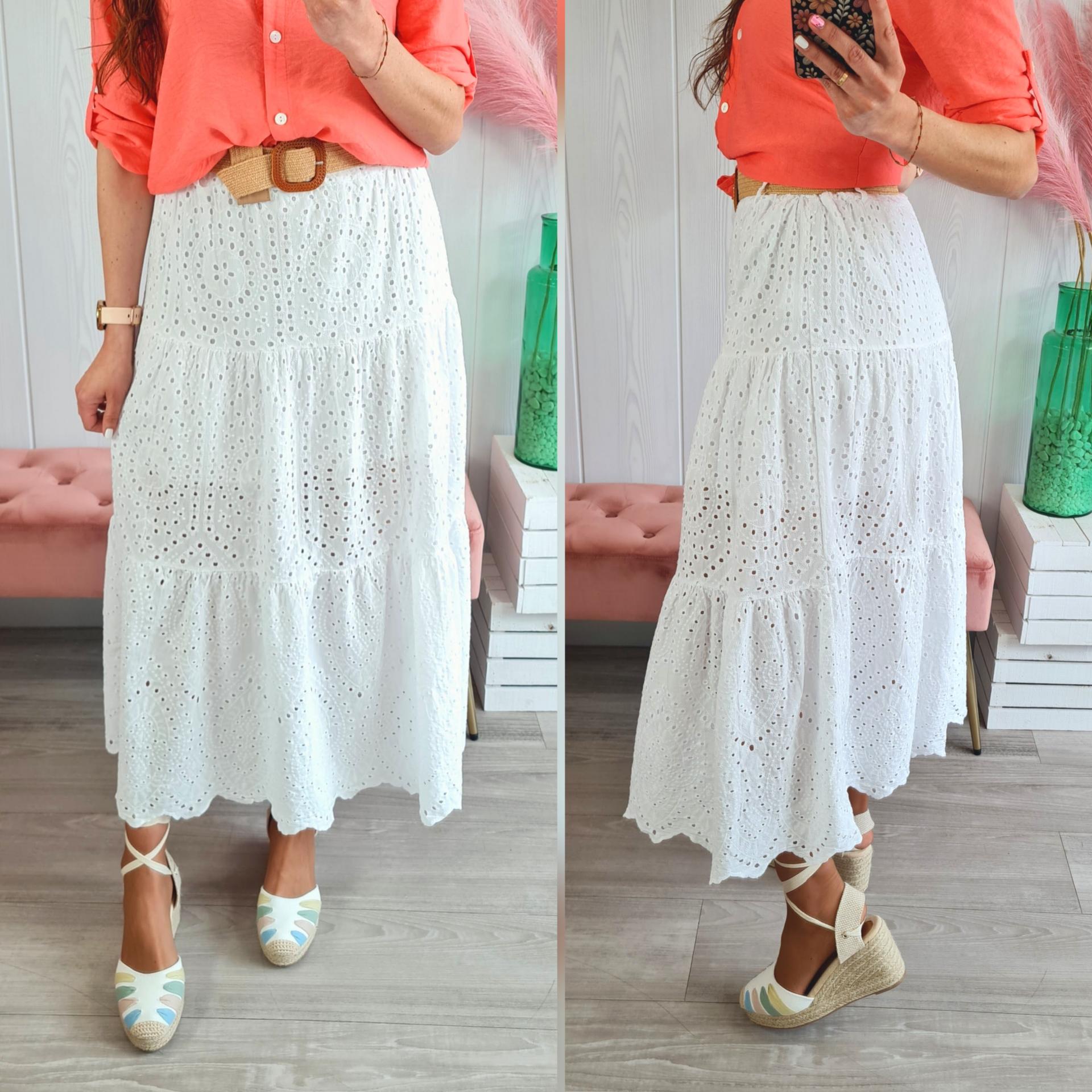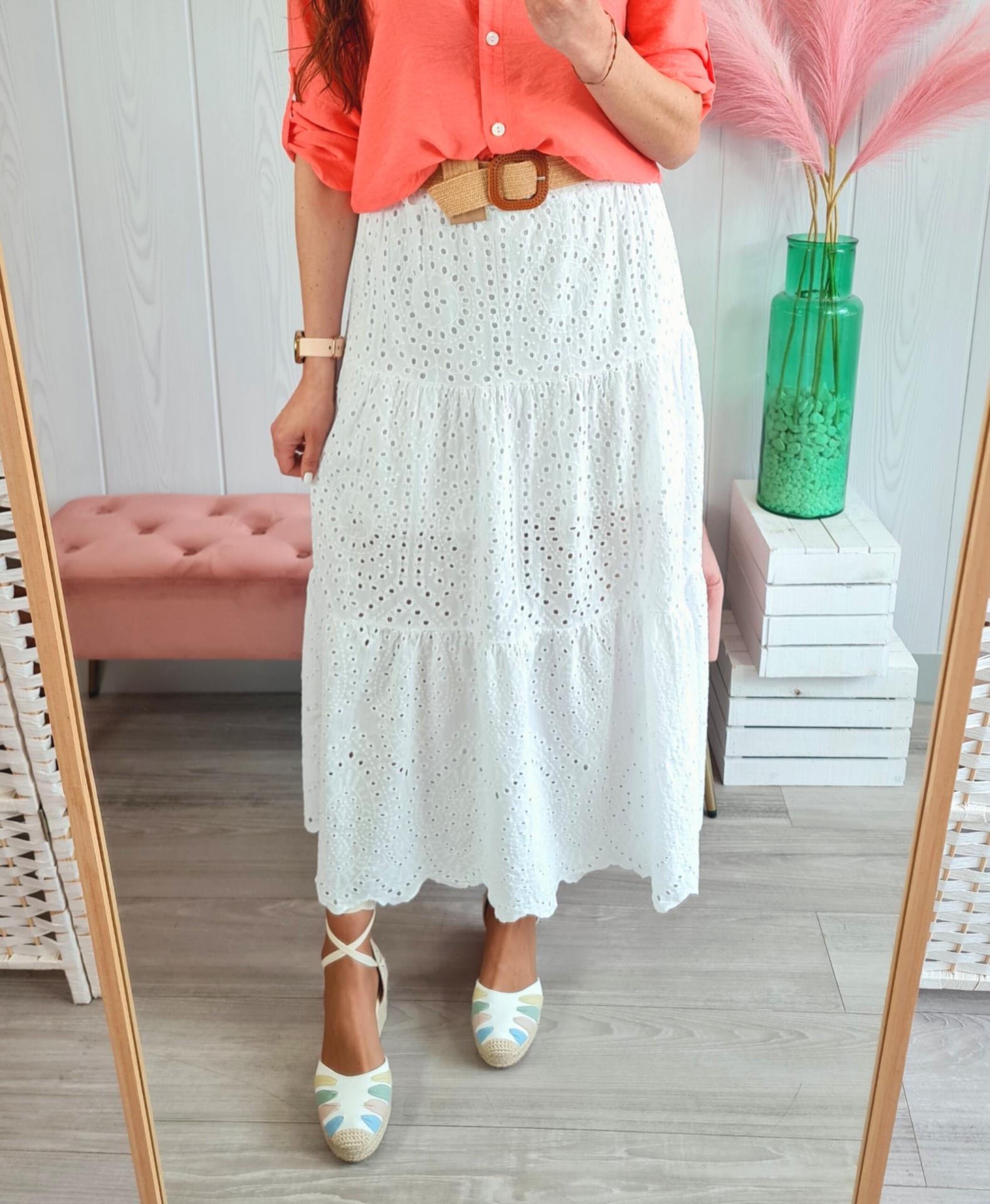 Falda larga perforada en color blanco, tiene cinturilla elástica. Cinturón incluido.