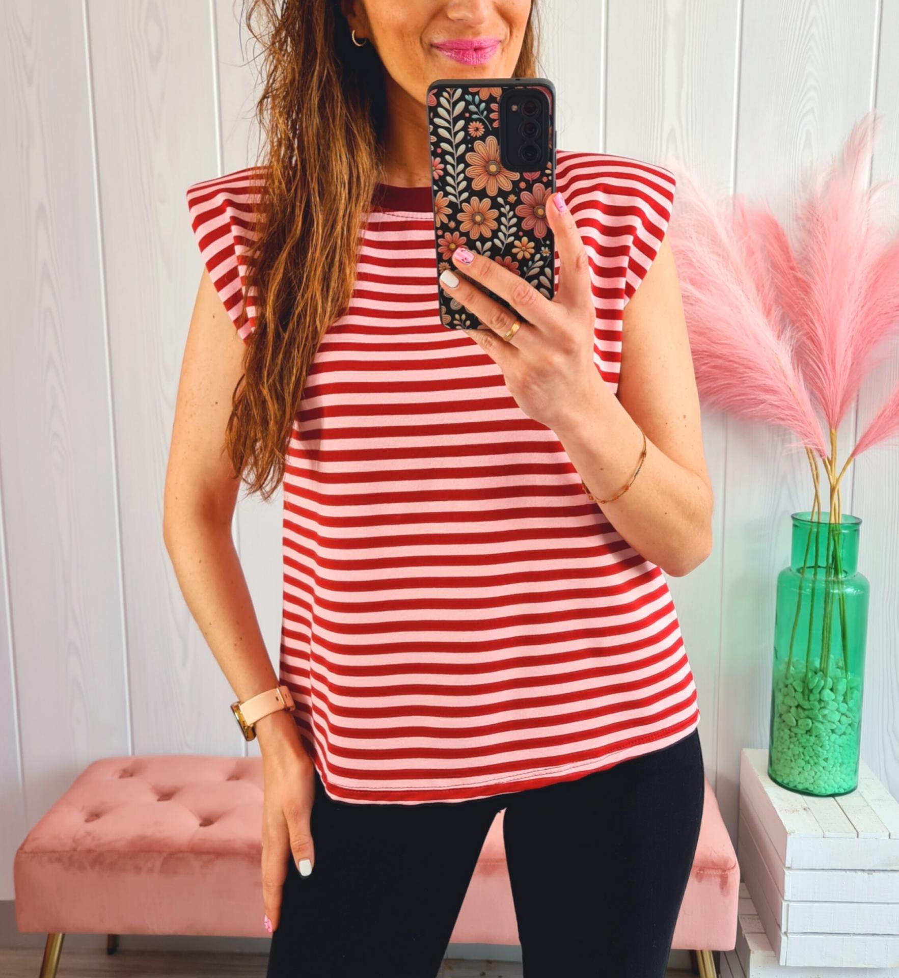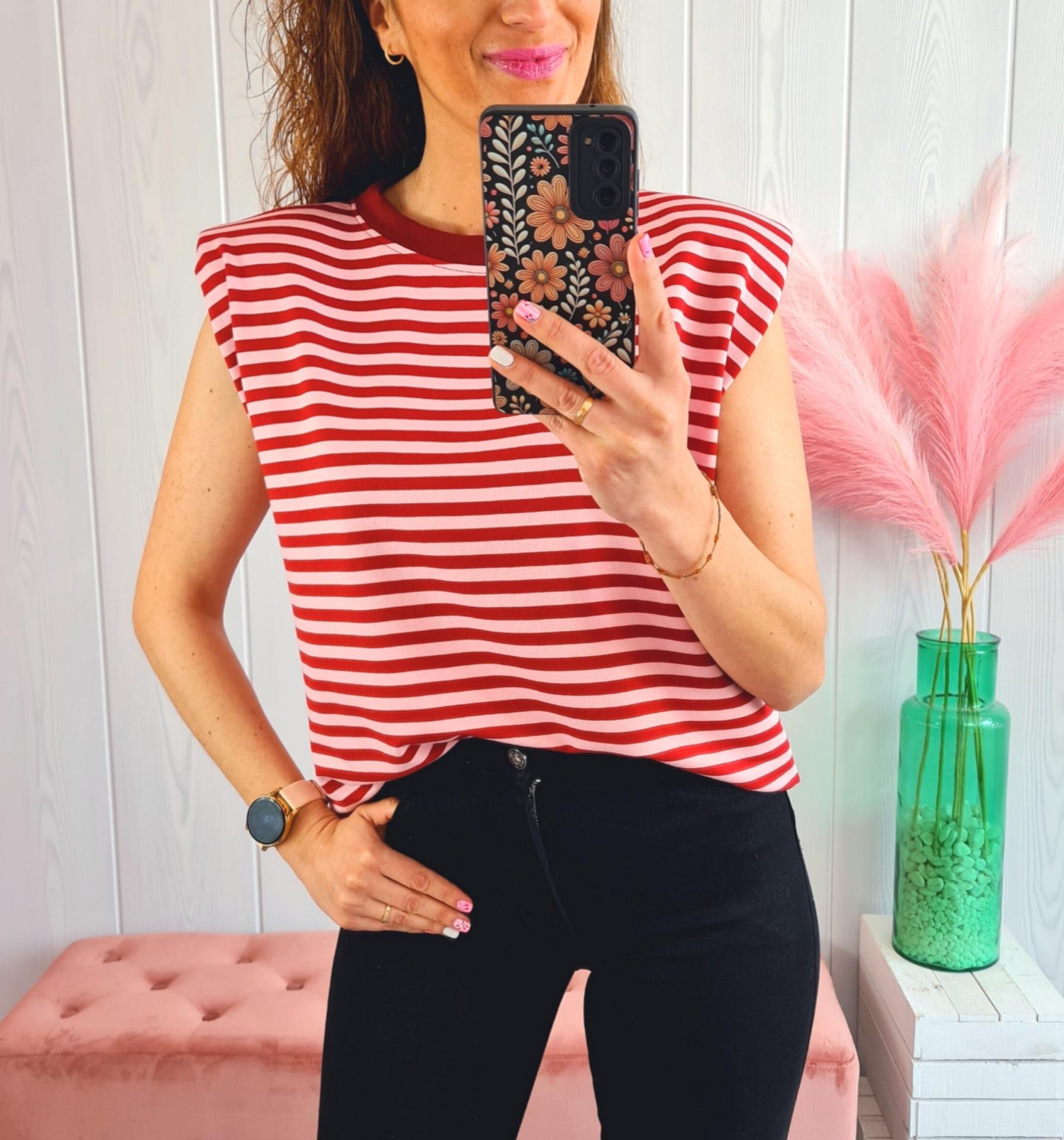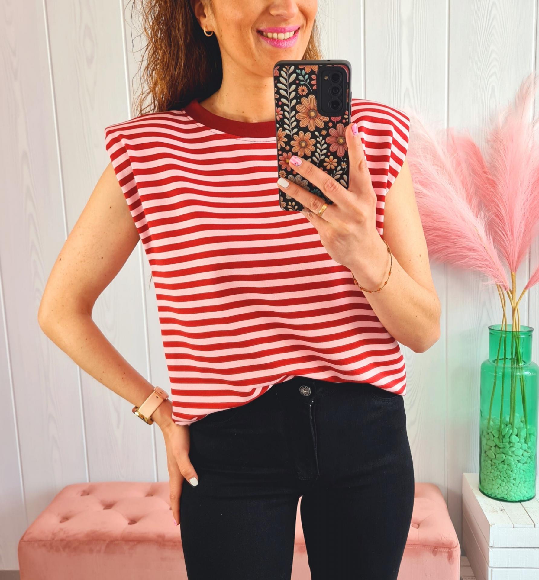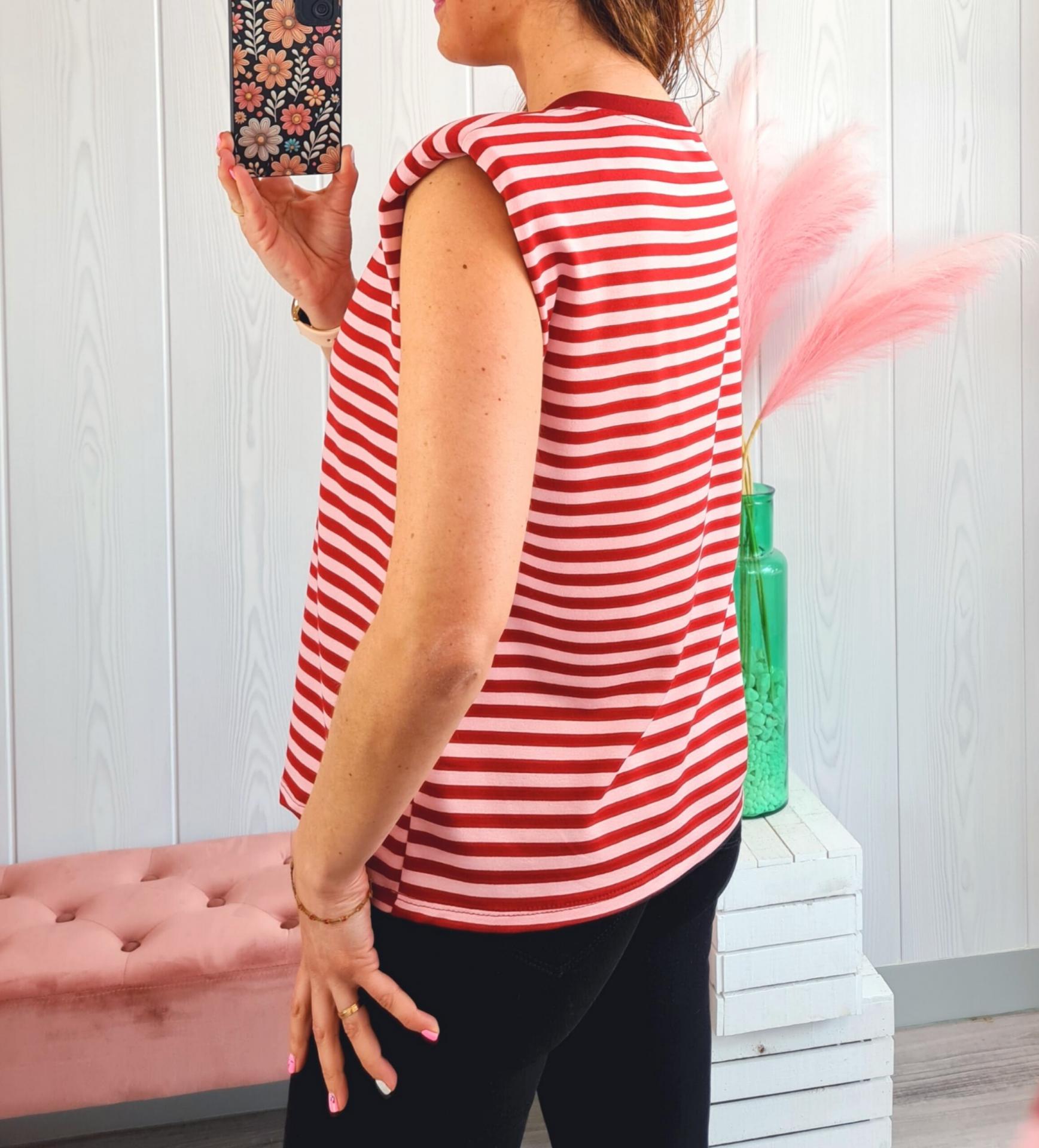 Camiseta de rayas en colores rosas y granate, cuello redondo y manga en sisa con hombreras.