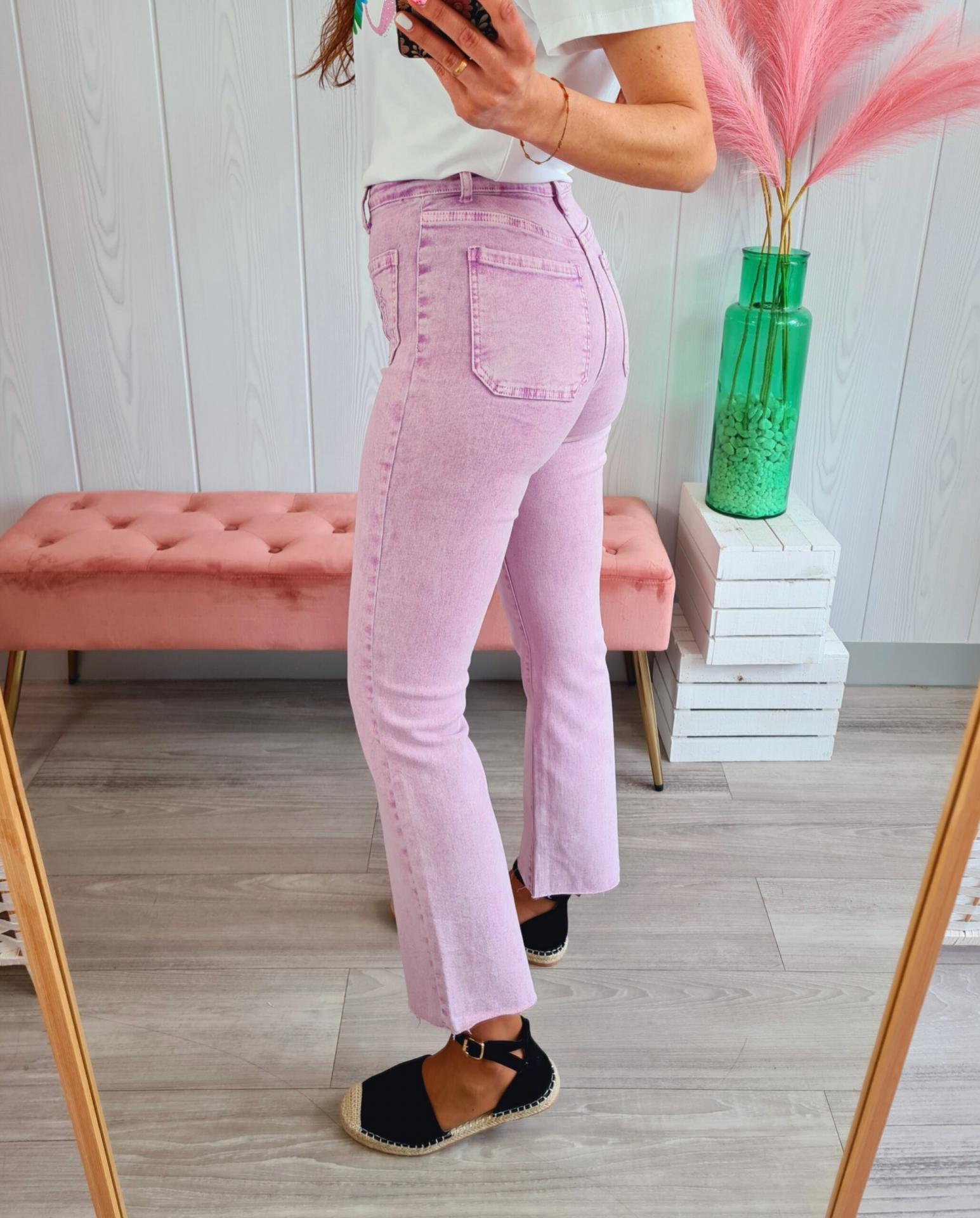 Pantalón vaquero de estilo cropped en color lila. Tiene cierre con botón y cremallera, bajo desflecado y bolsillos delanteros superpuestos con flor bordada.