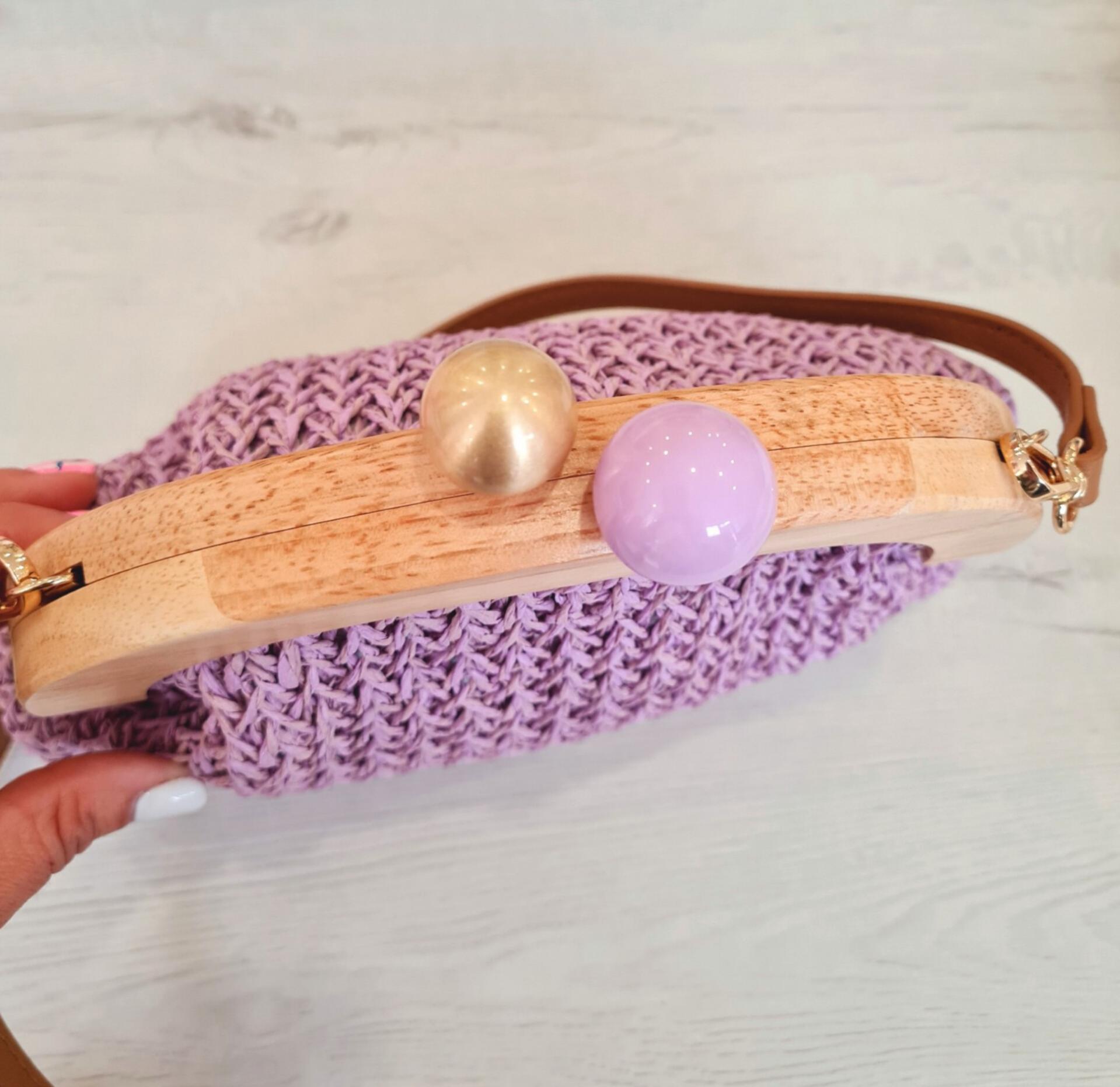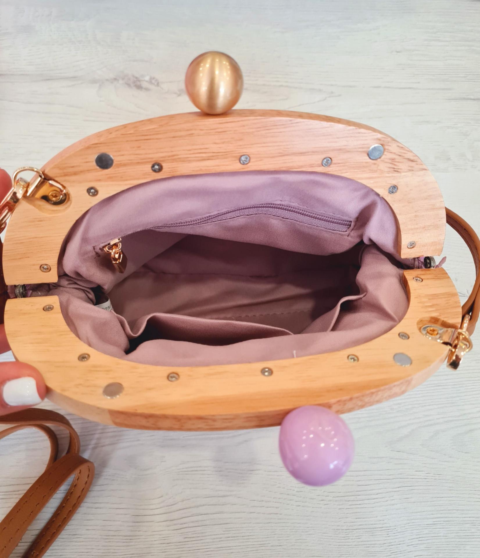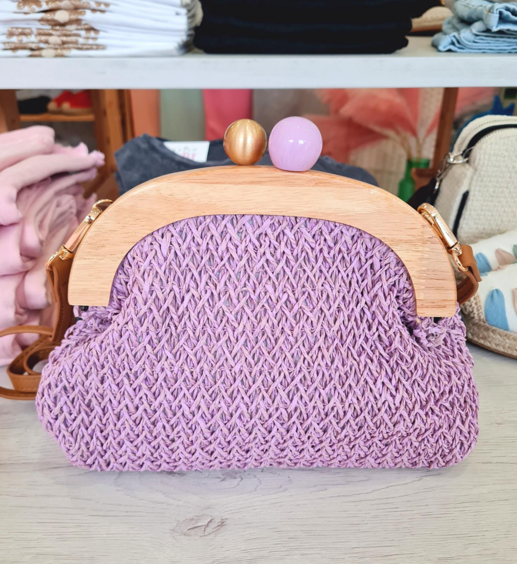 Bandolera en color malva con el filo de madera. Tiene cierre con clip, forro interior, varios bolsillos.