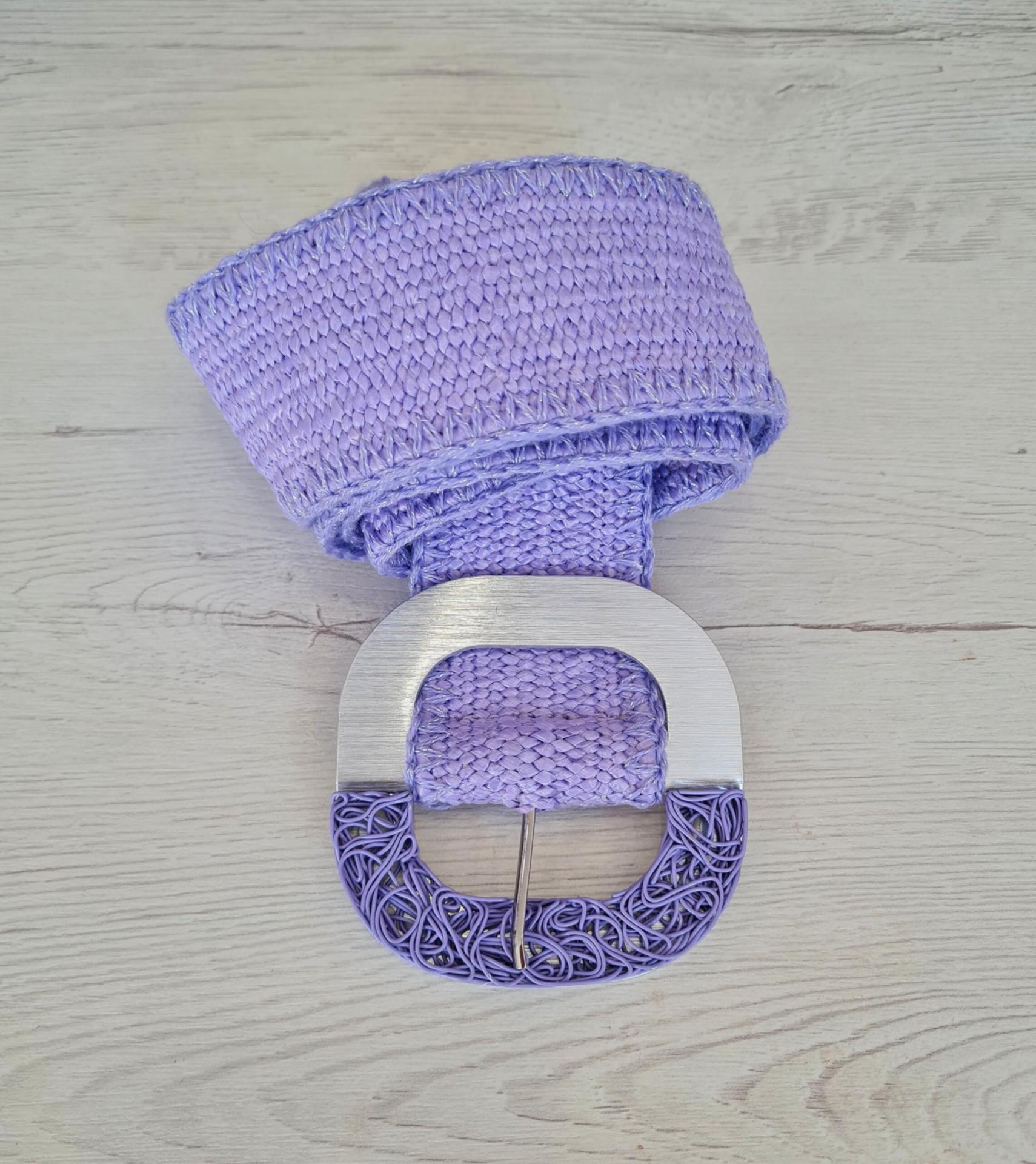 Cinturón elástico en color malva, tiene hebilla cuadrada plateada combinada con malva.