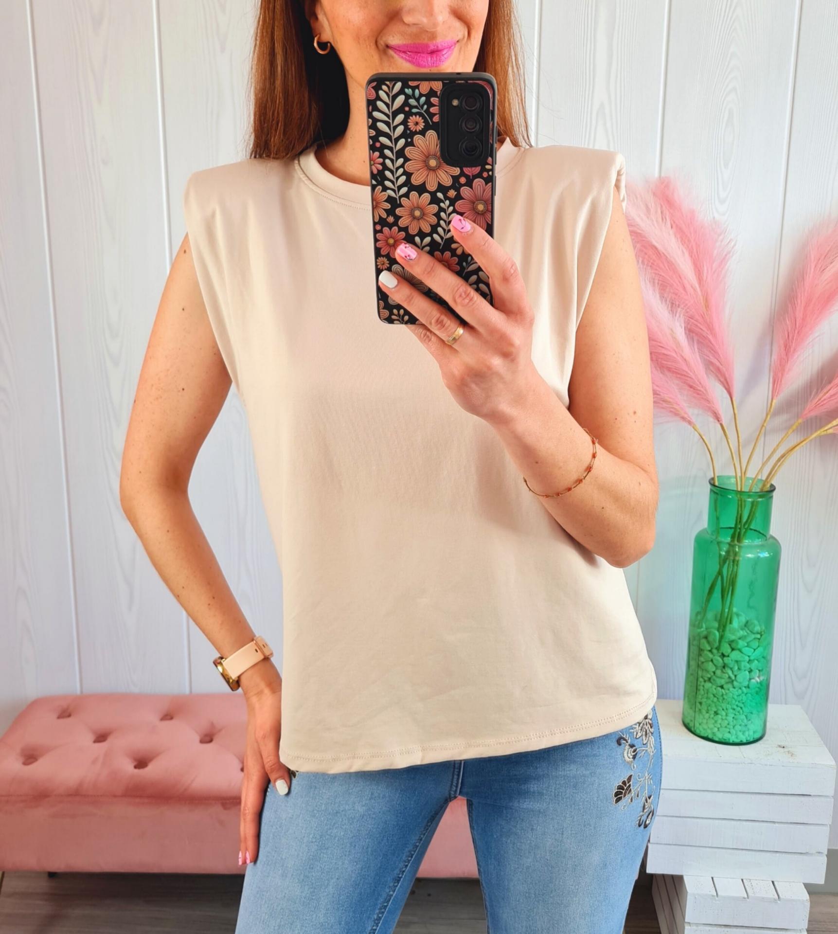 Camiseta de color beige, cuello redondo y manga en sisa con hombreras.