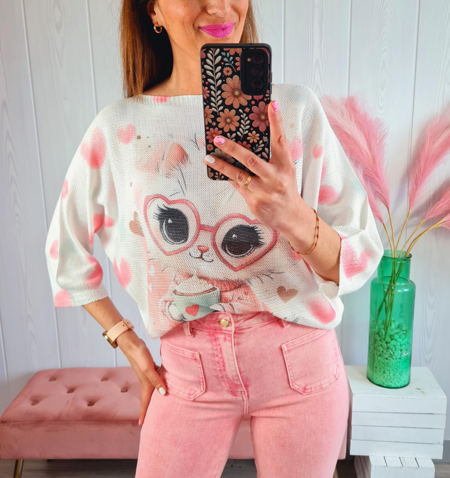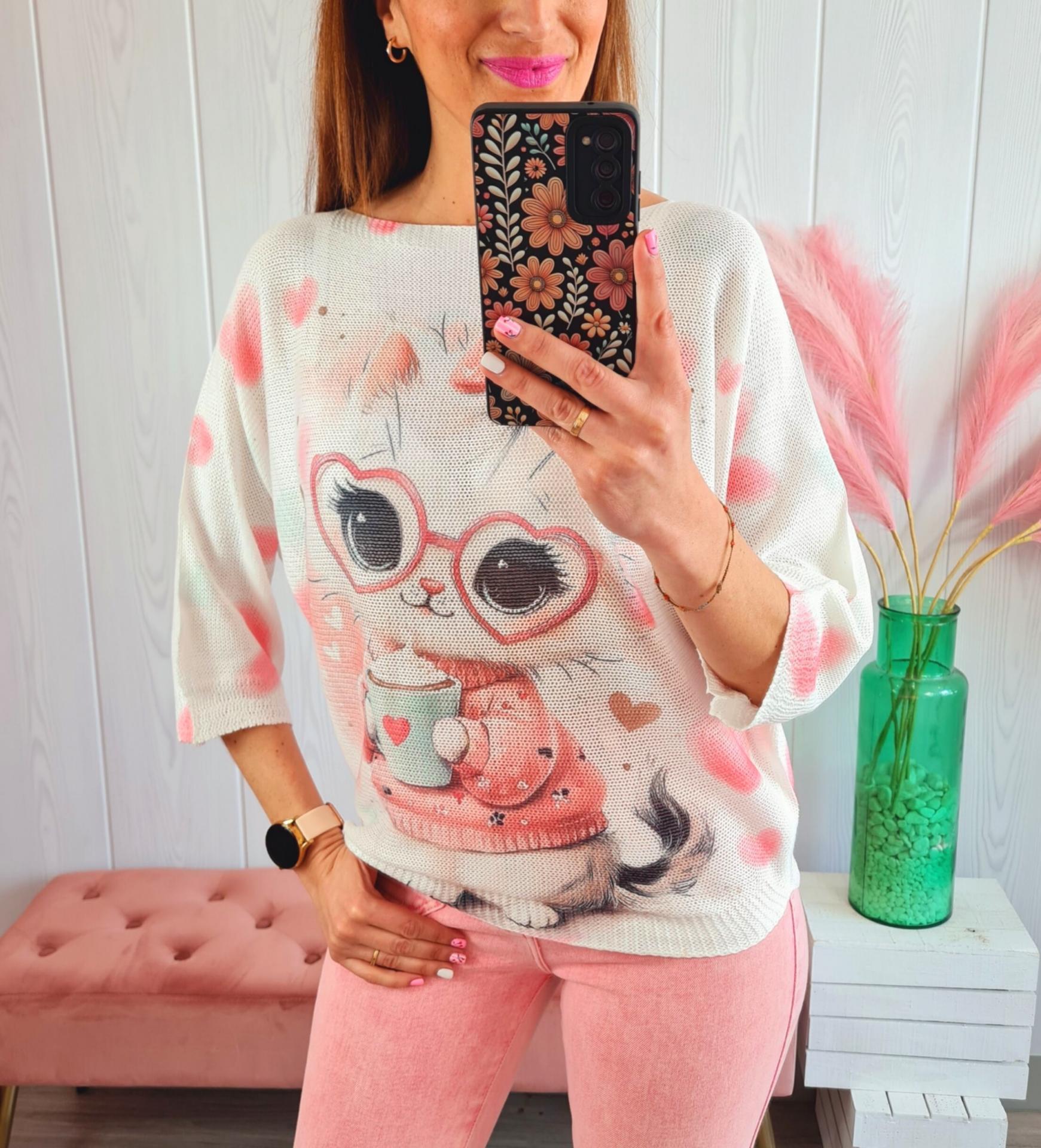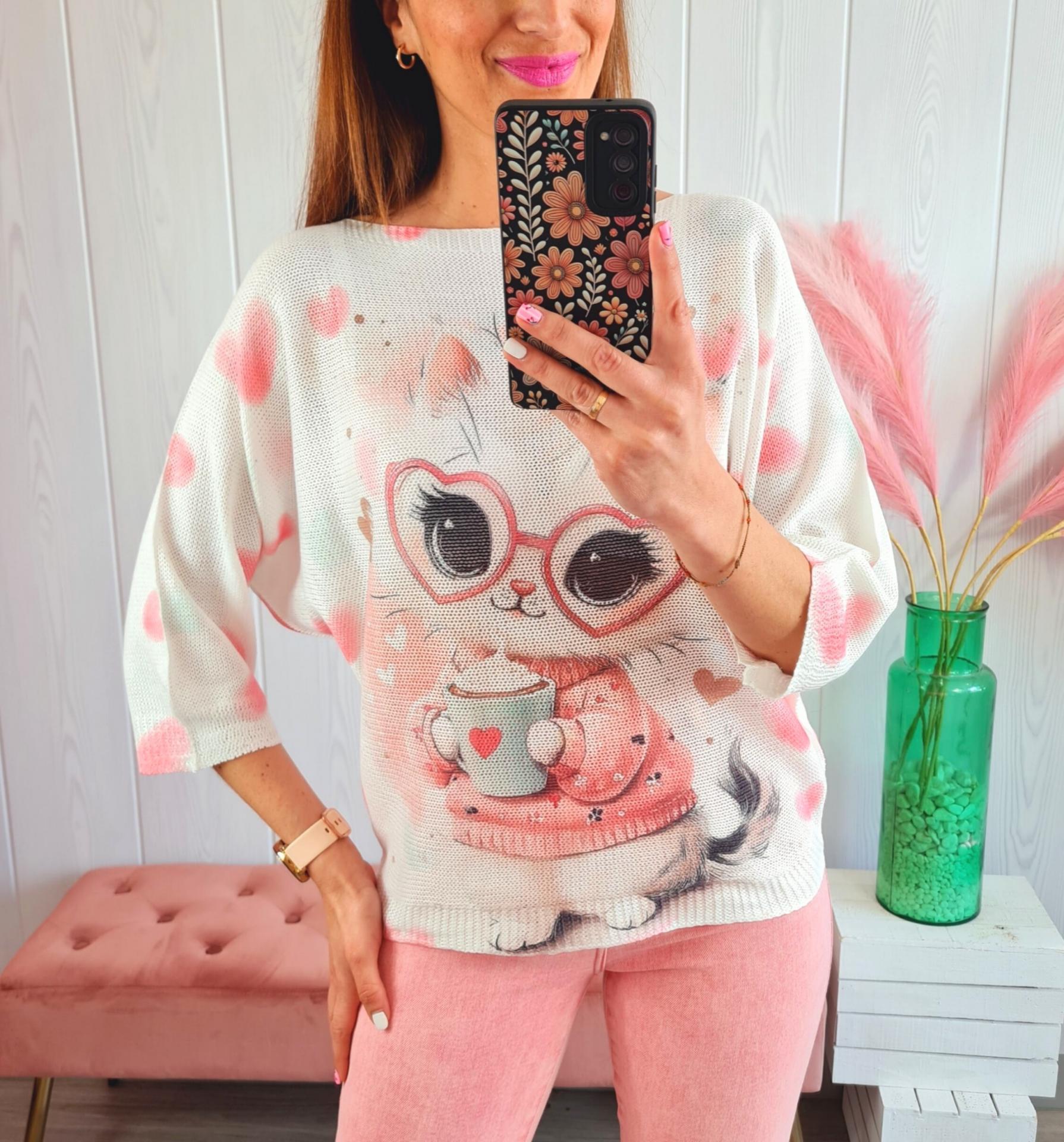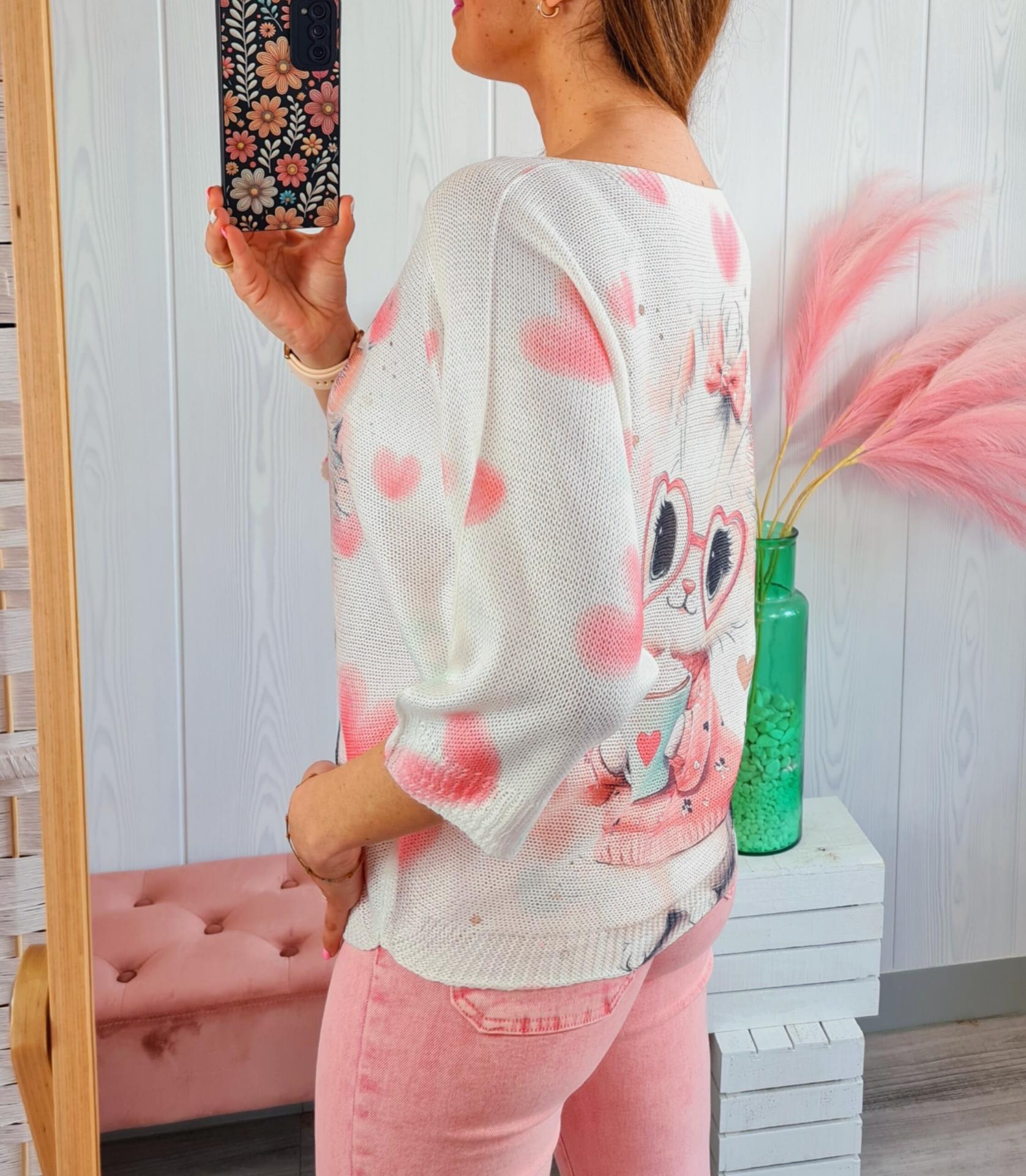 Suéter de hilo oversize, cuello recto y manga 3/4.