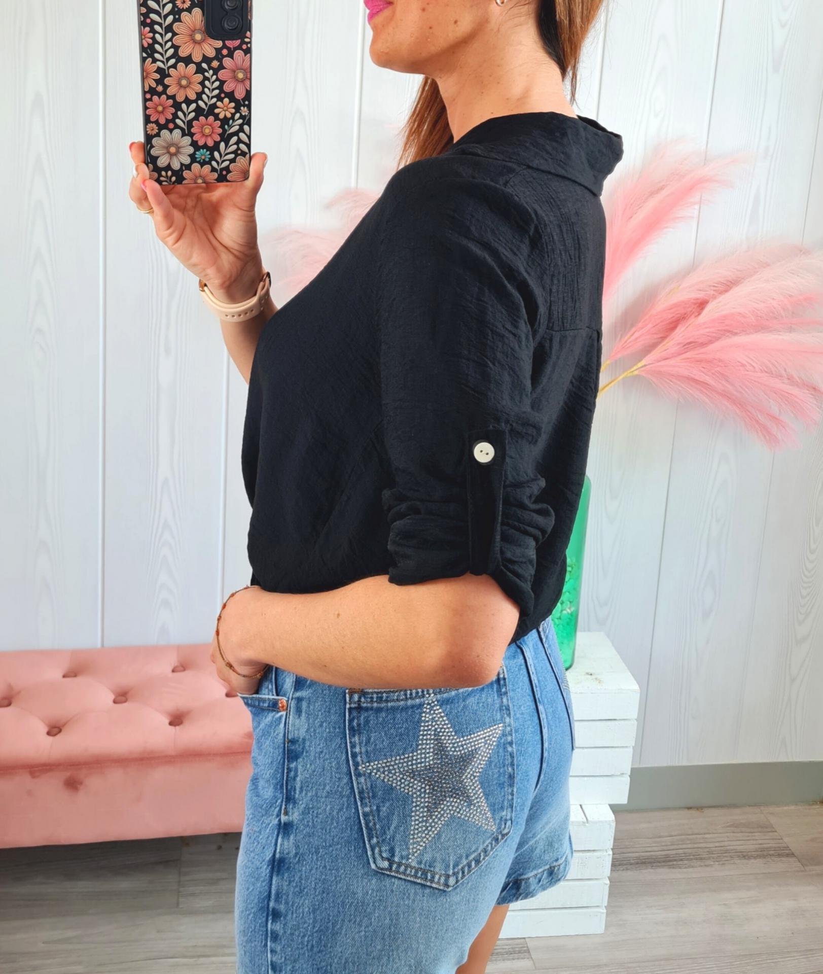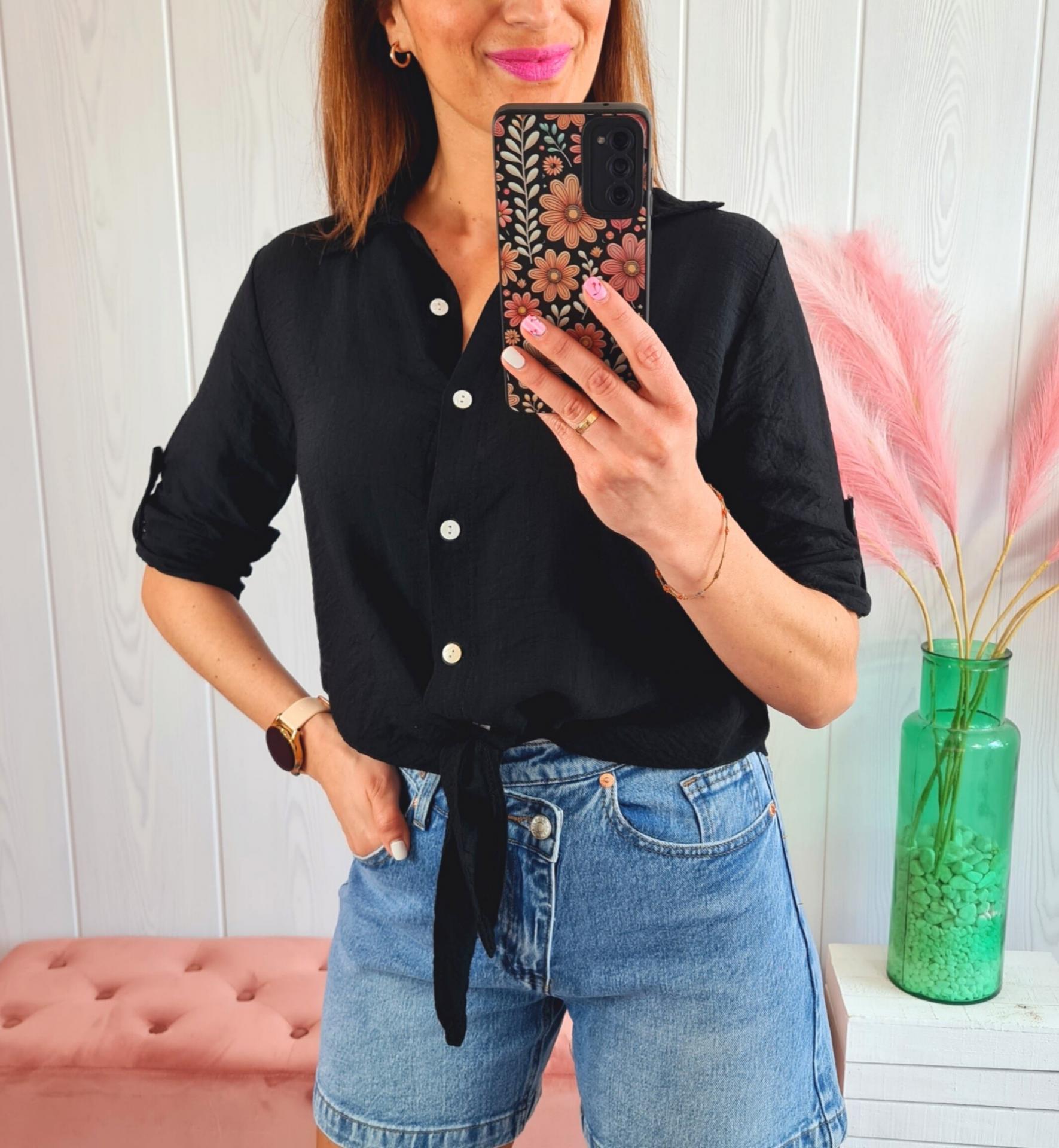 Camisa en color negra, con manga 3/4, se abrocha con botones en la parte delantera y se puede llevar con nudo o normal.