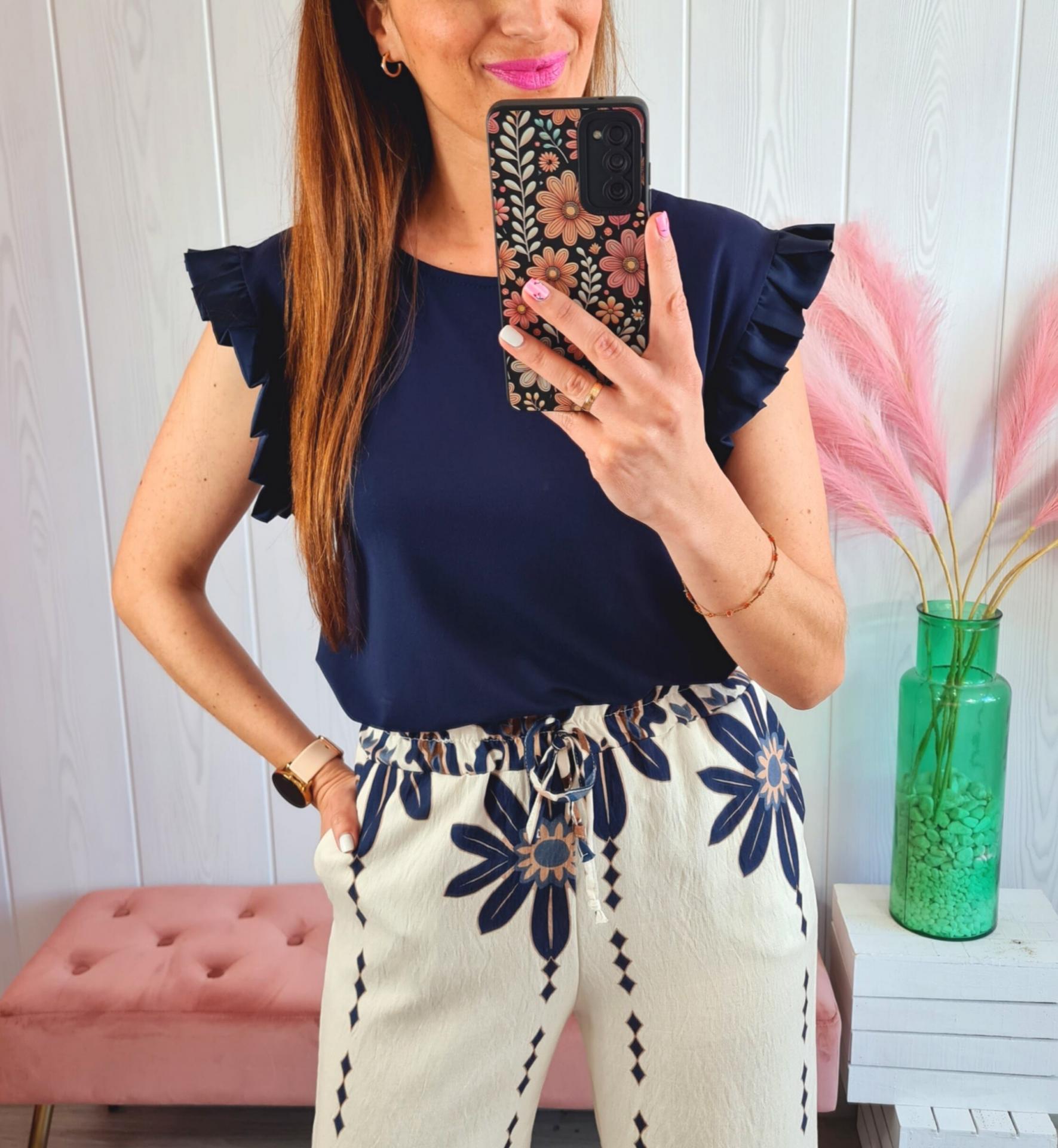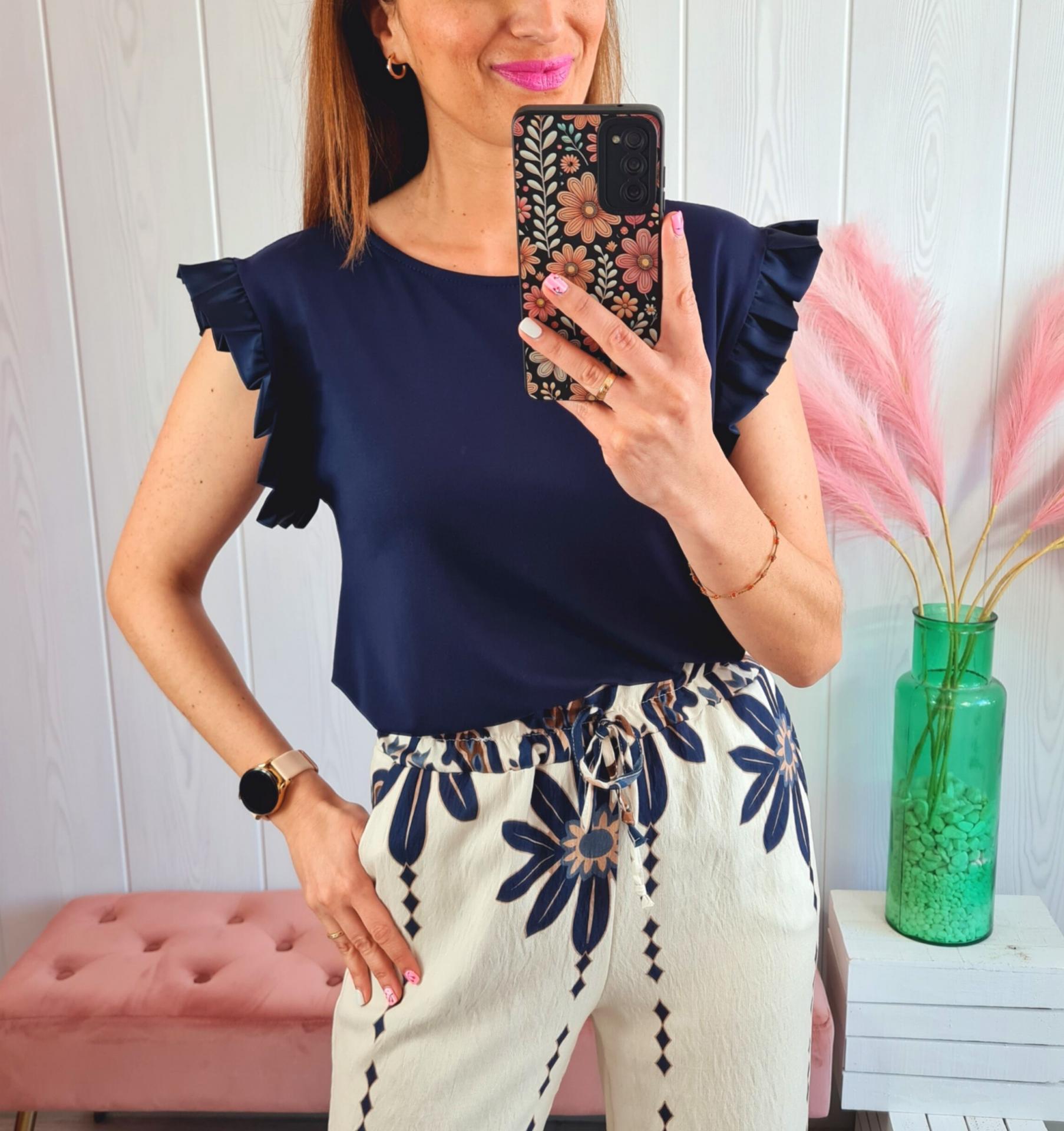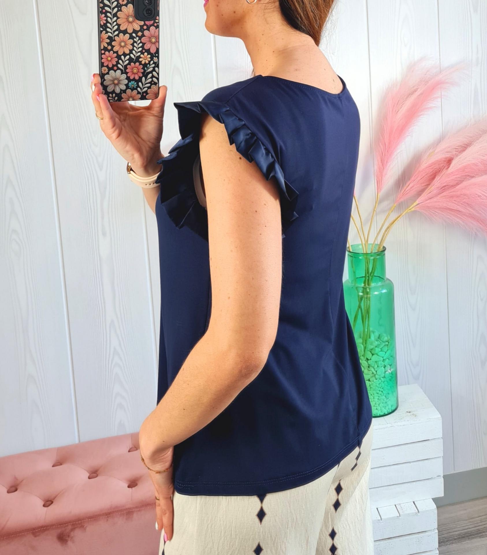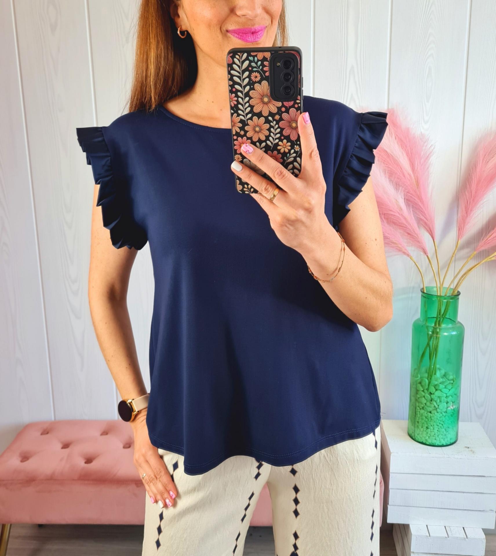 Camiseta de color azul marino, con cuello redondo y manga en sisa con volante de adorno.