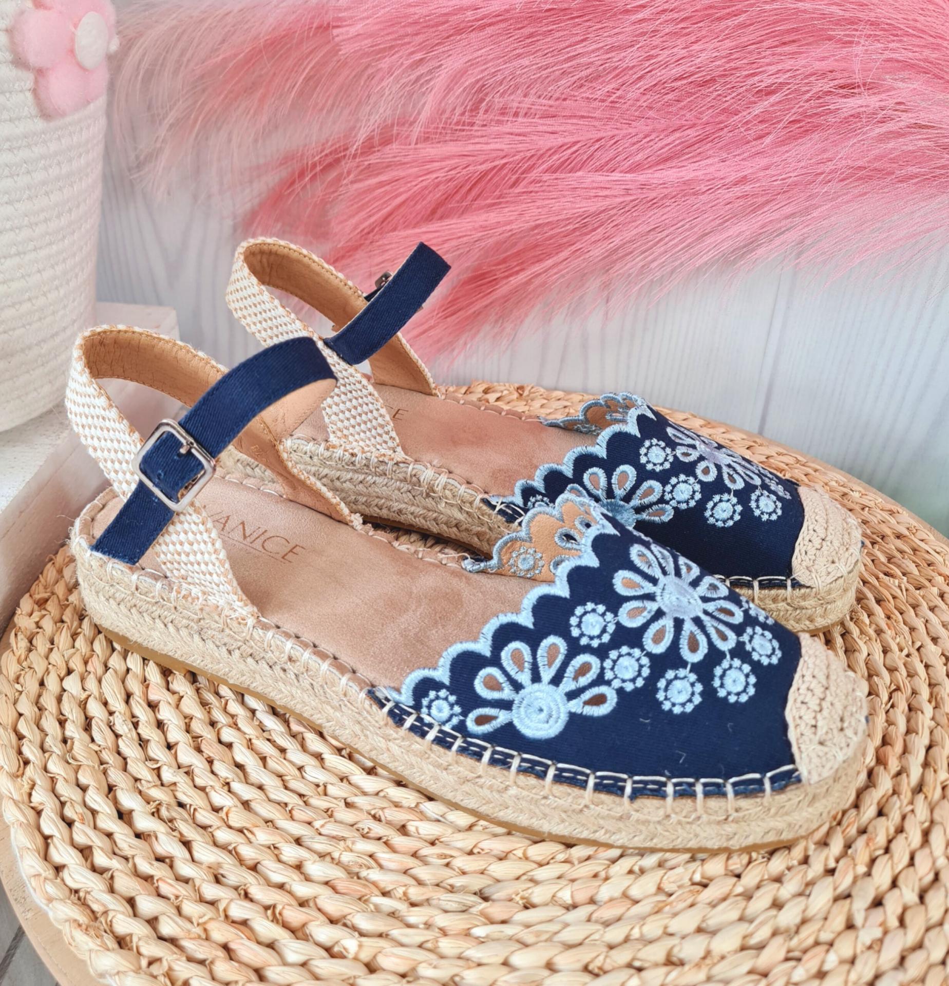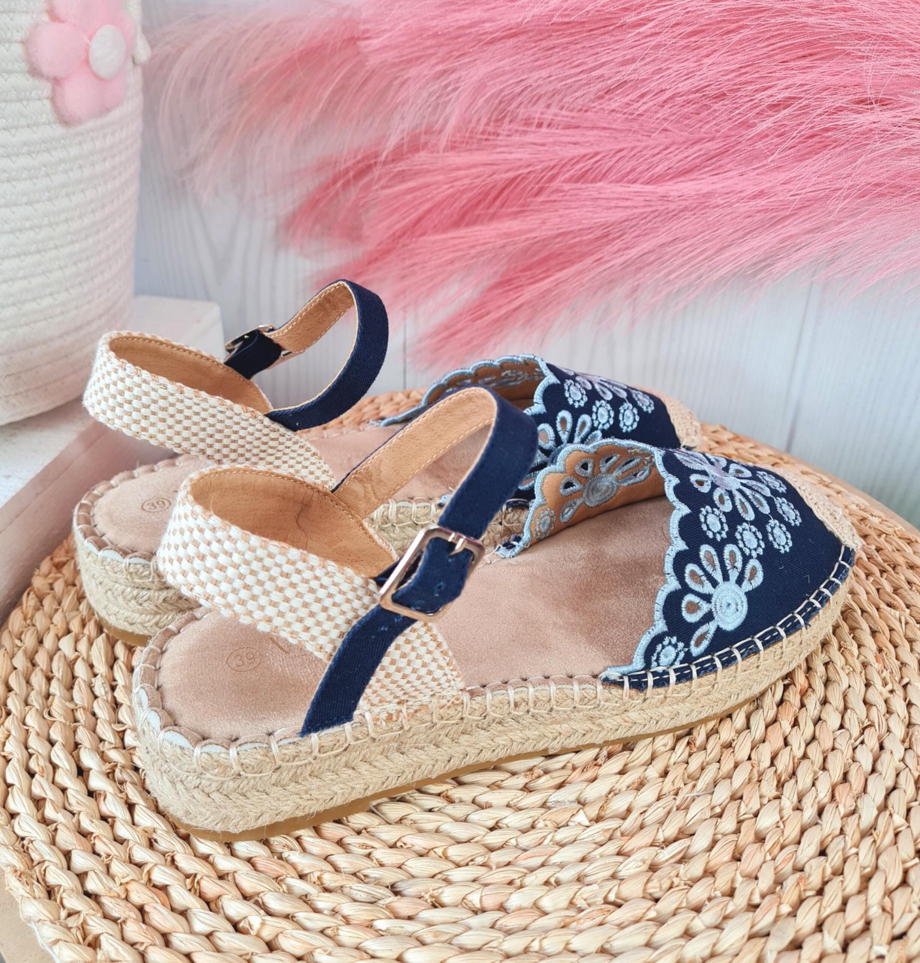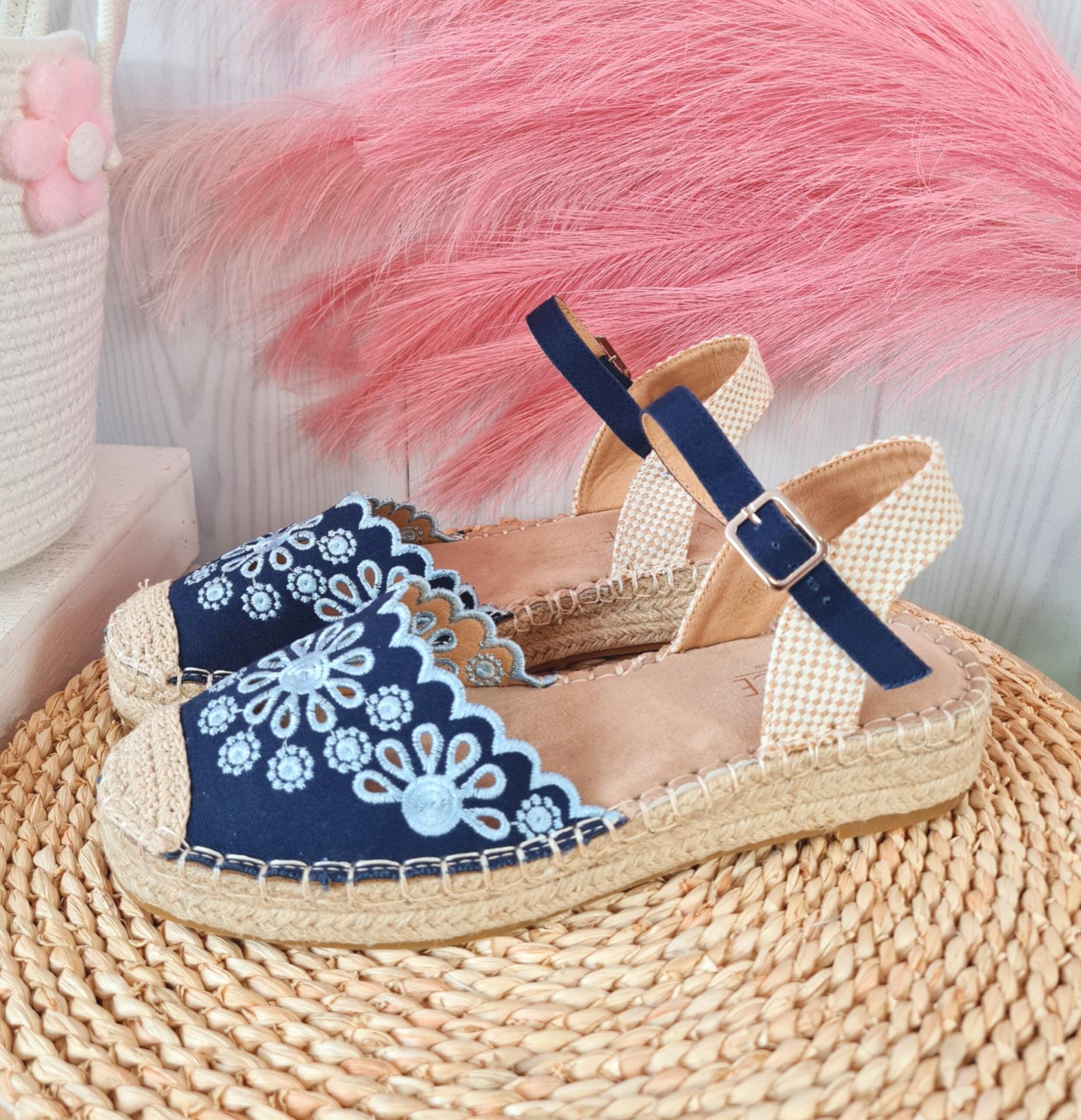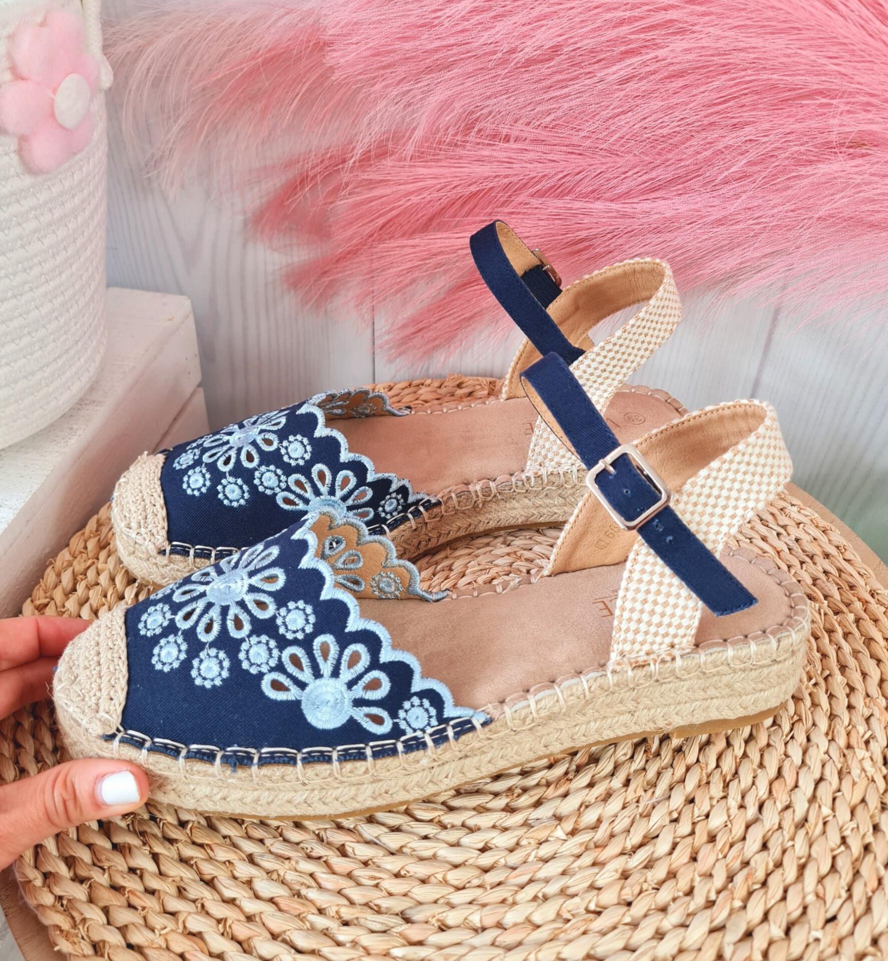 Espardeñas en color azul marino con bordados, sujetas al tobillo mediante hebilla.