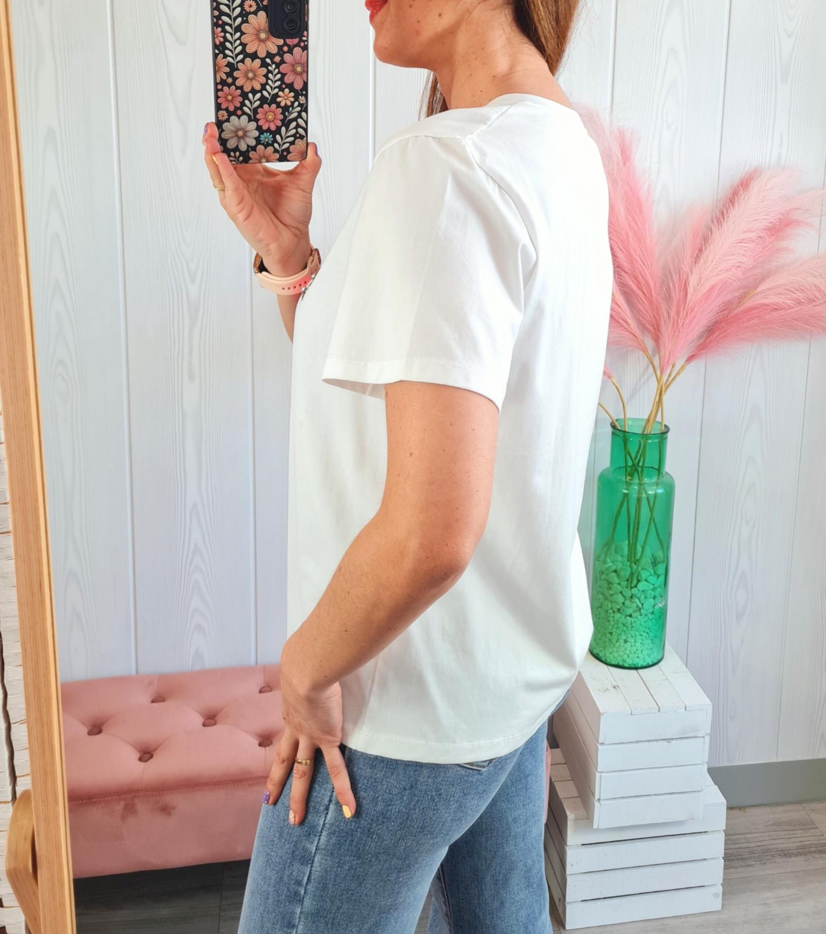 Camiseta de color blanca con estampado impreso de calavera en tonos marrones y rosas y terminaciones de brillantitos. Tiene cuello redondo y manga larga.