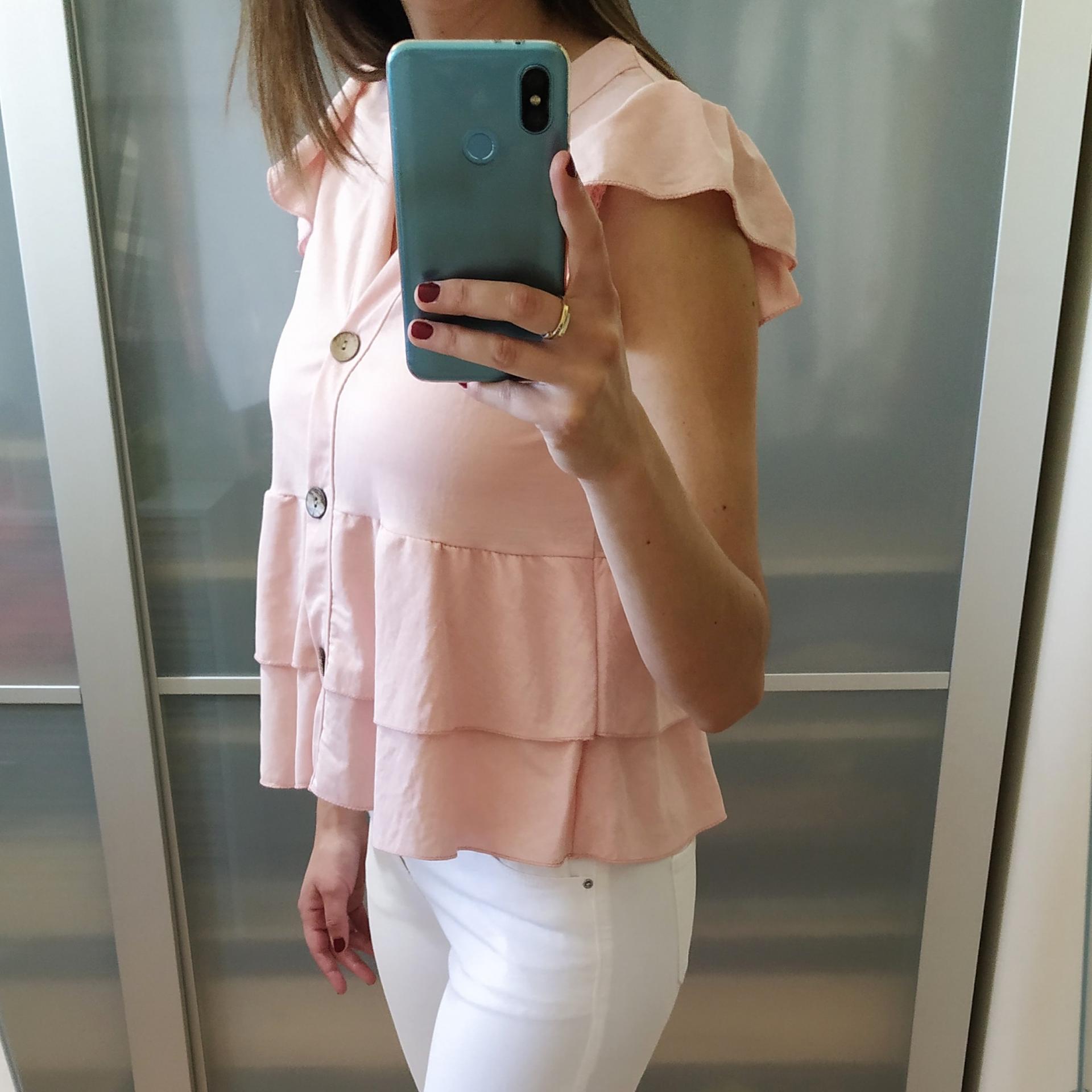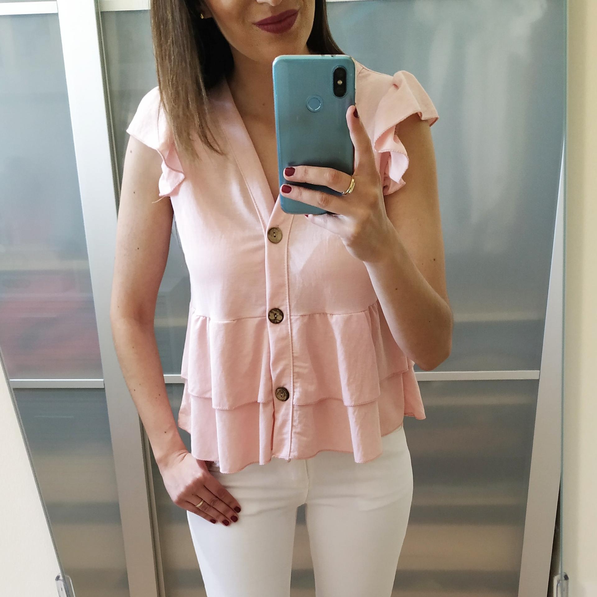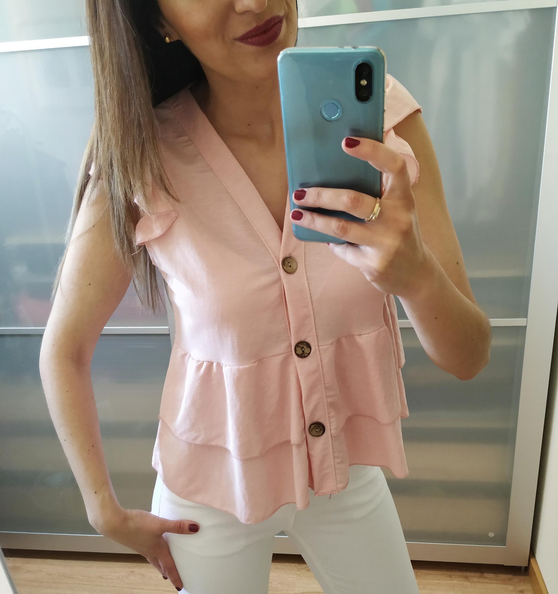 Blusa de color rosa con cuello en V . Tiene botones delanteros y volantes en sisas y en bajo