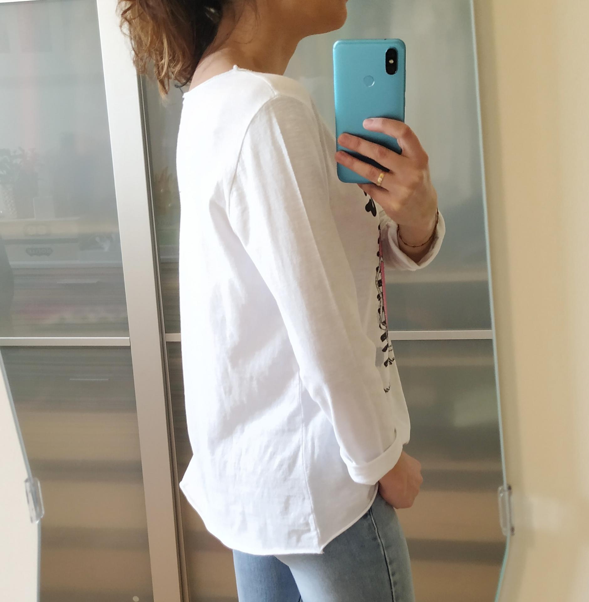 Camiseta de color blanco con estampado impreso, tiene cuello redondo y manga larga.