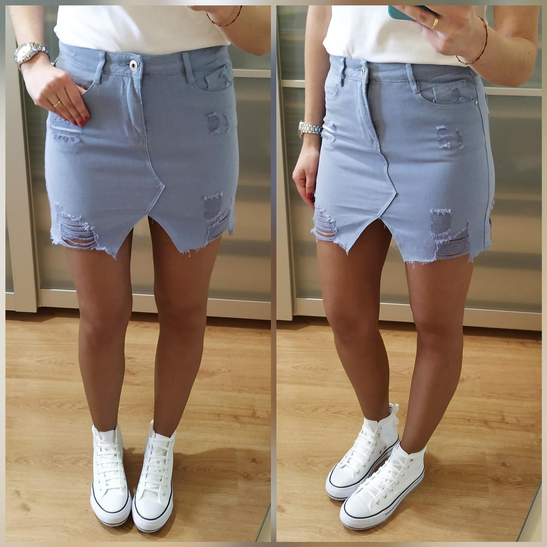 Falda mini lisa de color azul celeste con bolsillos laterales, cierre con botón y cremallera, bajo desflecado y rotos de adorno.