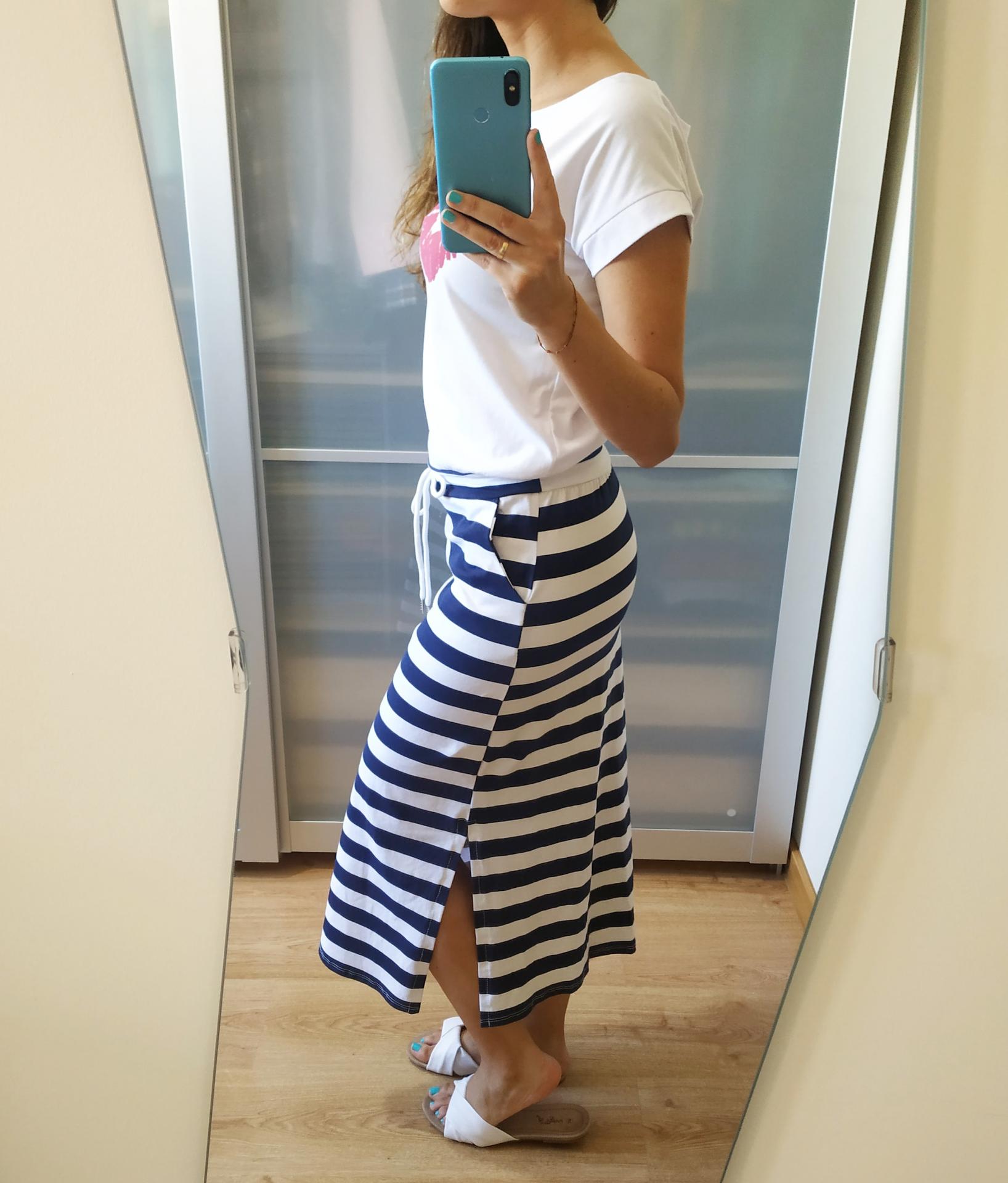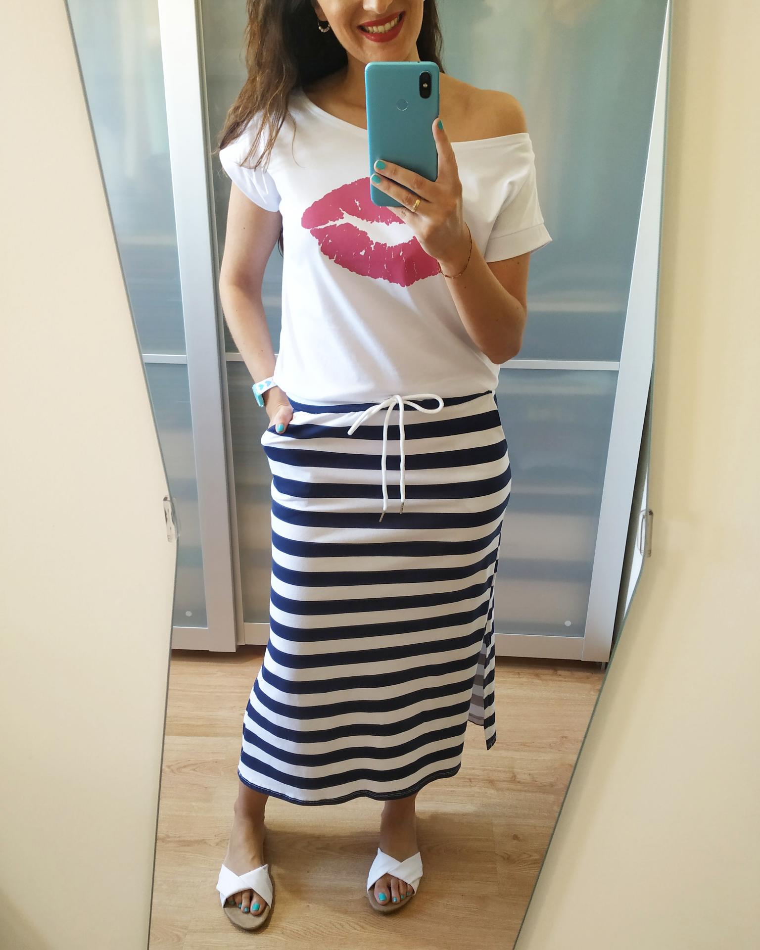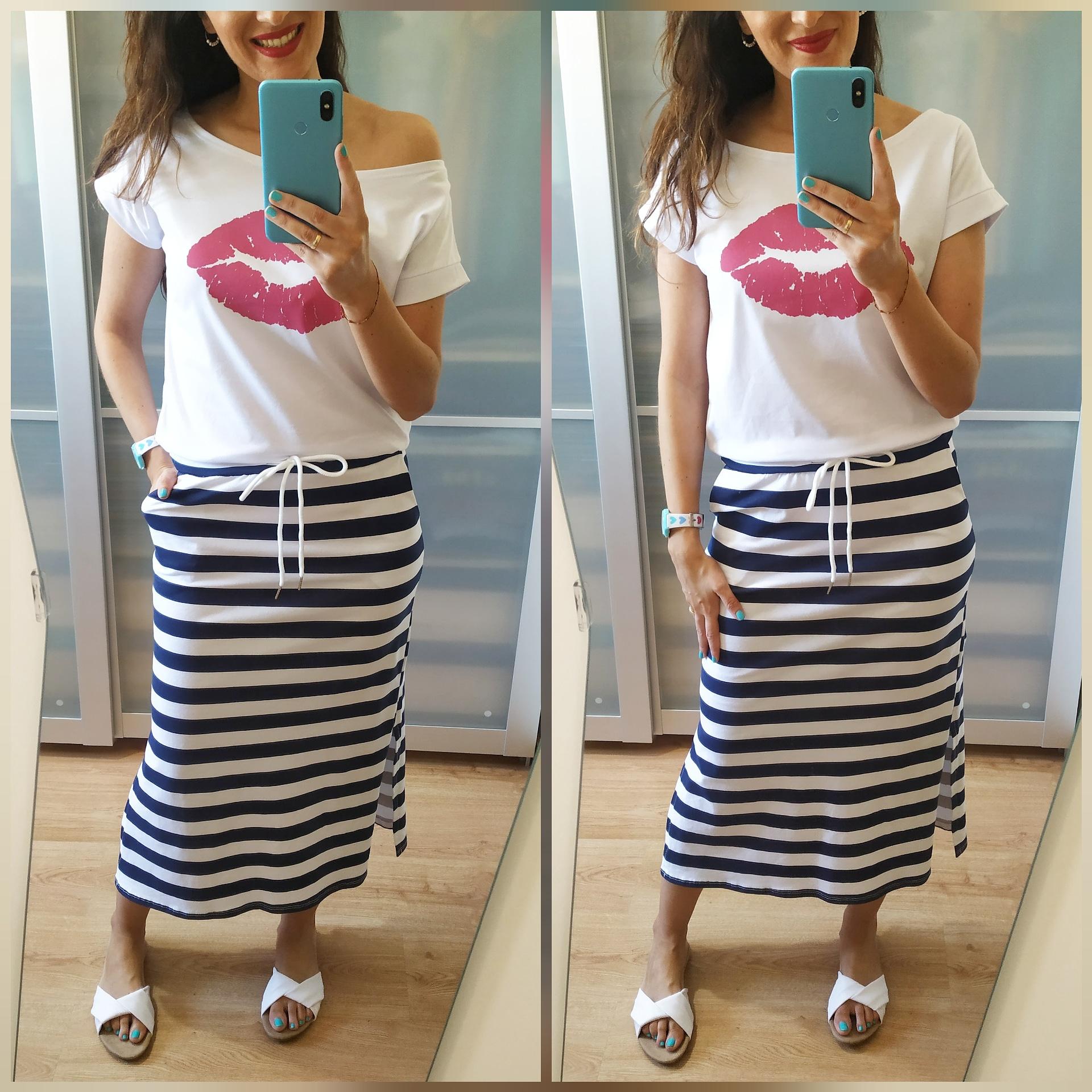 Vestido largo combinado, la parte de abajo de rayas blancas y azul marino y la de arriba de color blanco con unos labios en color rosa. Tiene un lazo de cordón de adorno a la altura de la cadera y la falda tiene rajas en los laterales.