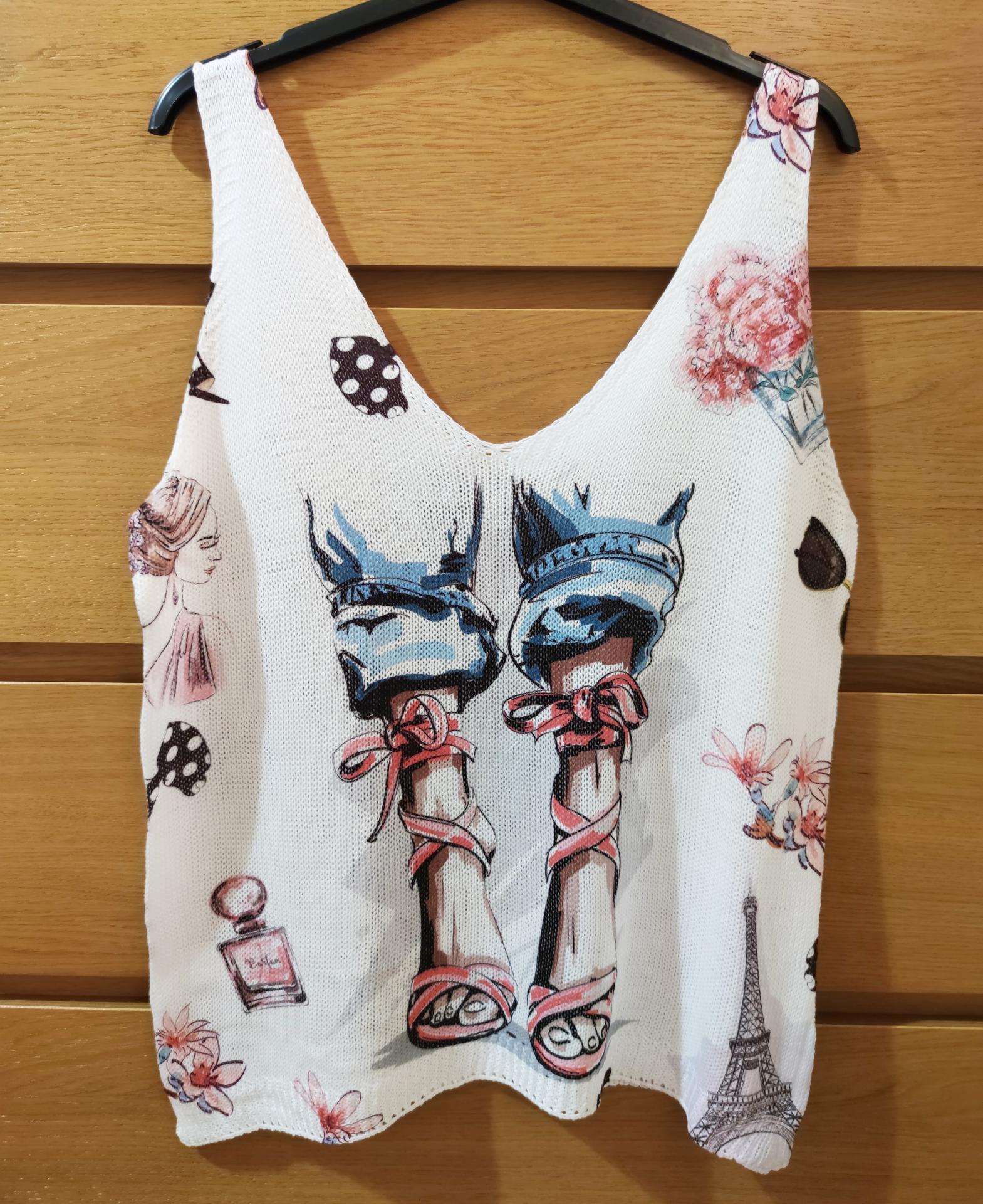 Top de hilo con estampado impreso, tiene tirantes y cuello de pico en pecho y espalda.