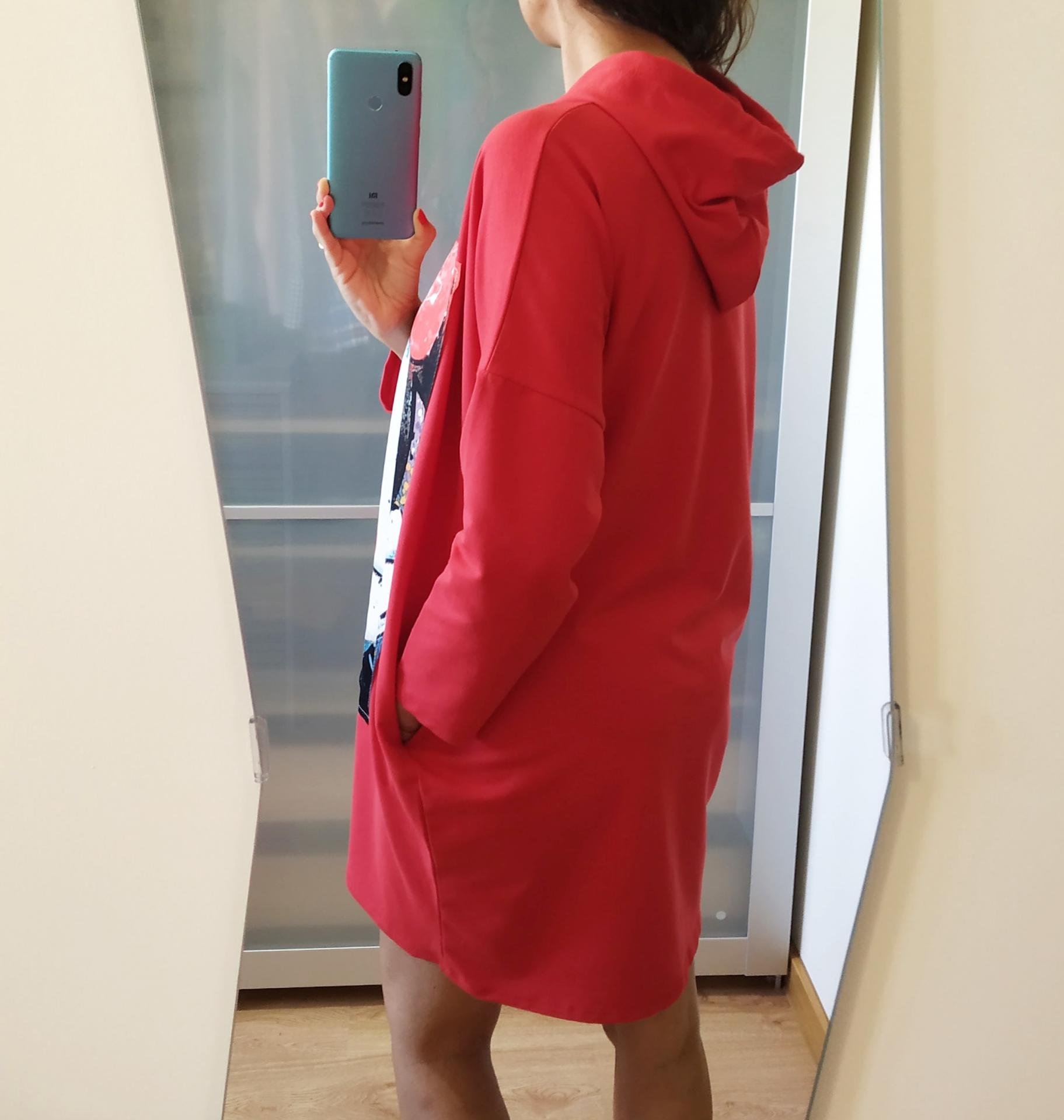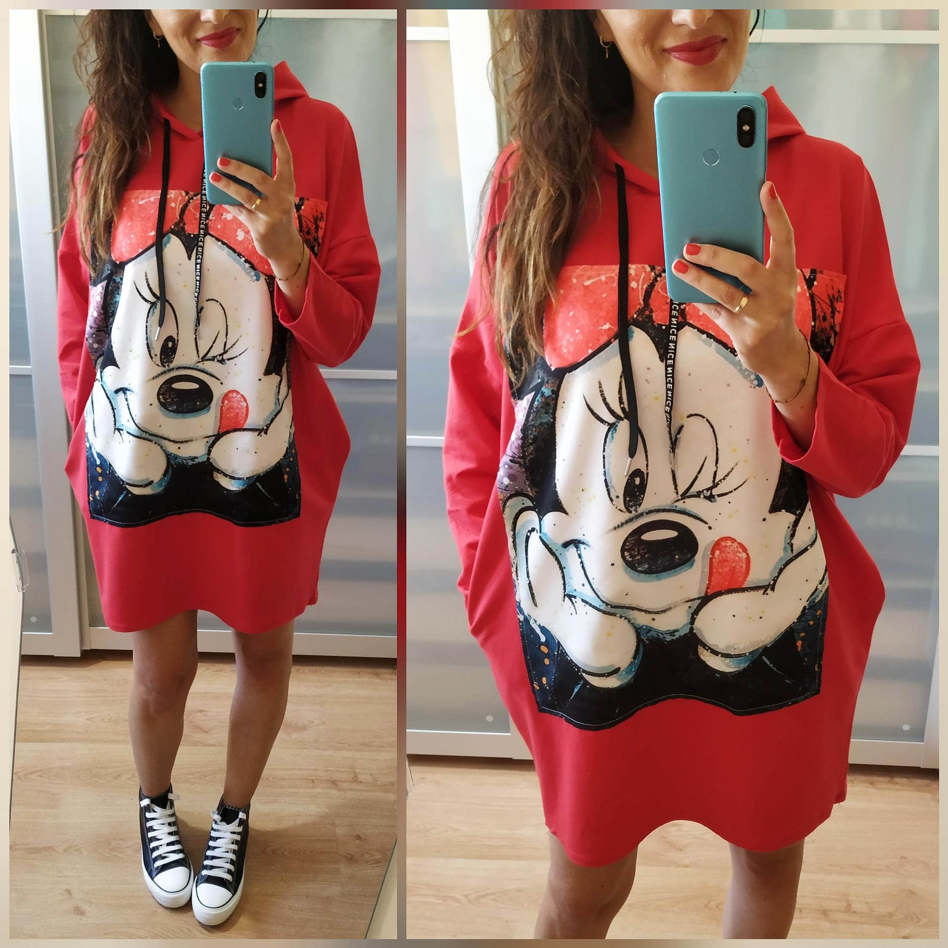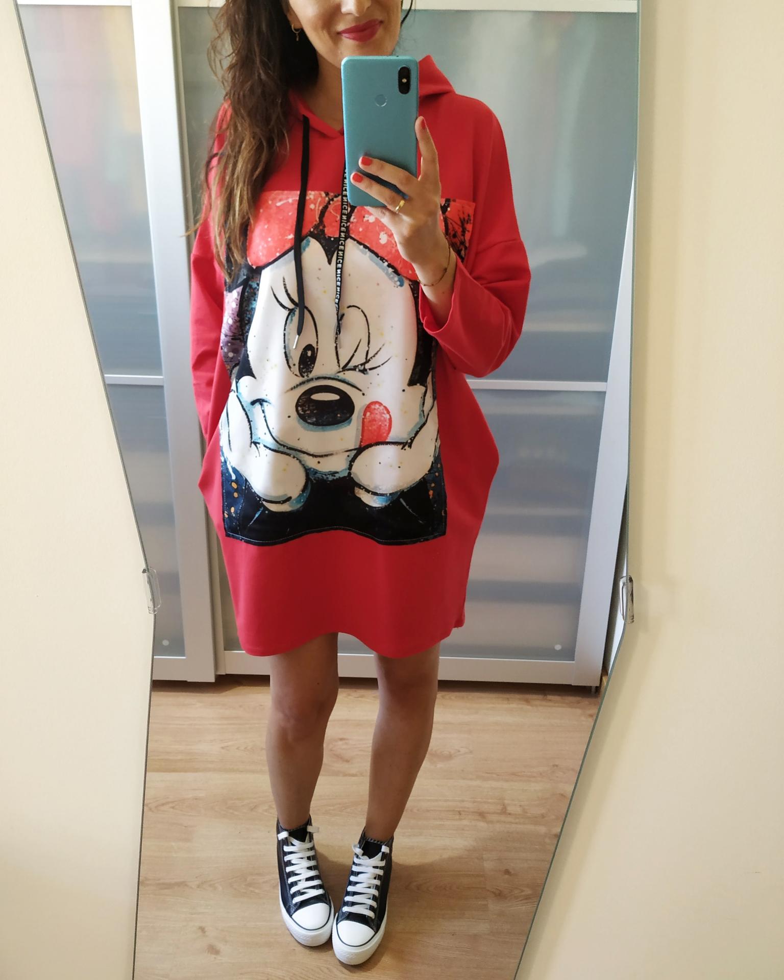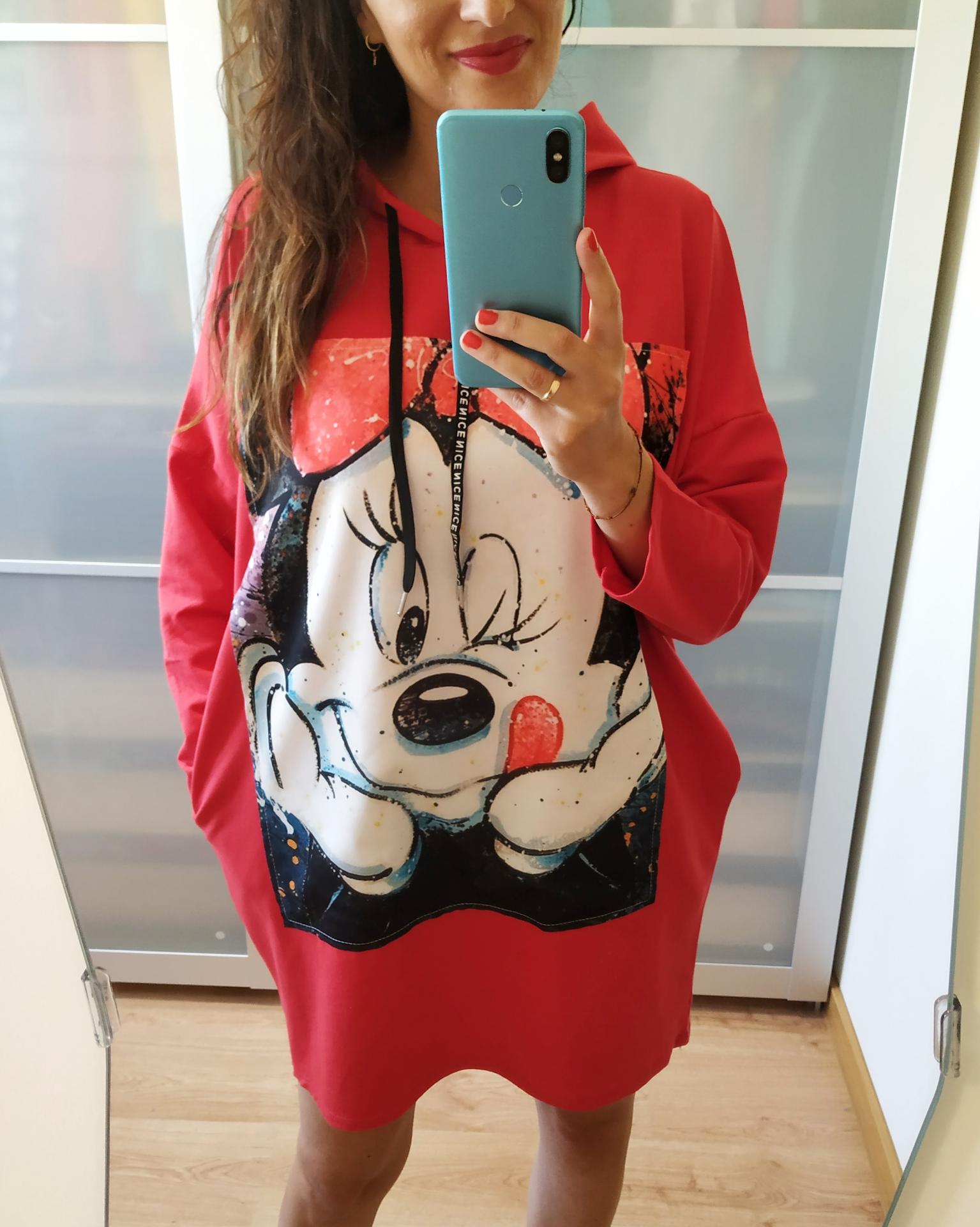 Vestido oversize de tela de sudadera finita, color rojo con parche de Minnie, bolsillos, cuello redondo, manga larga y capucha.