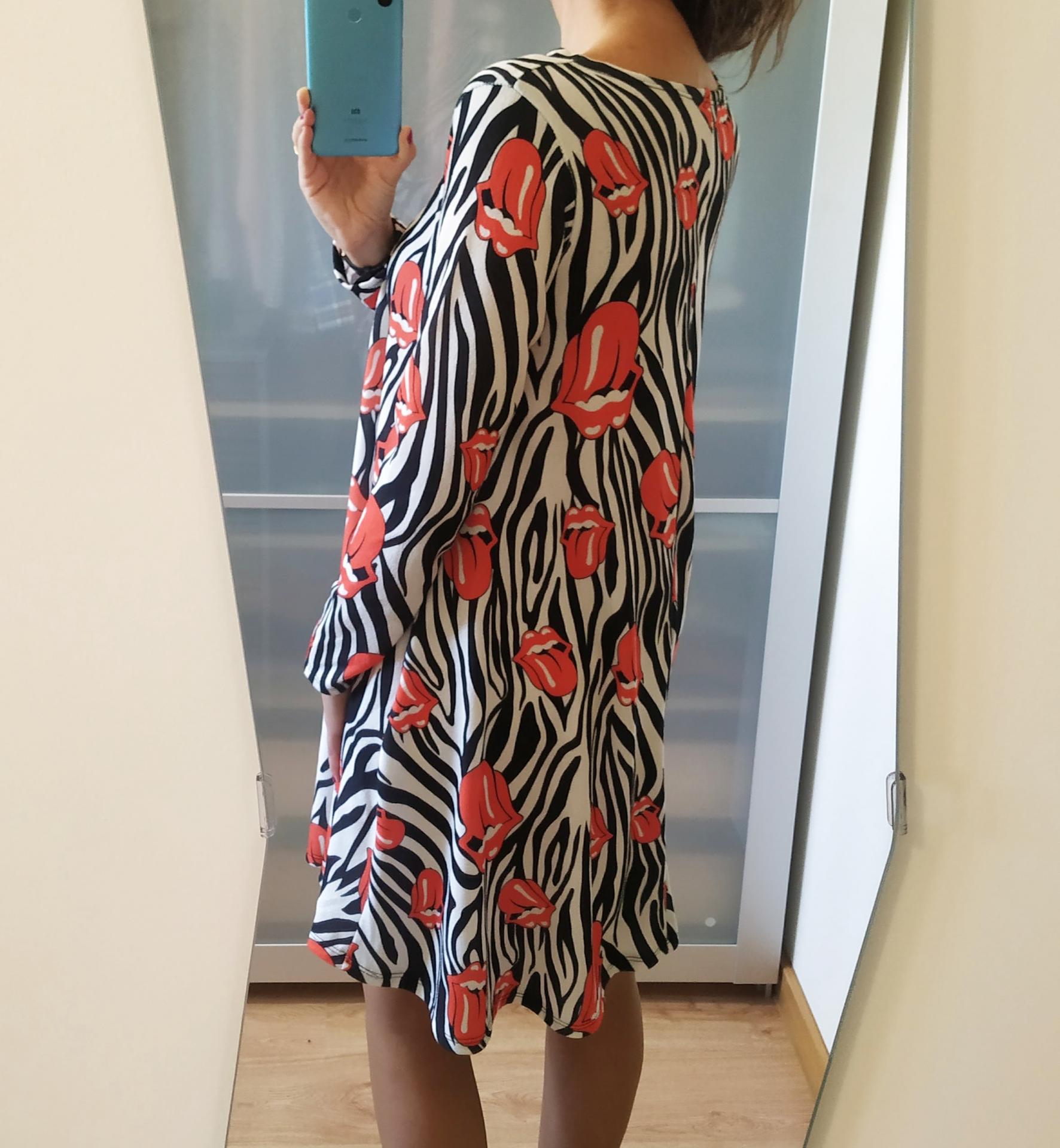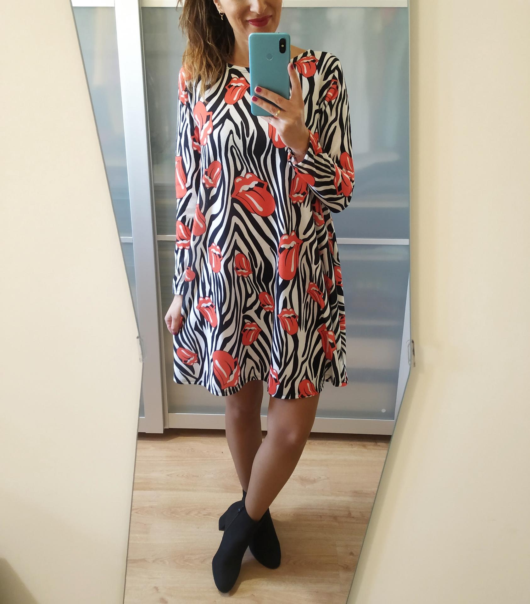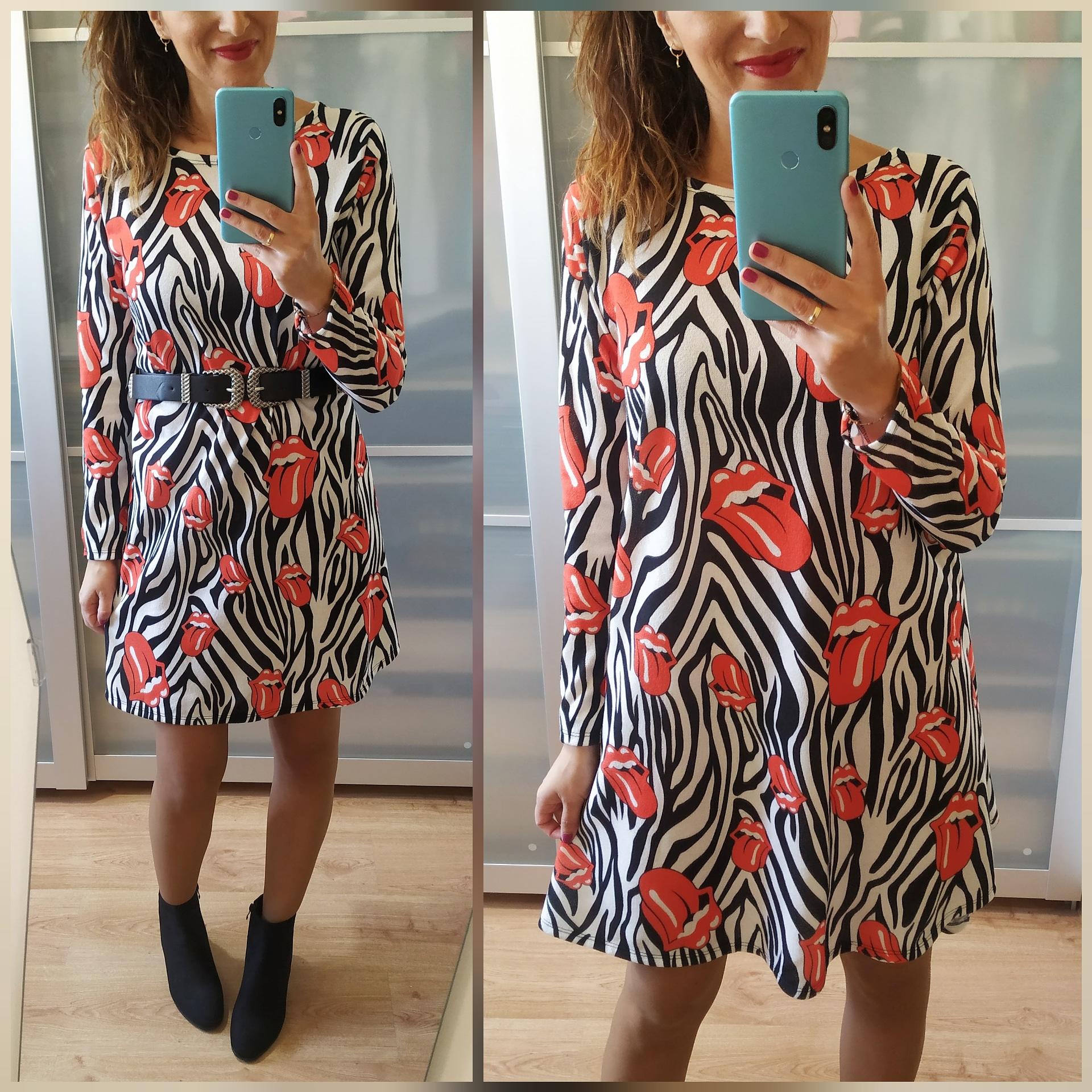 Vestido de color blanco y negro animal print con estampado de Rolling. Tiene manga larga, cuello redondo y corte evasé.