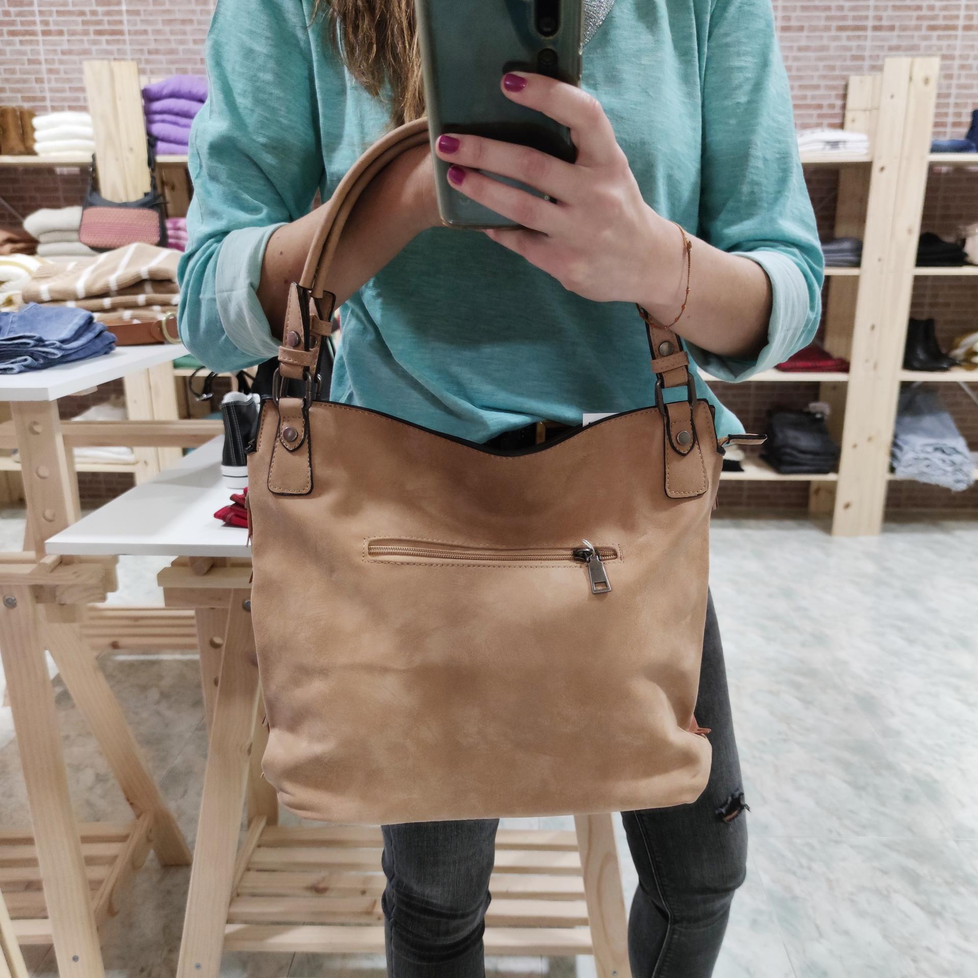 Bolso en tonos tierra con cierre de cremallera, forro interior y bolsillos interiores con cierres de cremallera.