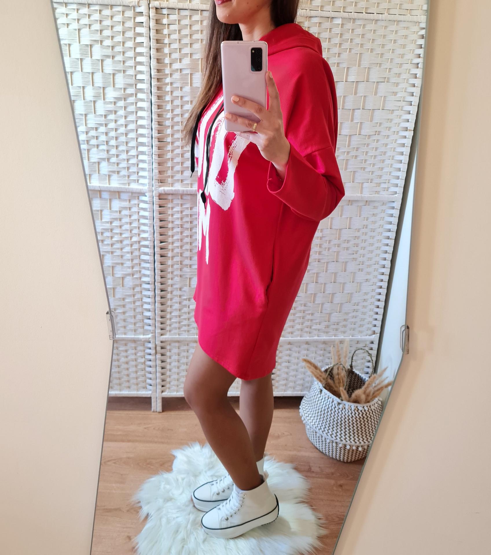 Vestido de sport en color rojo con estampado impreso en negro en el pecho, capucha, bolsillos laterales y manga larga.