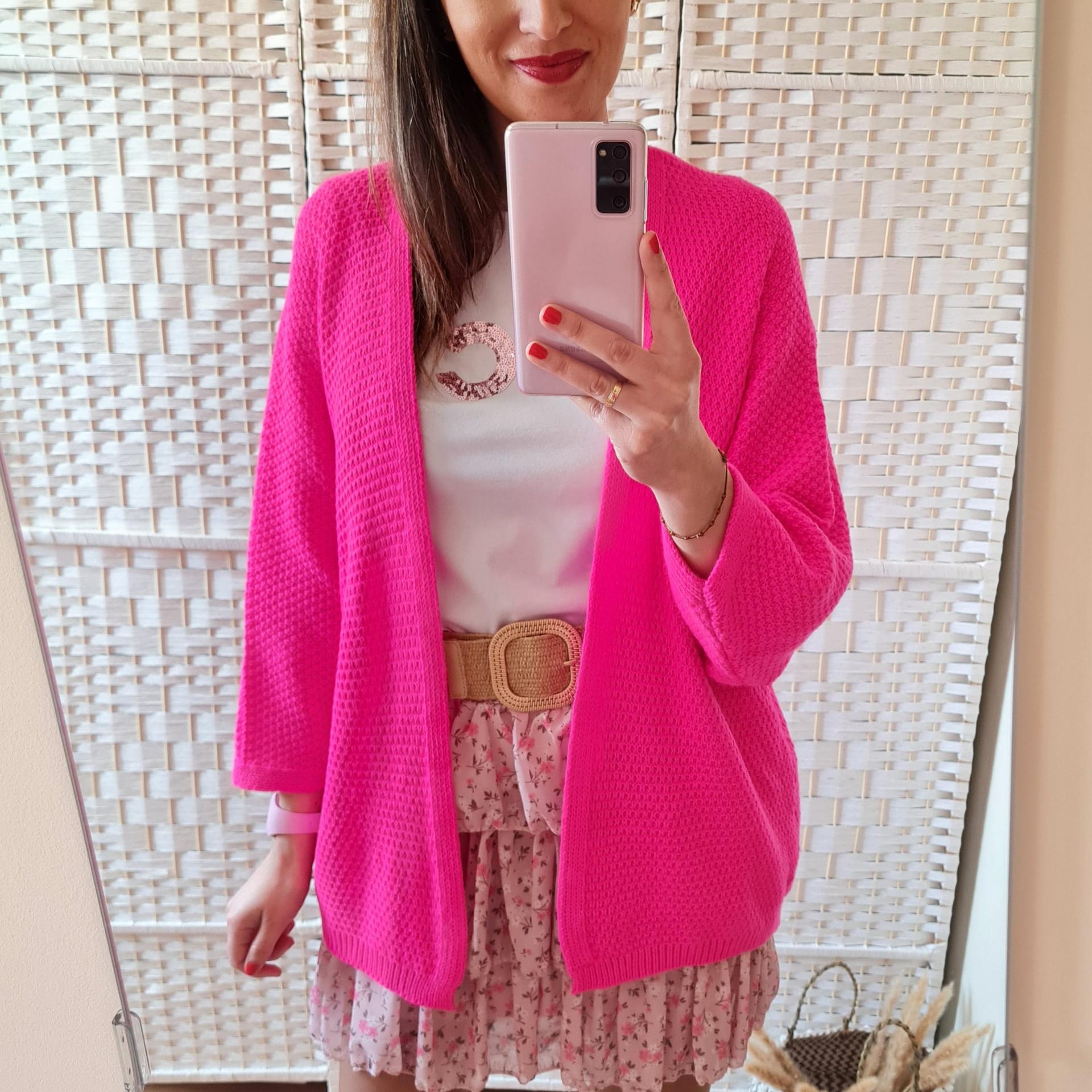 Rebeca de punto color fucsia, sin cierre y manga 3/4.