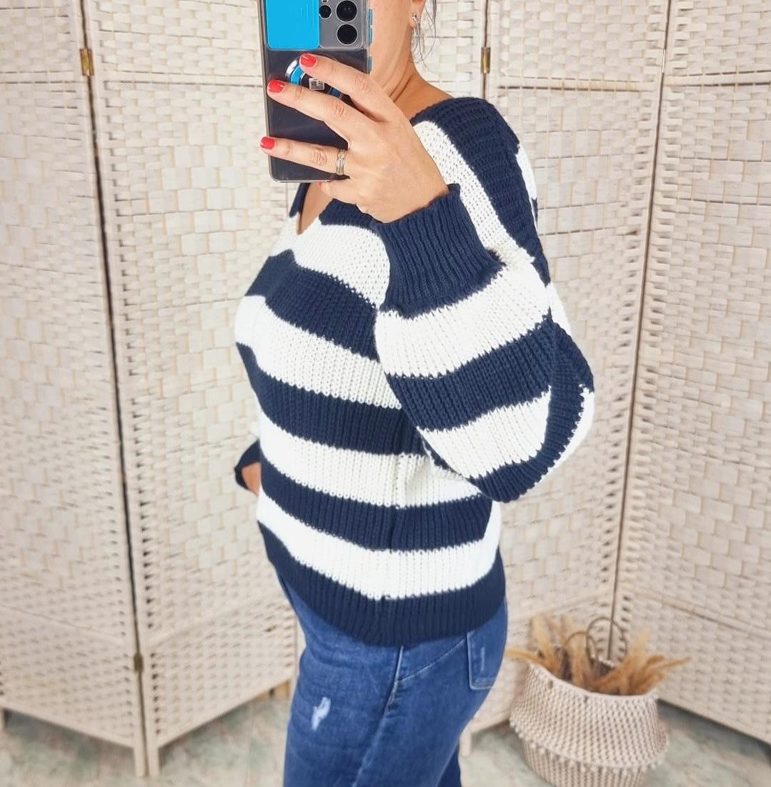 Jersey de rayas en tonos blanco y marino. Tiene cuello de pico y manga larga.
