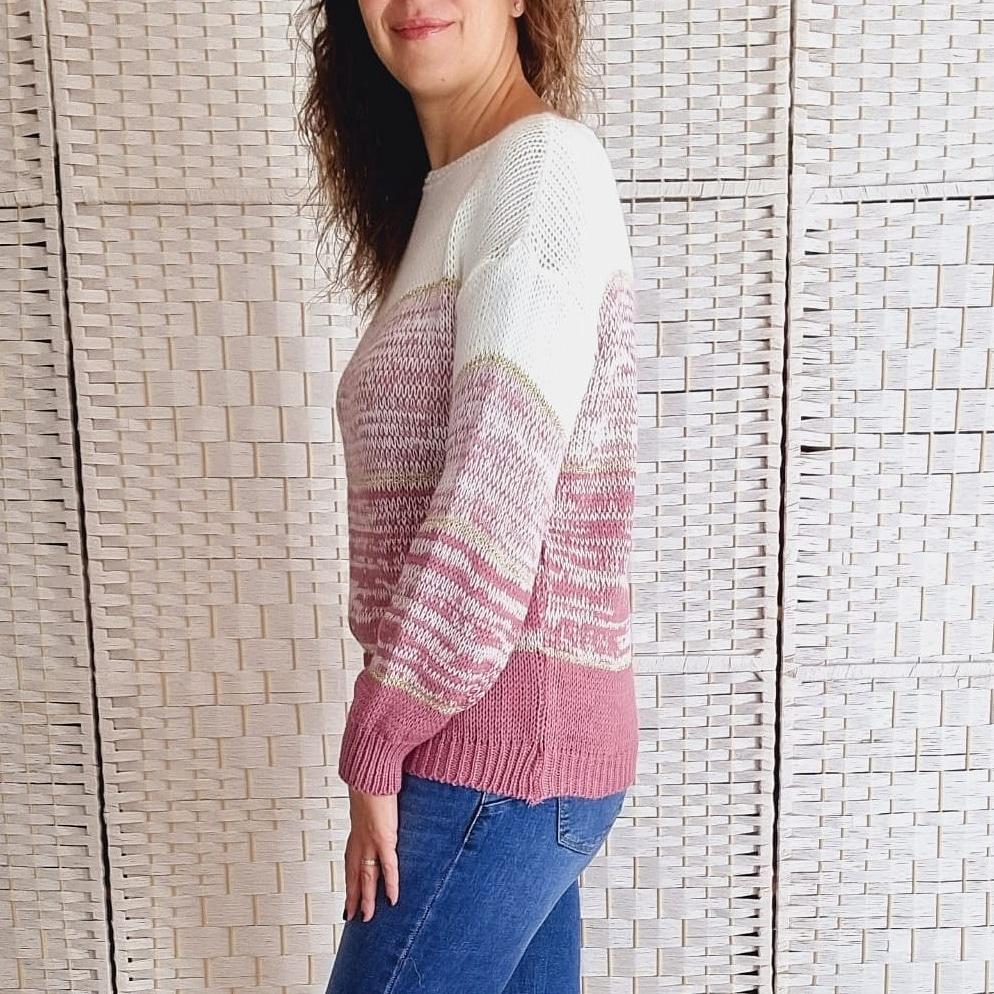 Jersey combinado en rosa y blanco con algún tono dorado. Tiene cuello redondo y manga larga.