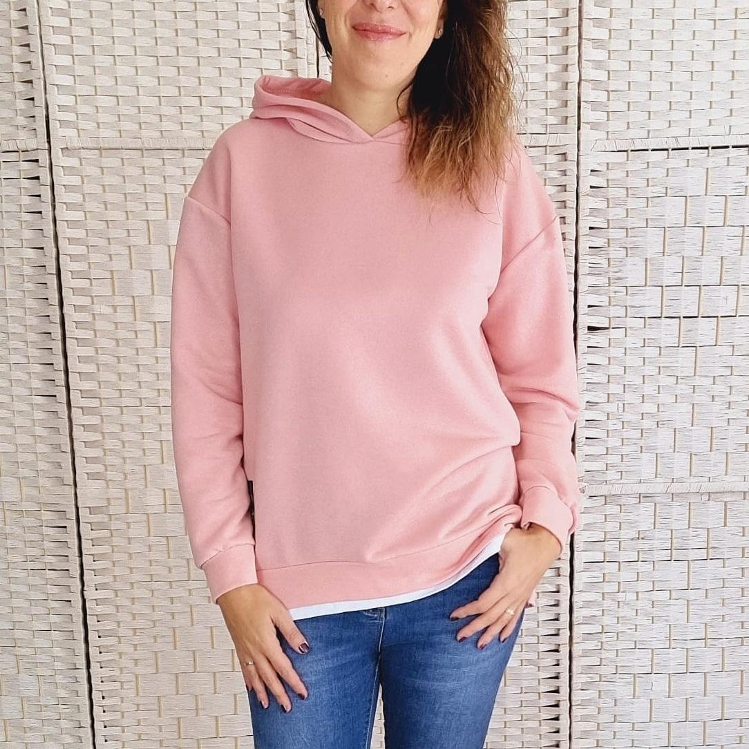 Maxi sudadera de color rosa, manga larga y capucha. Tiene en la parte inferior delantera en color blanco imitación a bajo camisa.
